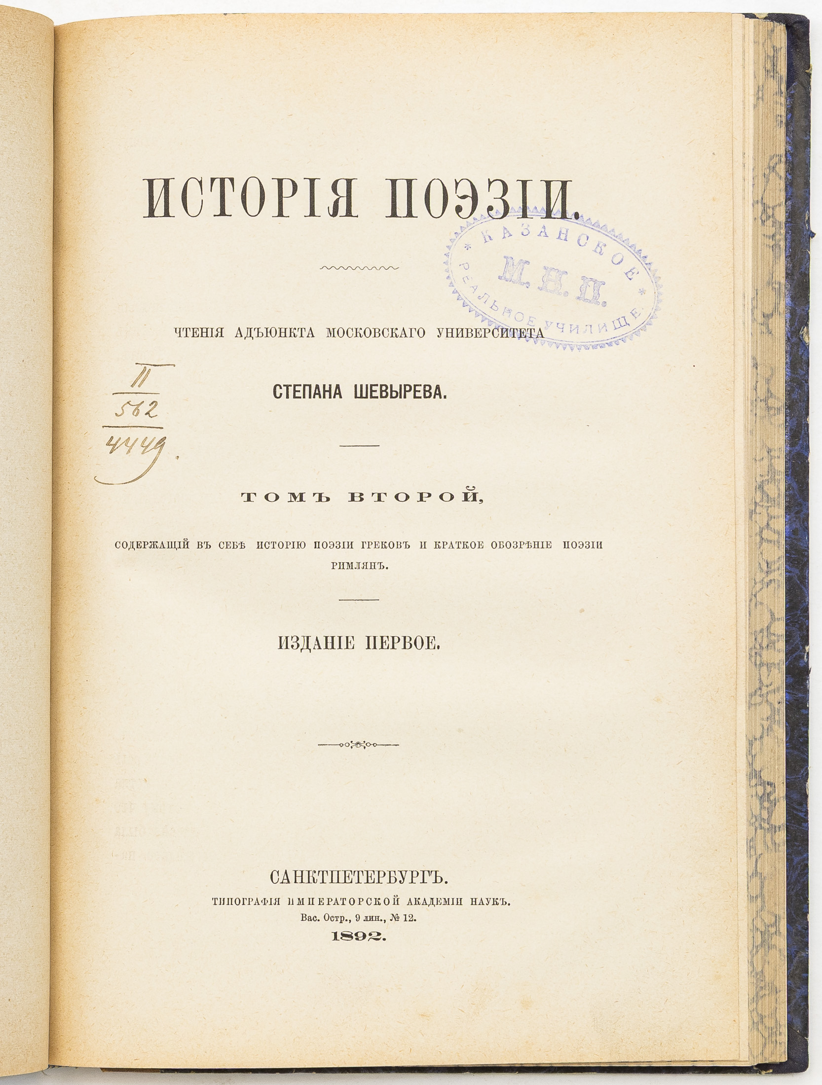 На некоторых листах штампы и пометки Казанского реального училища; штампы и пометки книжных магазинов на нахзаце.