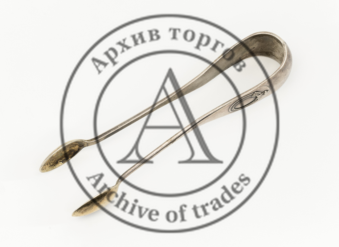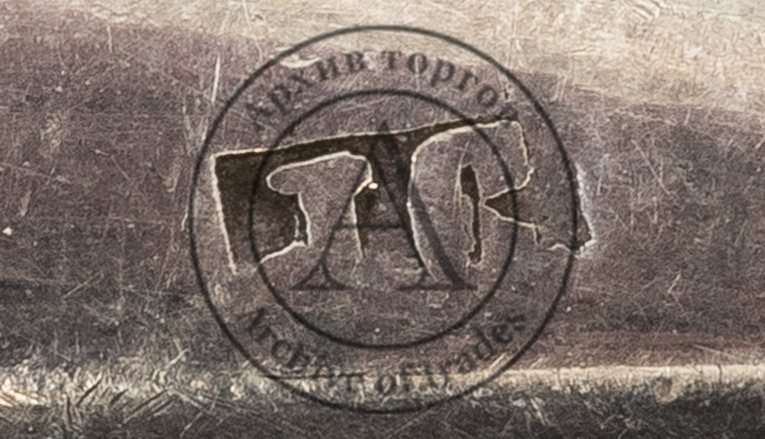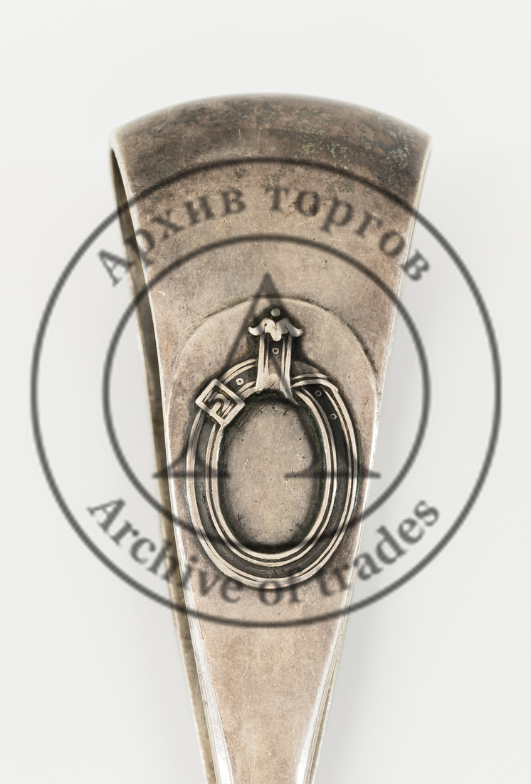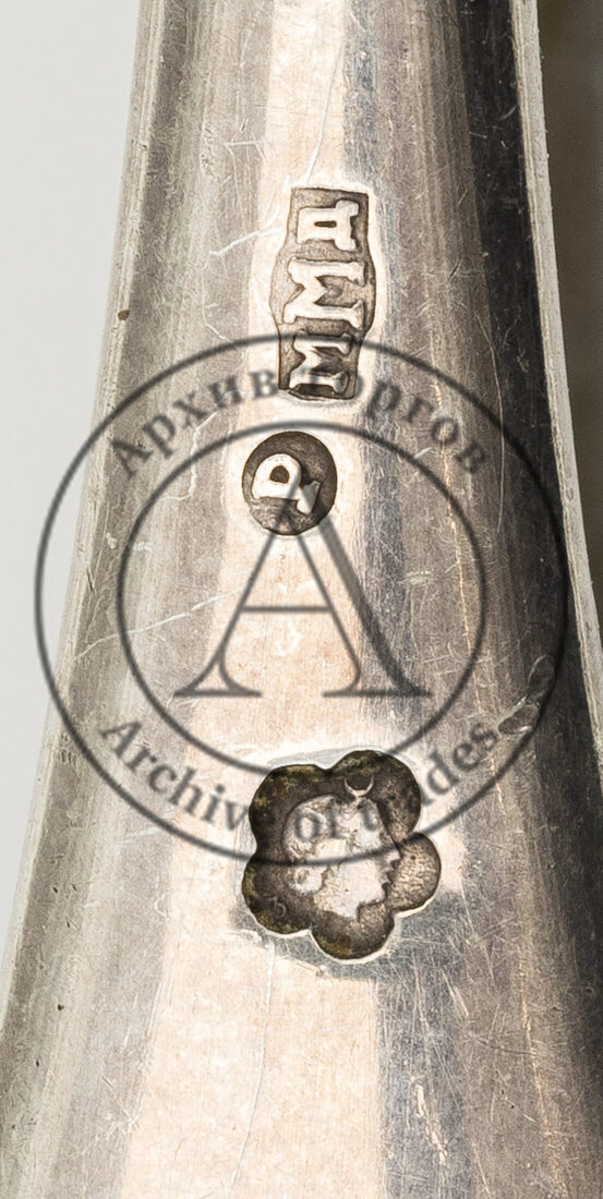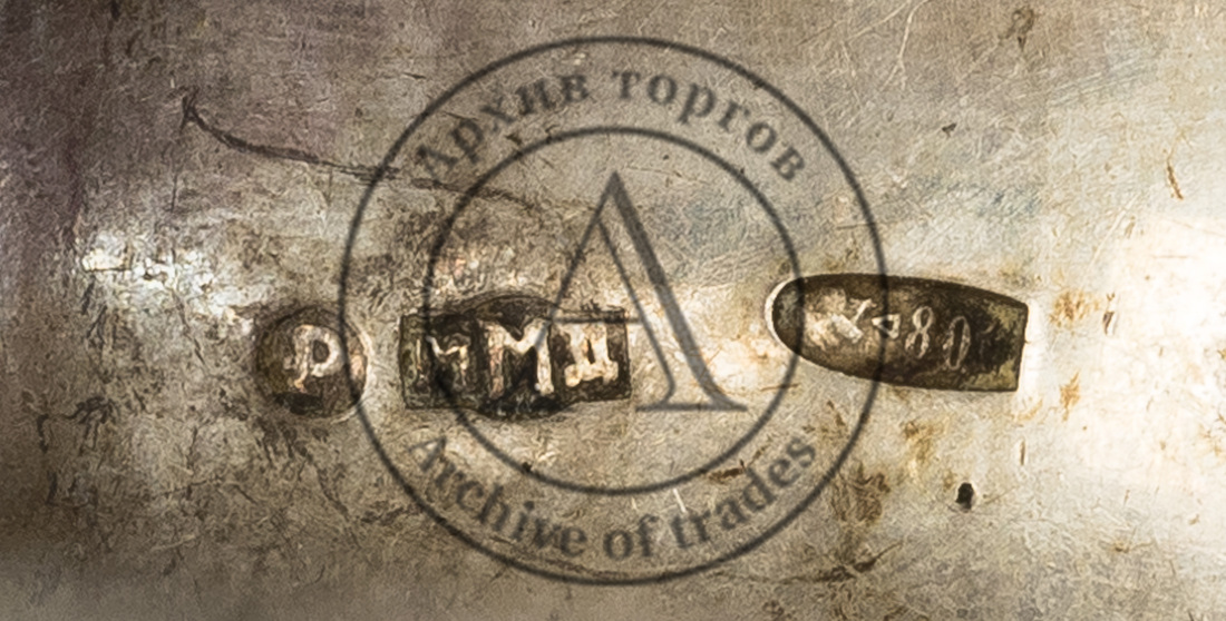 Клейма: 1) «голова Дианы, обращенная вправо» в щитке в виде пятилистника с цифрой «3» внизу слева (обозначение 800-й пробы и города изготовления в период 1867-1872 гг.); 2) «IO» (?) в прямоугольном щитке (нечитаемо);