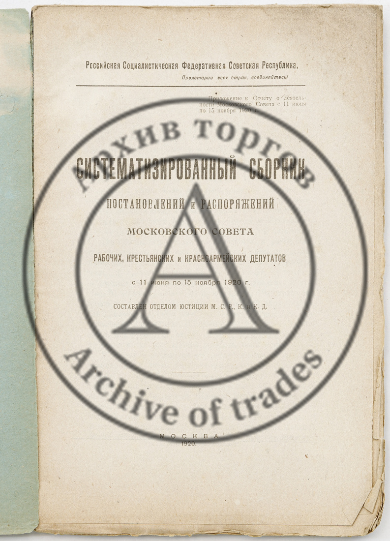 Систематизированный сборник постановлений и распоряжений Московского совета рабочих, крестьянских и красноармейских депутатов, с 11 июня по 15 ноября 1920 г. / Сост. отд. юстиции М.С.Р., К. и К.Д.