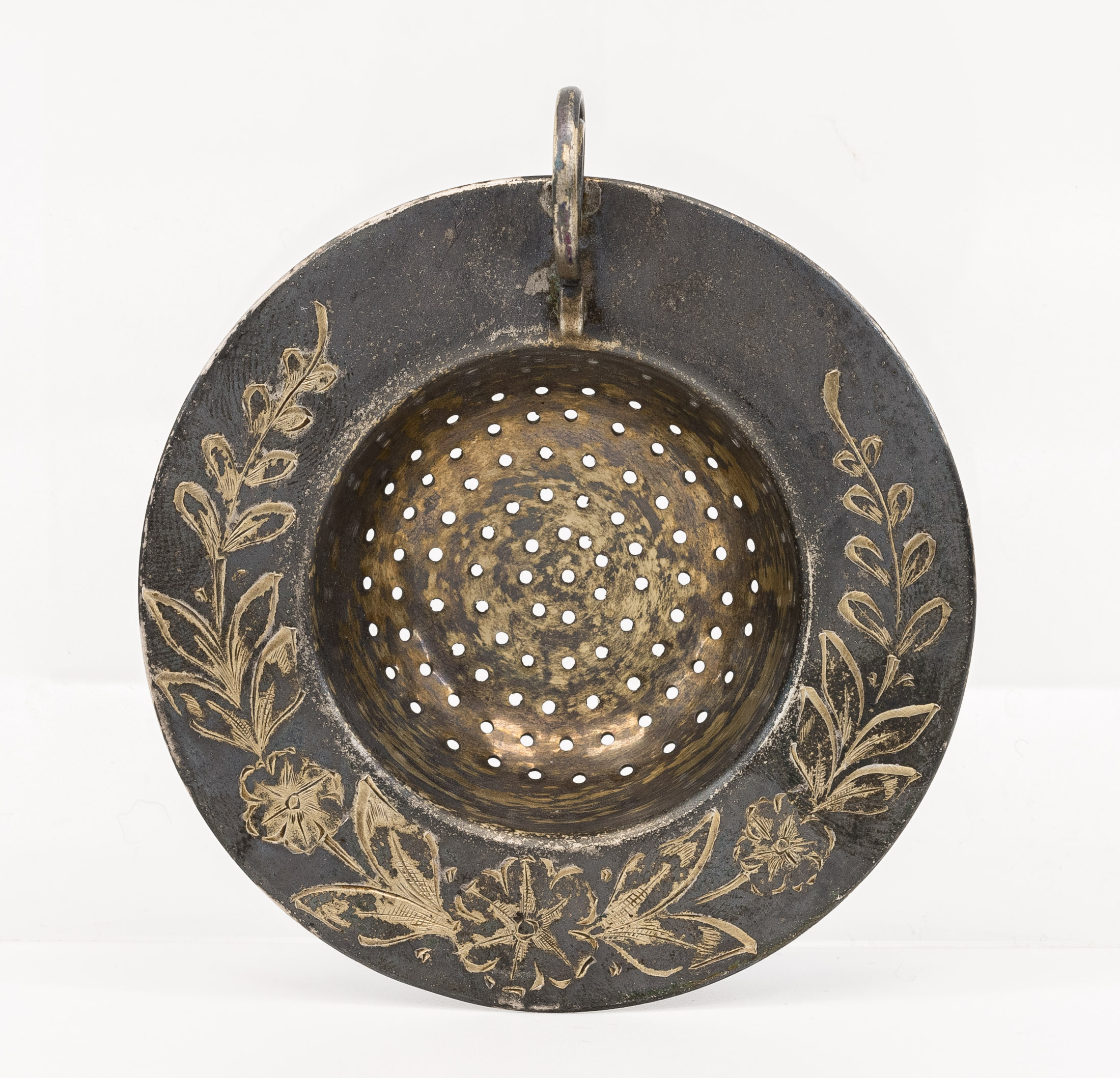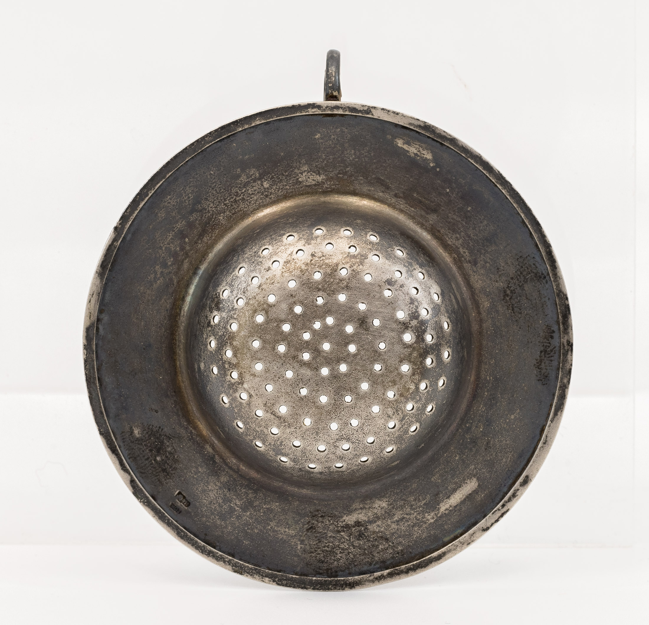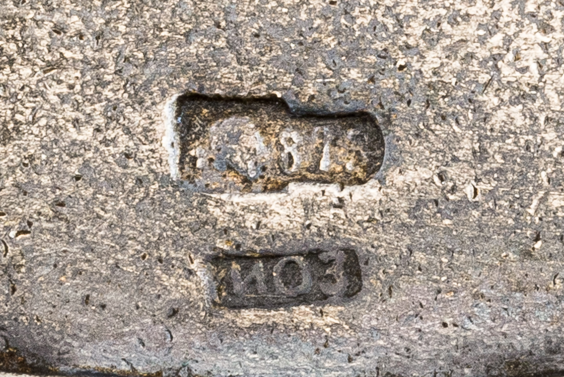 Клейма: 1) литера «β» (бета), голова рабочего, обращенная вправо, с молотком и «875» в щитке в форме лопатки (село Красное Костромской обл., Красносельская инспекция пробирного надзора 1954–1958 гг.; 2) именник производителя с датой производства «ИО3» в прямоугольном щитке; 3) на ручке «голова рабочего, обращенная вправо, с молотом, двумя линиями и точкой» в круглом щитке (Красносельская инспекция).