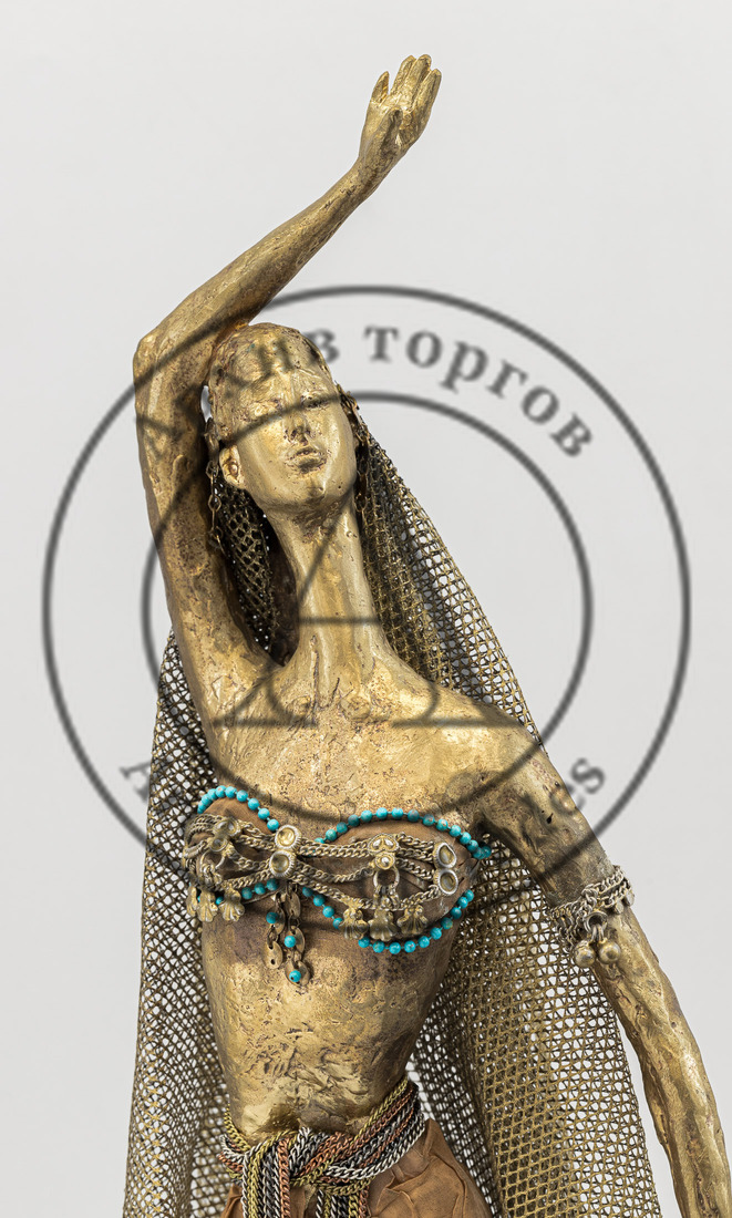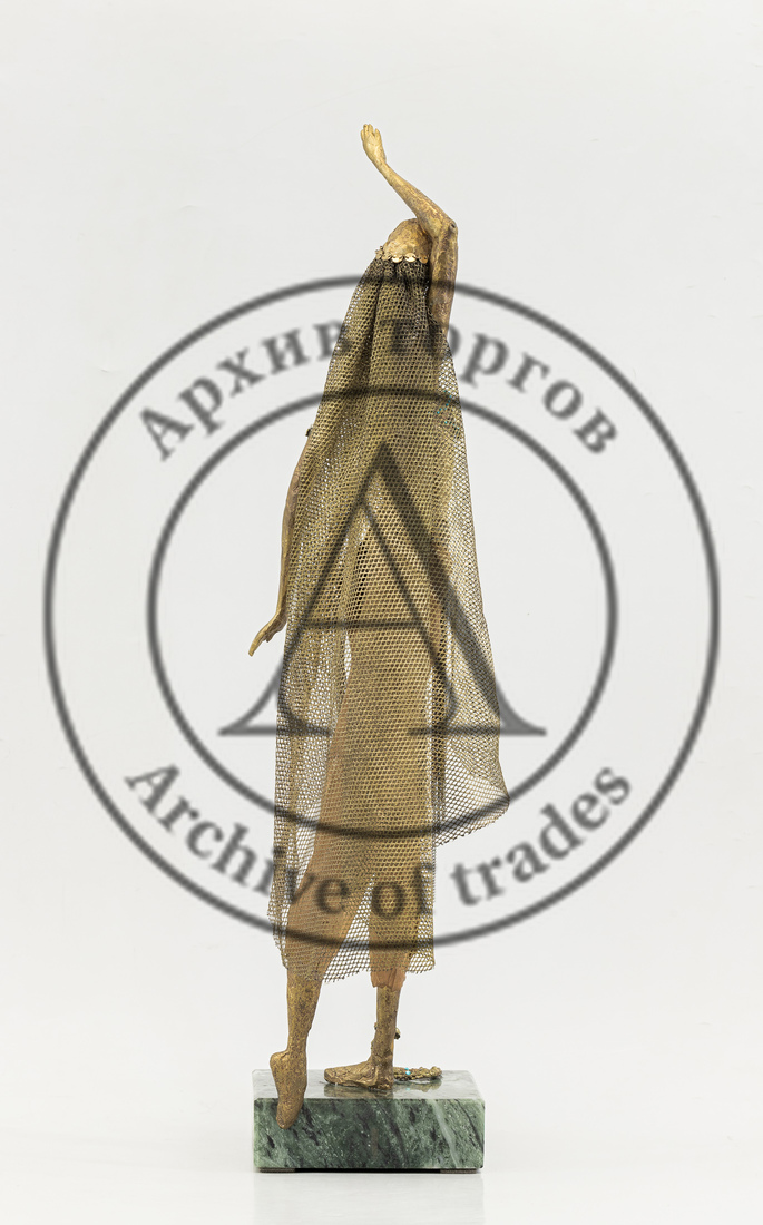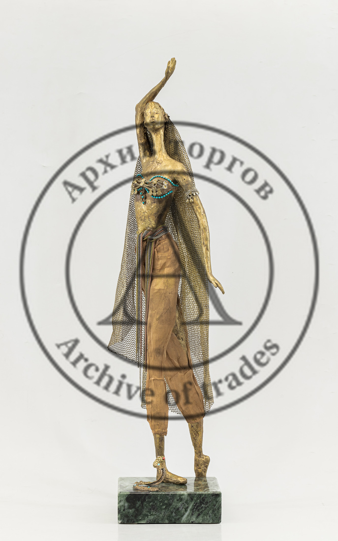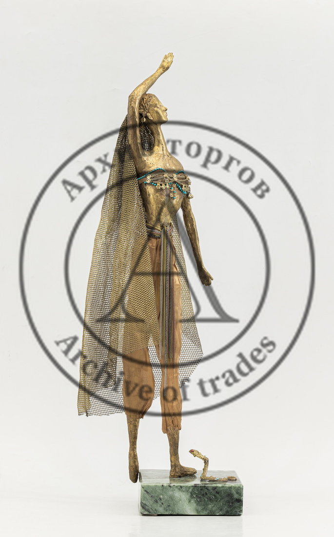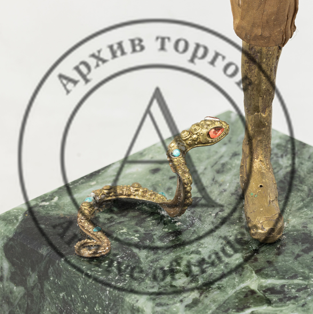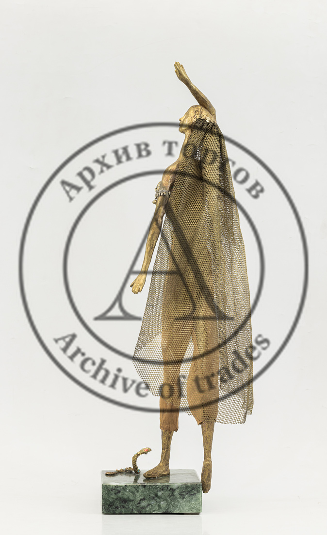 Бронза, бронзовая сетка, ювелирный декор, золочение. Постамент: змеевик.