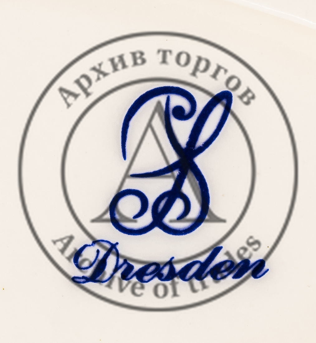 Марки: 1) фирменная «SP Dresden» прописью (синим подглазурно); 2) «А0001B» (в тесте).