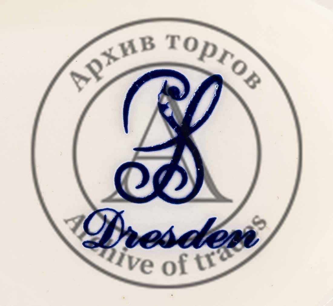 Марки: 1) фирменная «SP Dresden» прописью (синим подглазурно); 2) «А0001B» (в тесте).