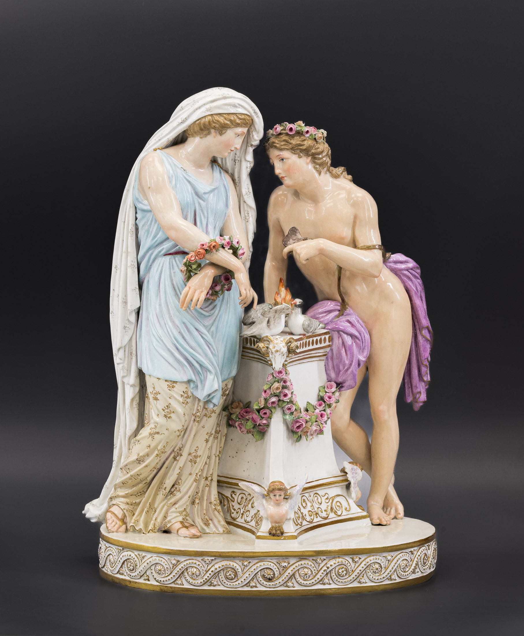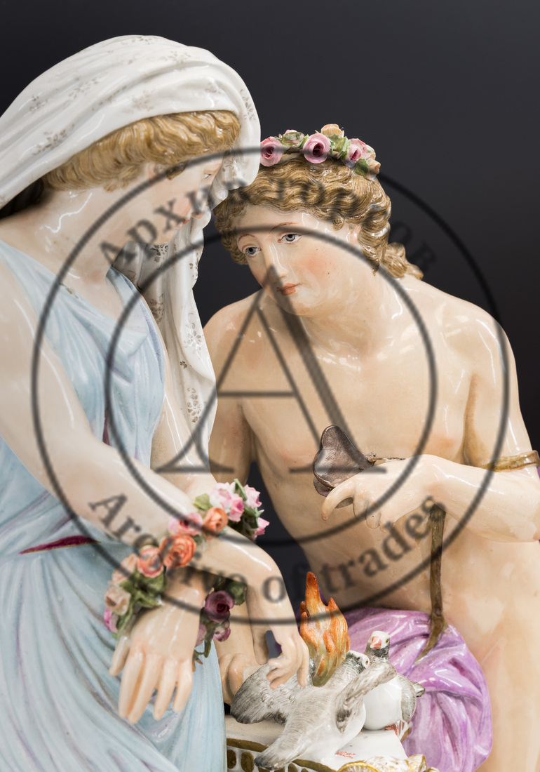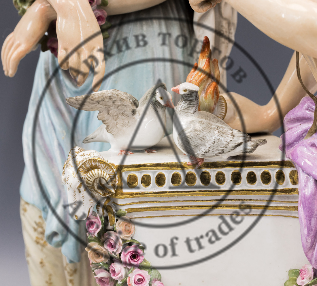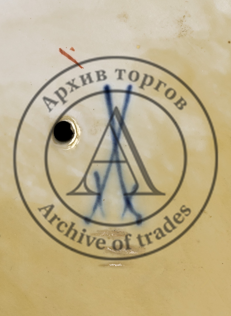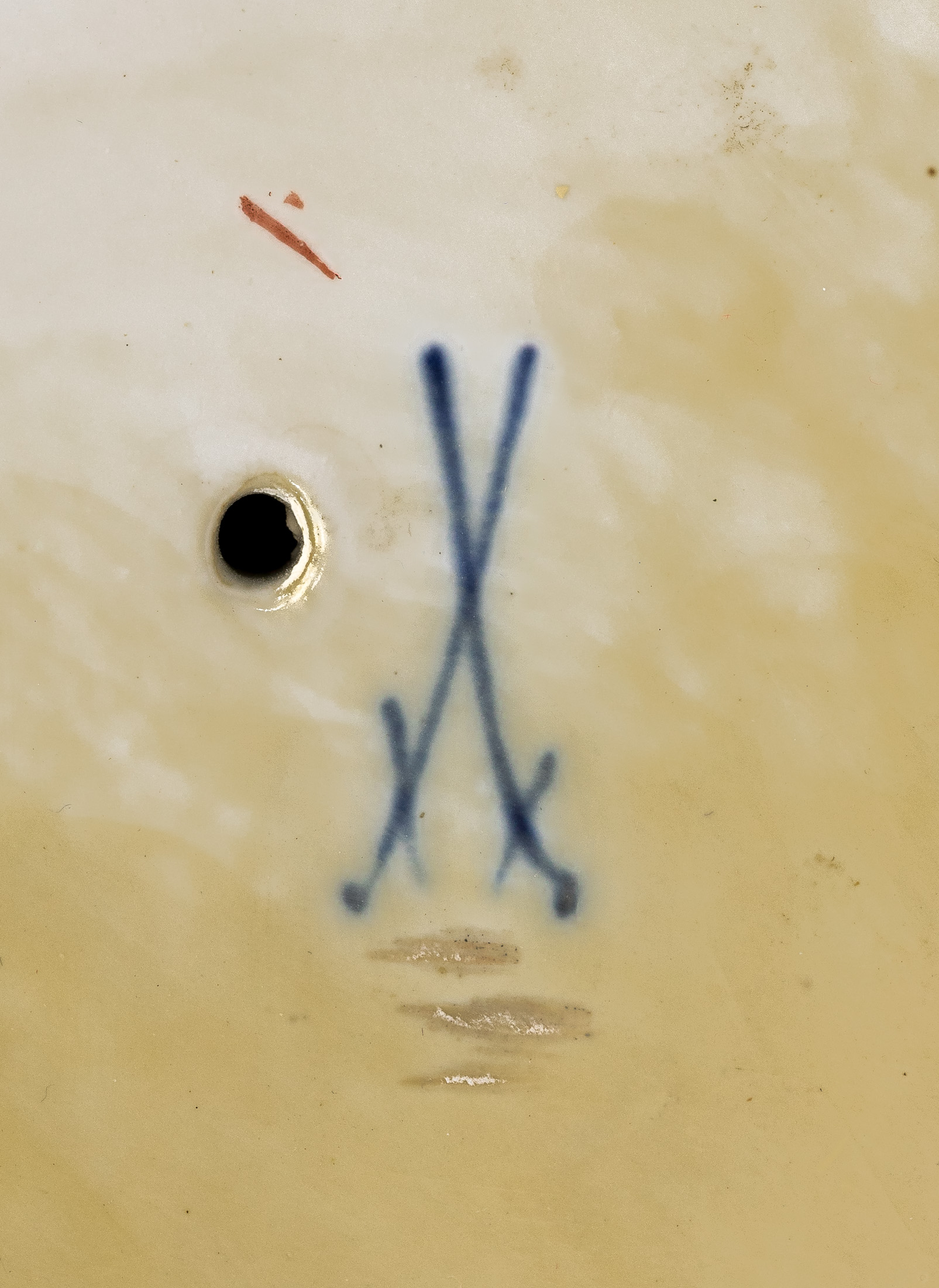 Марки: фирменные «два перекрещенных меча» (кобальт, подглазурно), под ним три горизонтальные линии в массе, черта с точкой (красным).