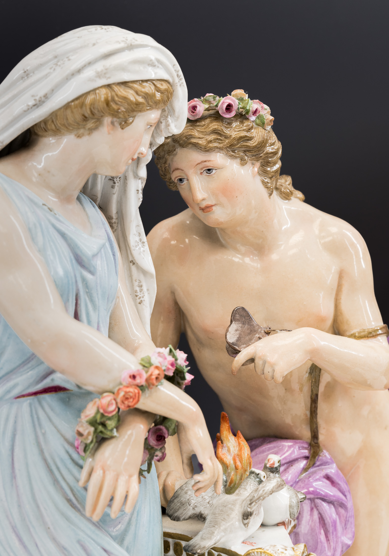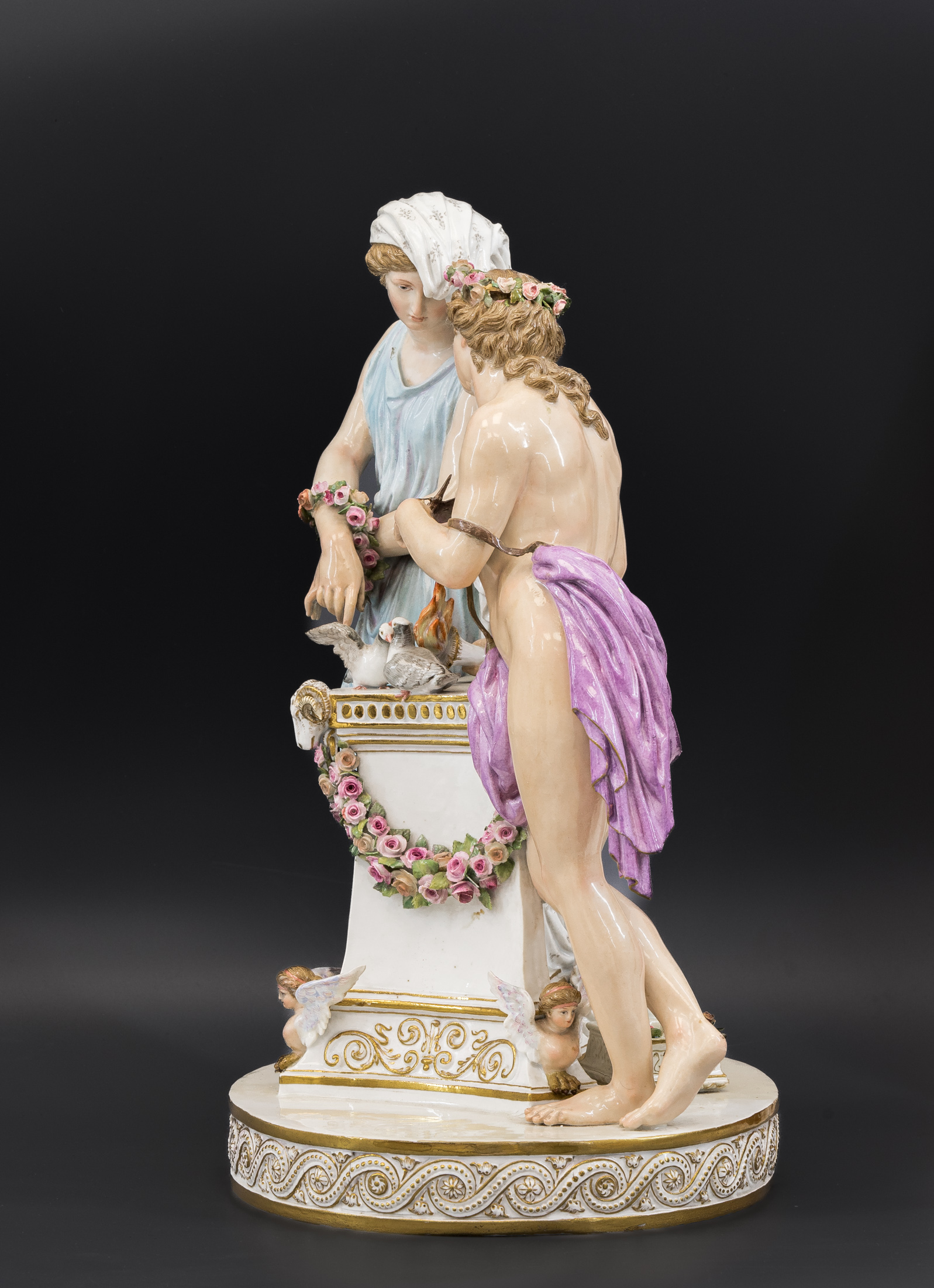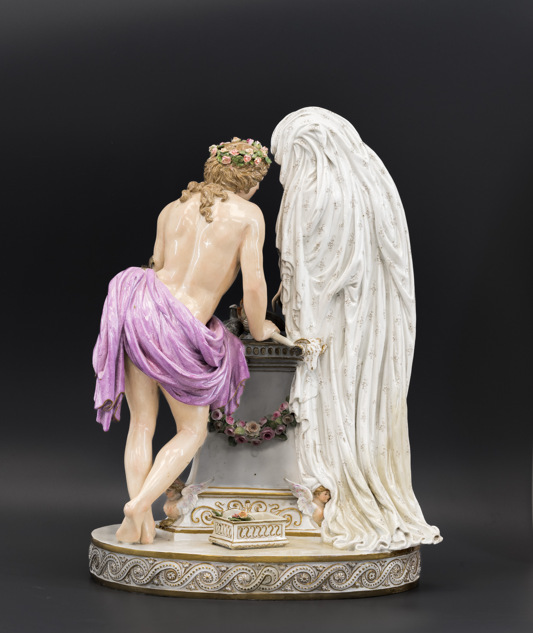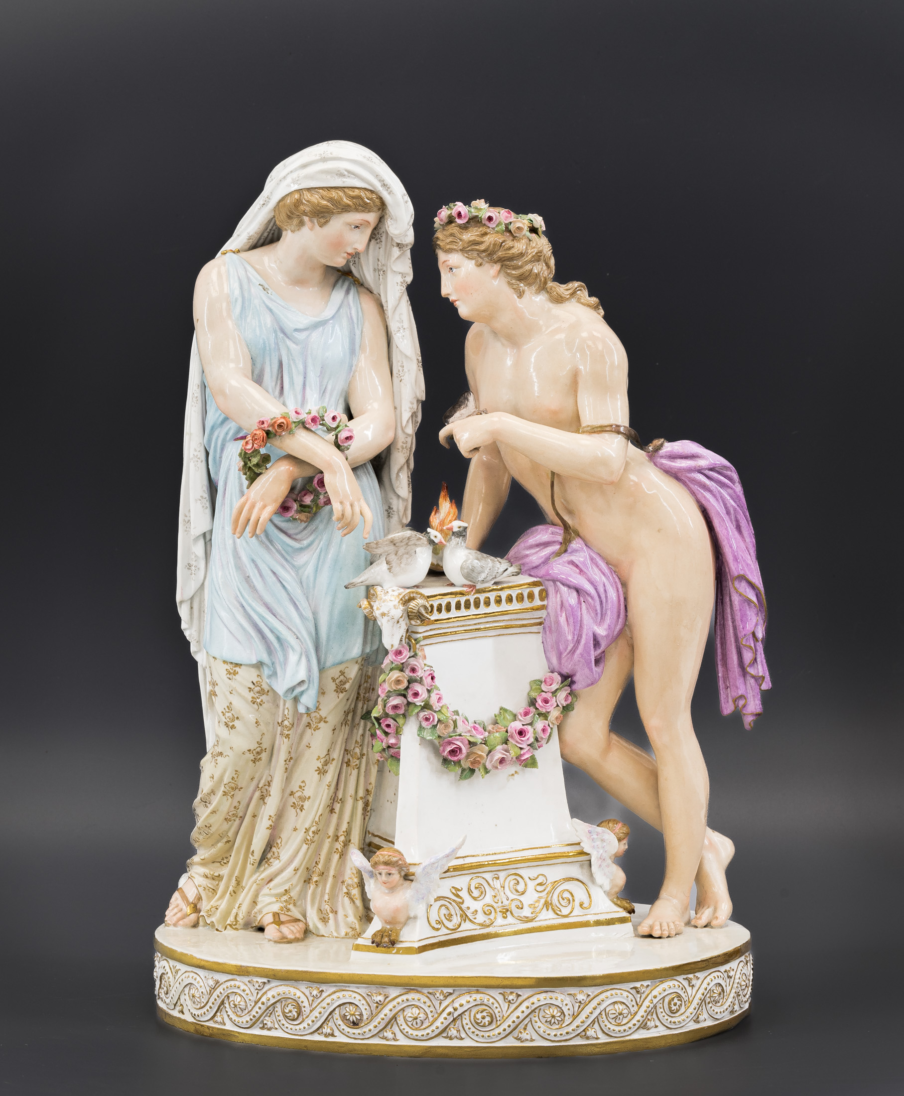 Марки: фирменные «два перекрещенных меча» (кобальт, подглазурно), под ним три горизонтальные линии в массе, черта с точкой (красным).