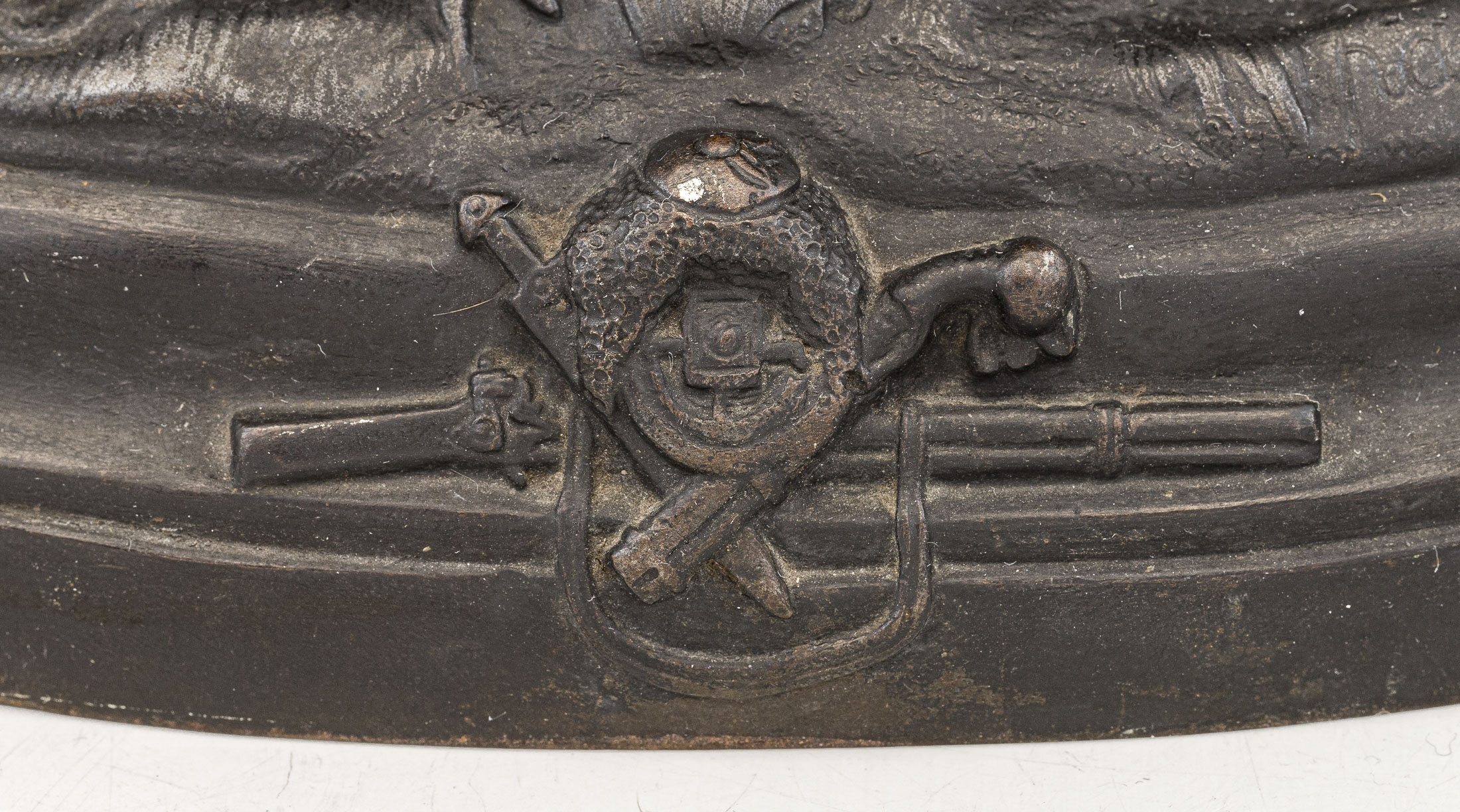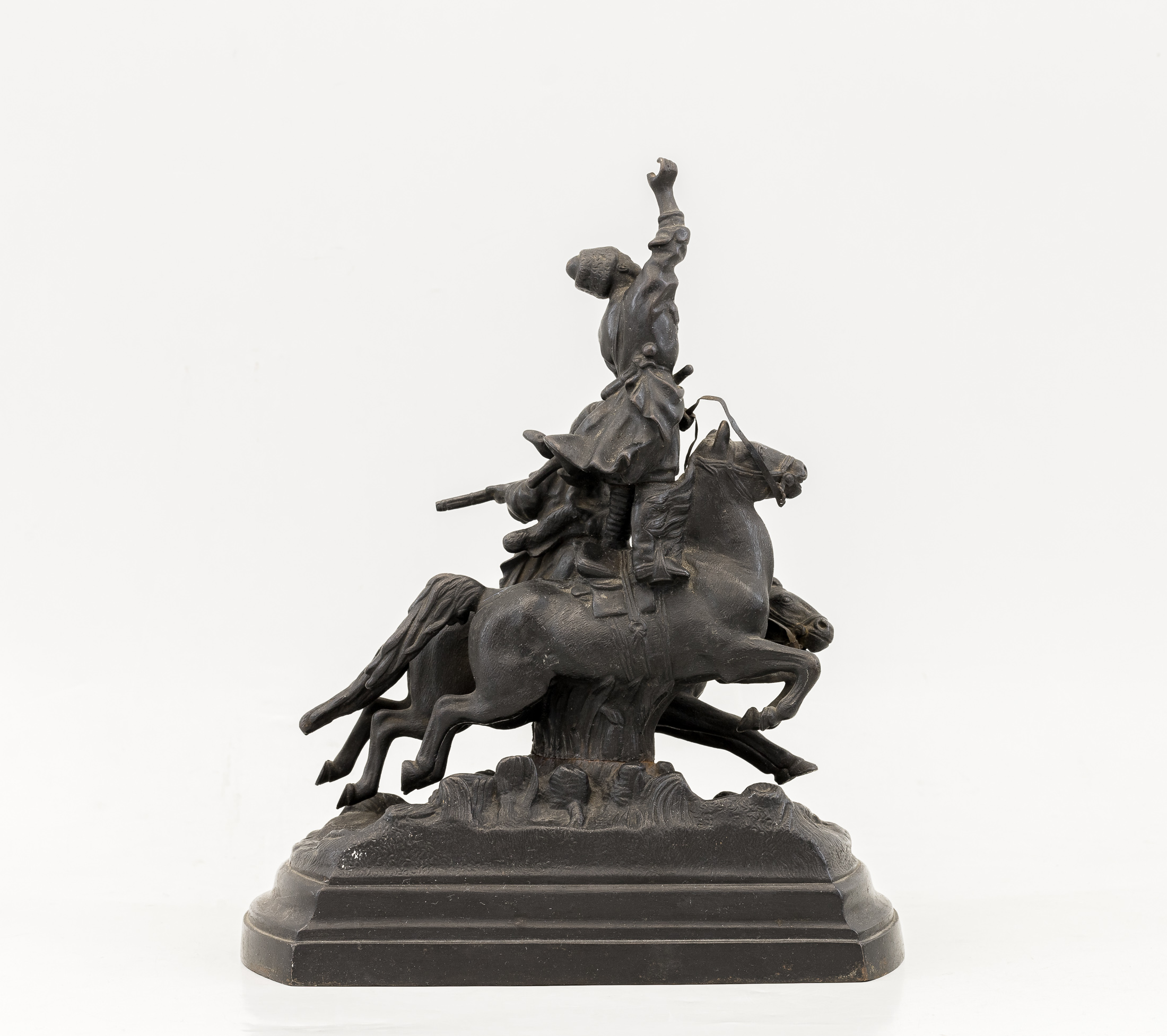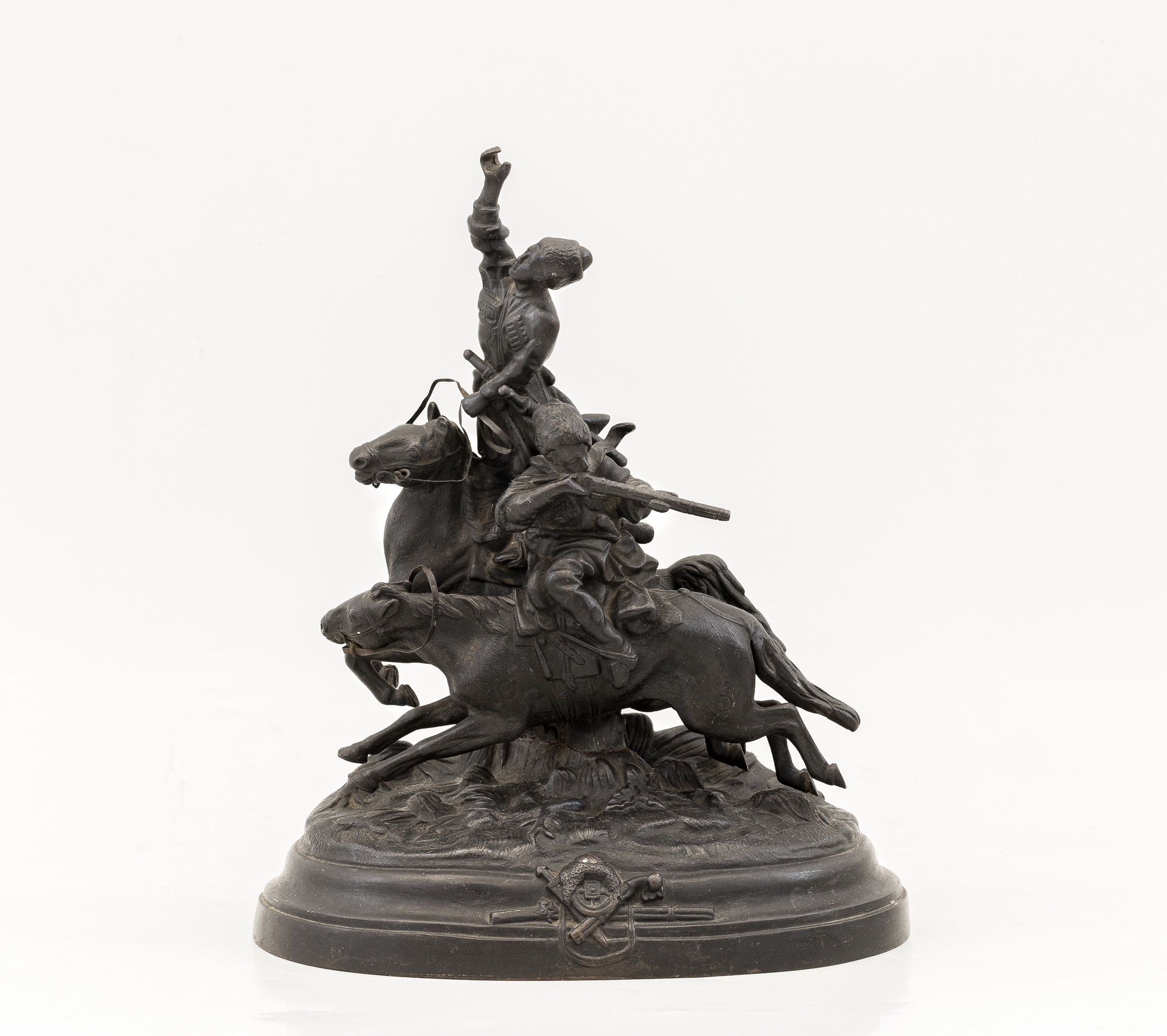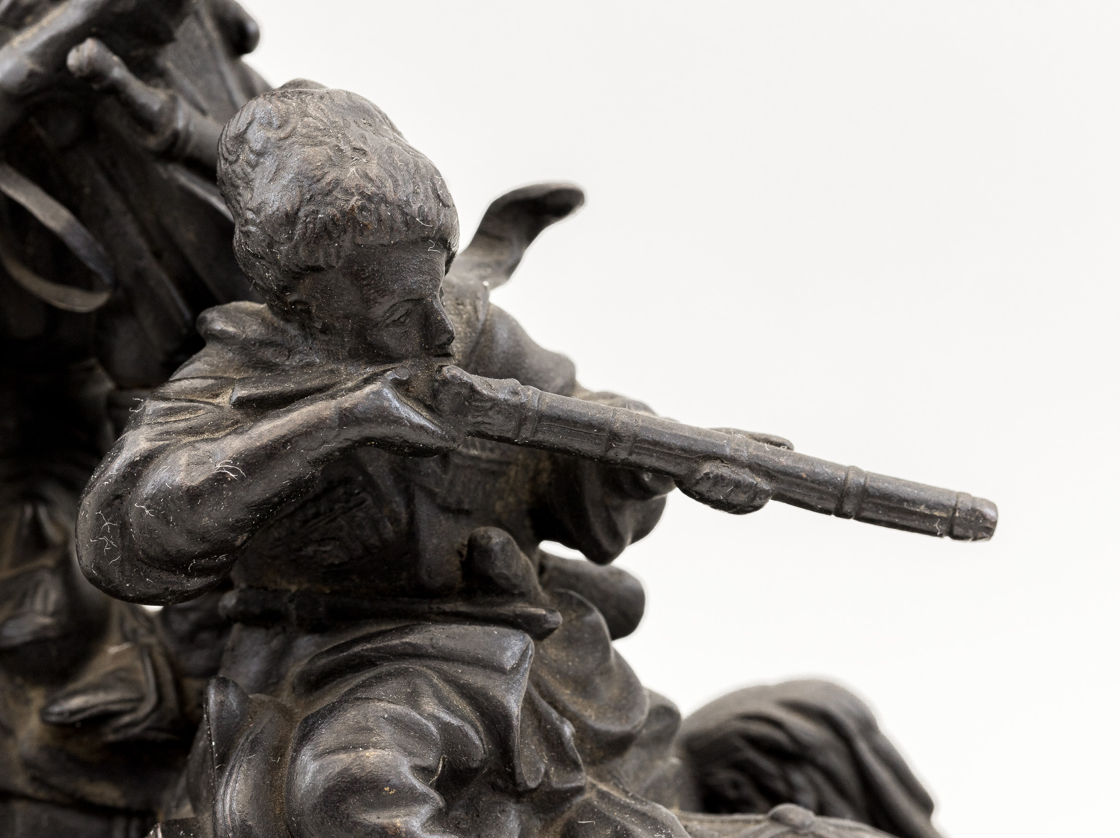 Сохранность: утрата ружья и большого пальца у центральной фигуры, ржавчина.