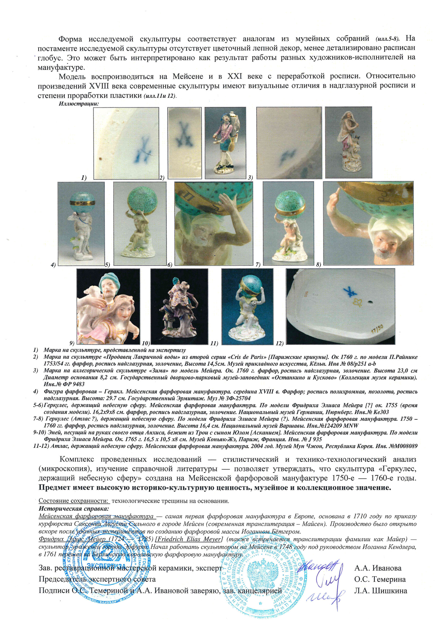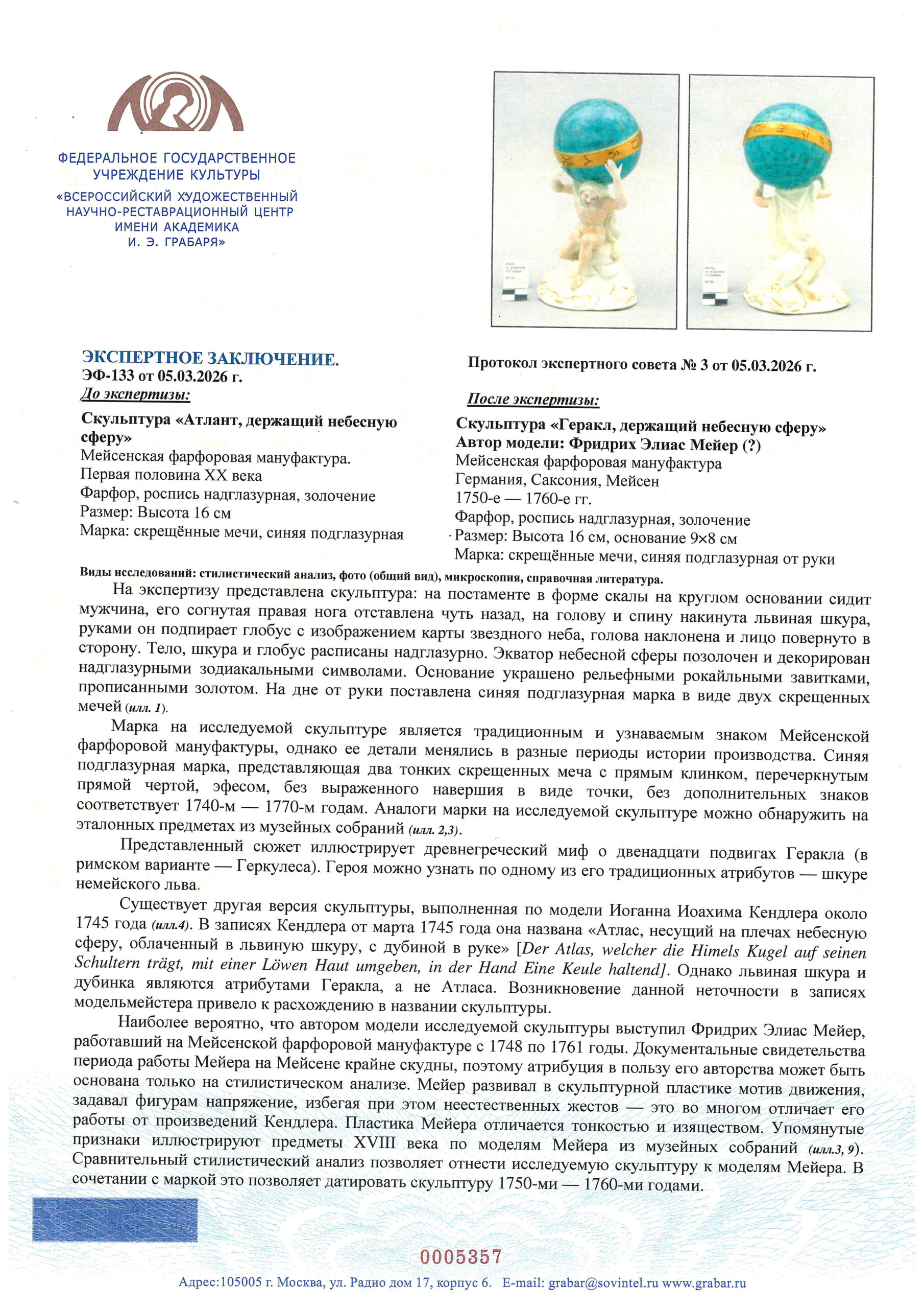 Экспертное заключение ВХНРЦ им. Грабаря № ЭФ-133 от 05.03.2026 г. Эксперт: зав. реставрационной мастерской керамики А.А. Иванова.