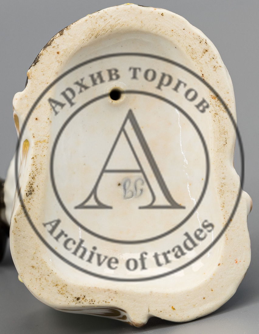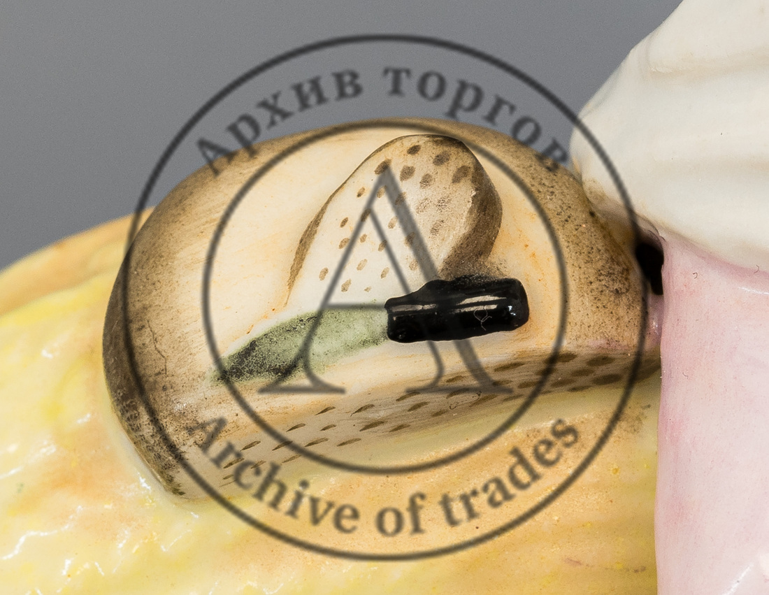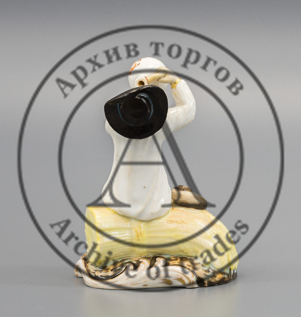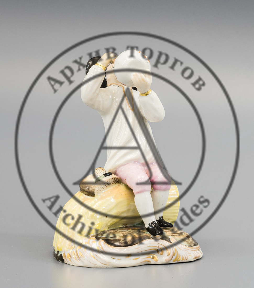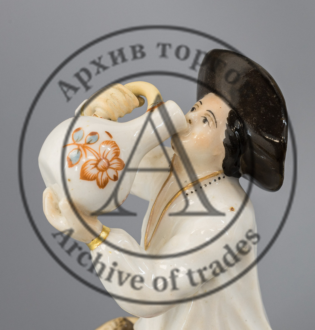 Сохранность: реставрация руки крестьянина и ручки кувшина, трещина на постаменте, реставрация росписи.