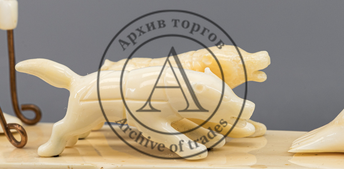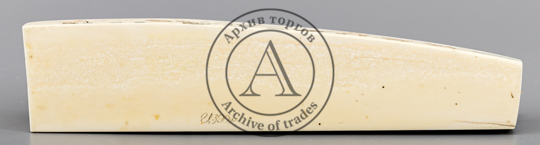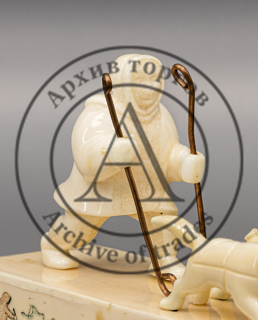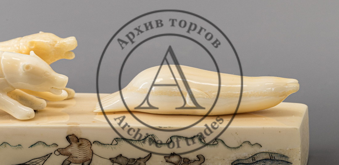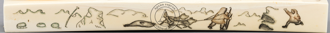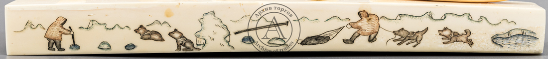 На одной стороне подставки с помощью гравировки изображены сцены с охотой на тюленя и вытаскиванием его из лунки с помощью сети; на другой стороне отражена сцена возвращения охотника с добычей в стойбище.