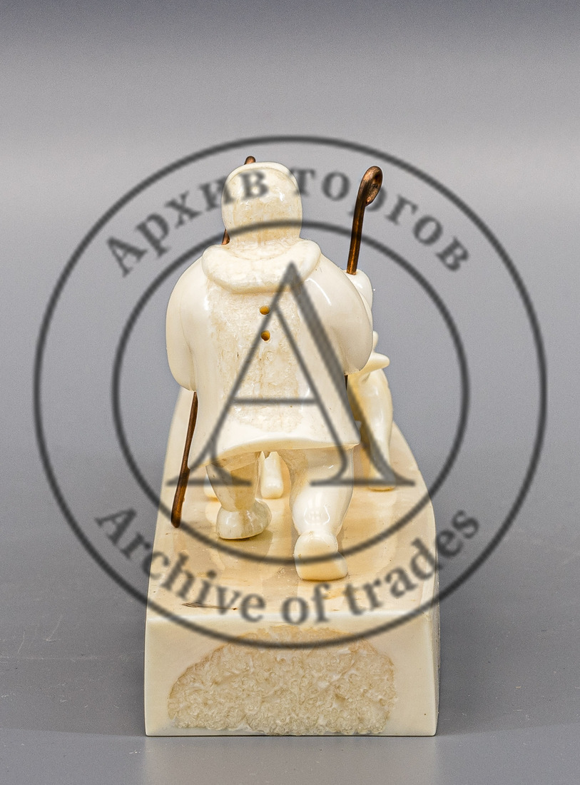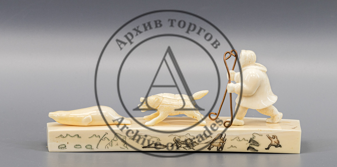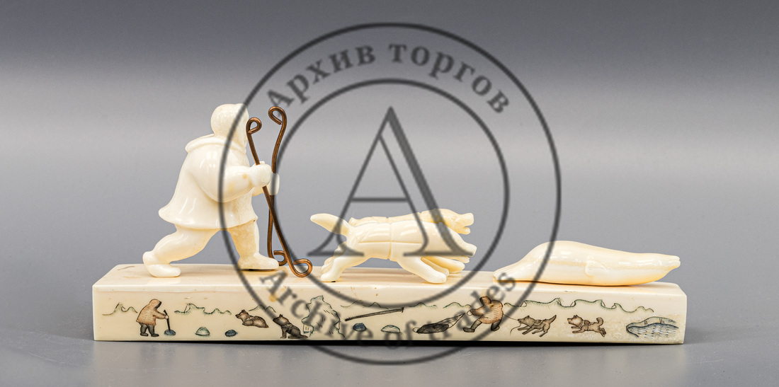 Скульптура изображает охотника с двумя собаками, которые подбегают к убитому тюленю. На фигурках собак схематично вырезаны линии, обозначающие тягловые ремни.