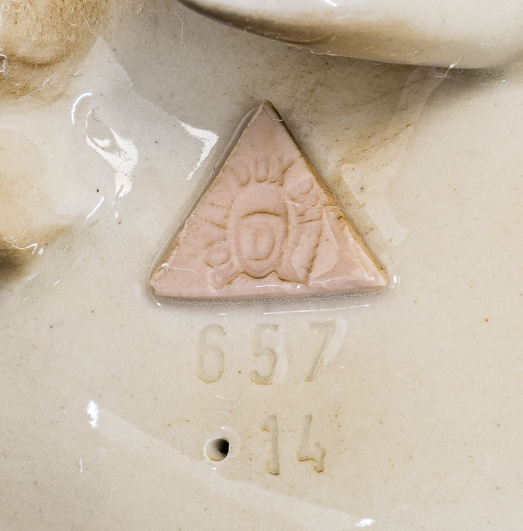 Марки: 1) розовый треугольник с надписью «Royal Dux Bohemia» с литерой «D»; 2) треугольник с надписью «Royal Dux Bohemia» с литерой «D», вокруг которого надпись «·Hand painted· Made in Czechoslovakia·» (печать синим); 3-4) в тесте»657″, «14».
