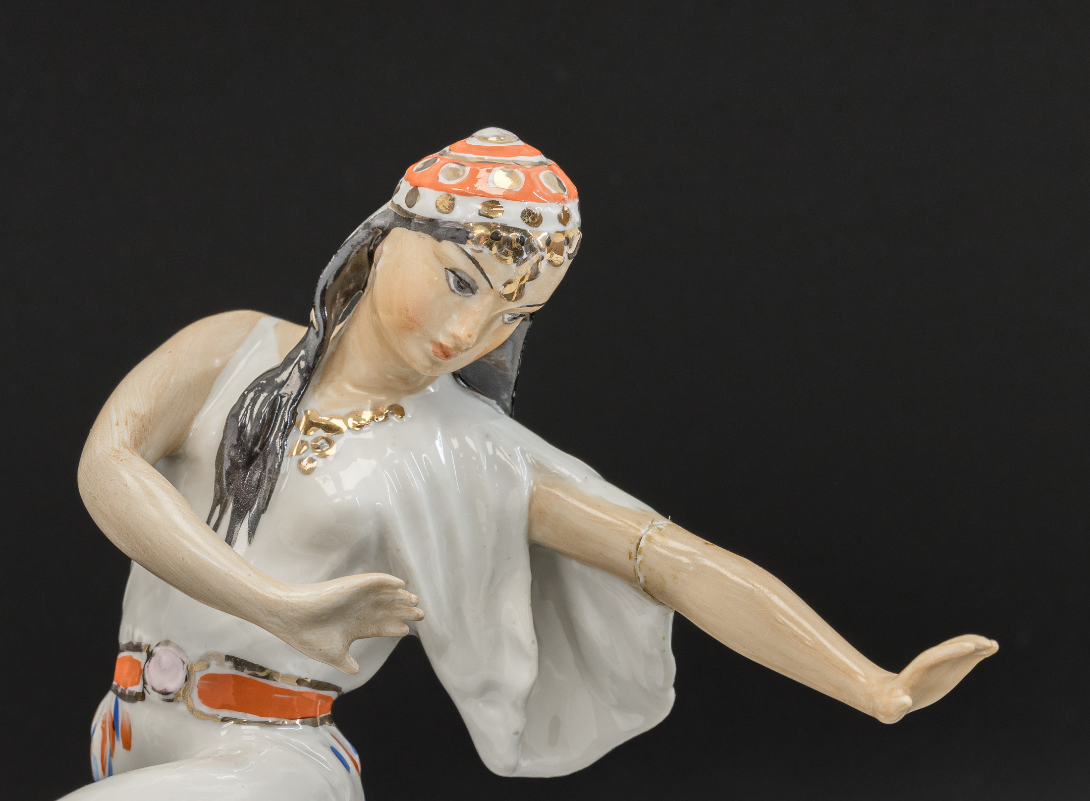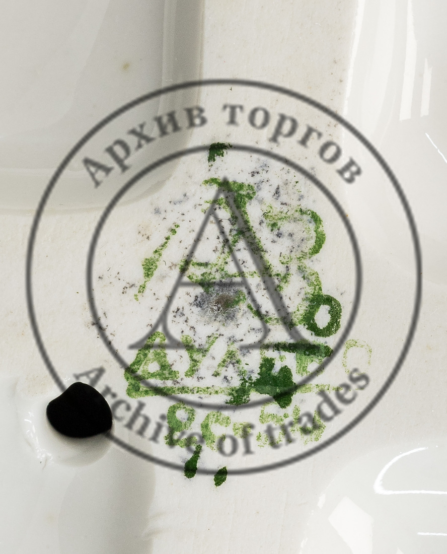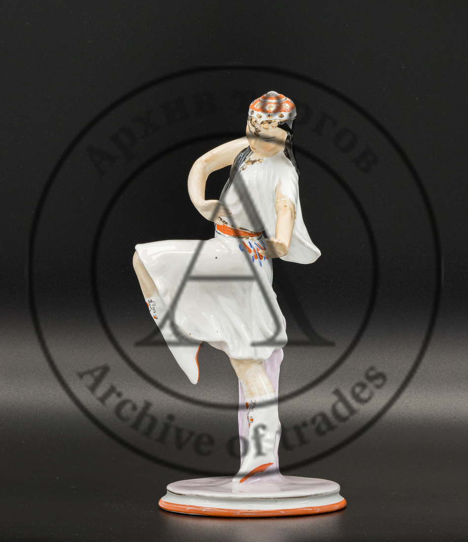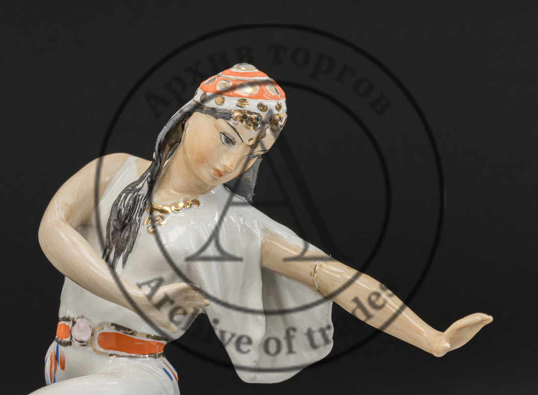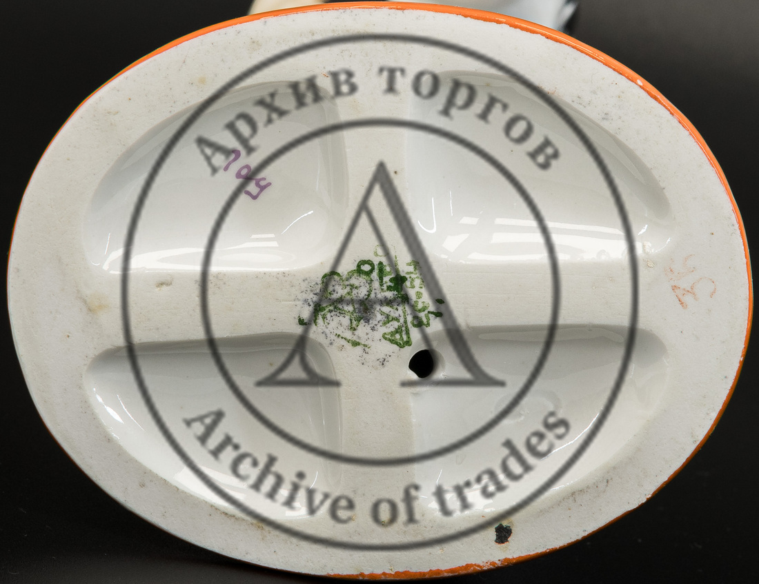 Сохранность: непрофессиональная реставрация руки (склейка), легкие потертости золочения, повреждения глазури на постаменте.
