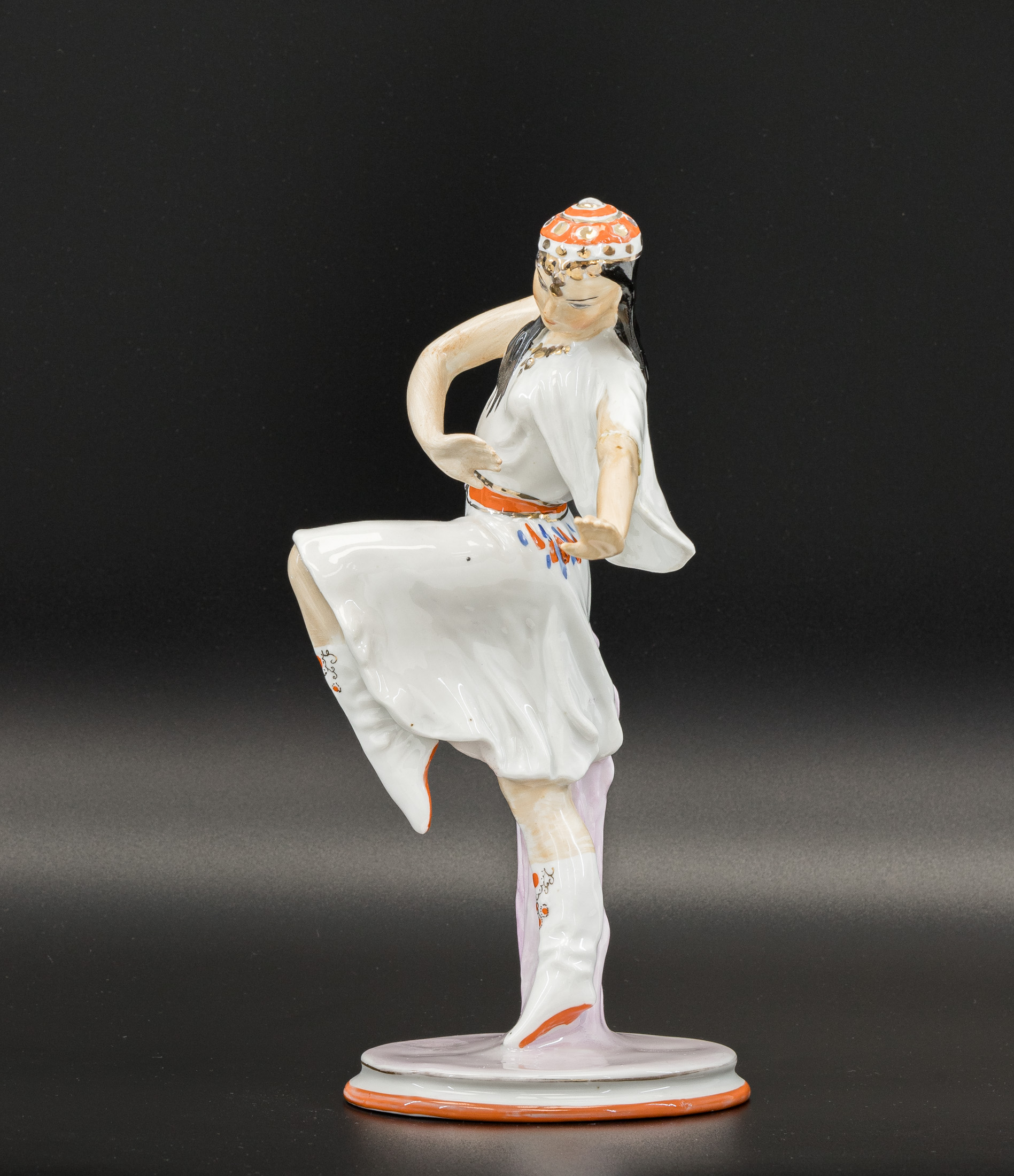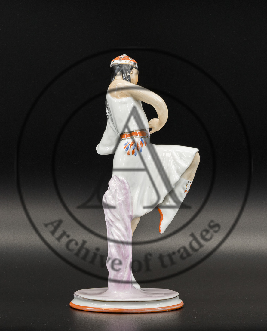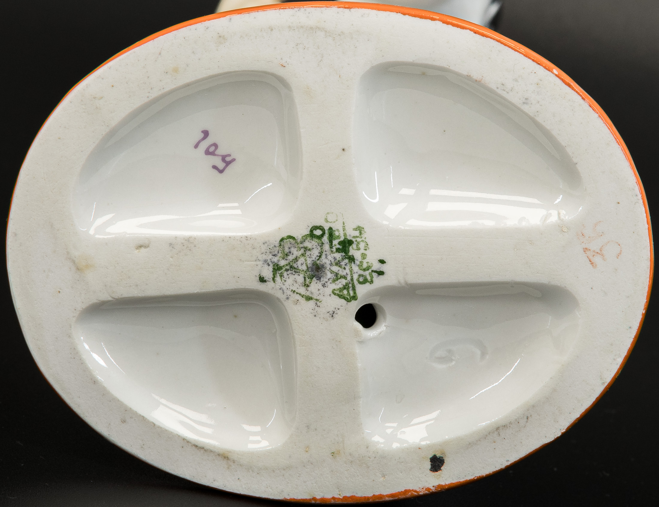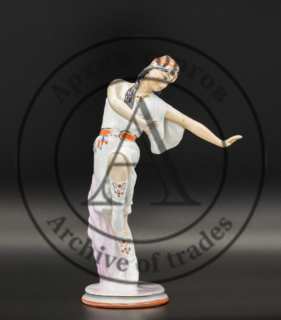Сохранность: непрофессиональная реставрация руки (склейка), легкие потертости золочения, повреждения глазури на постаменте.