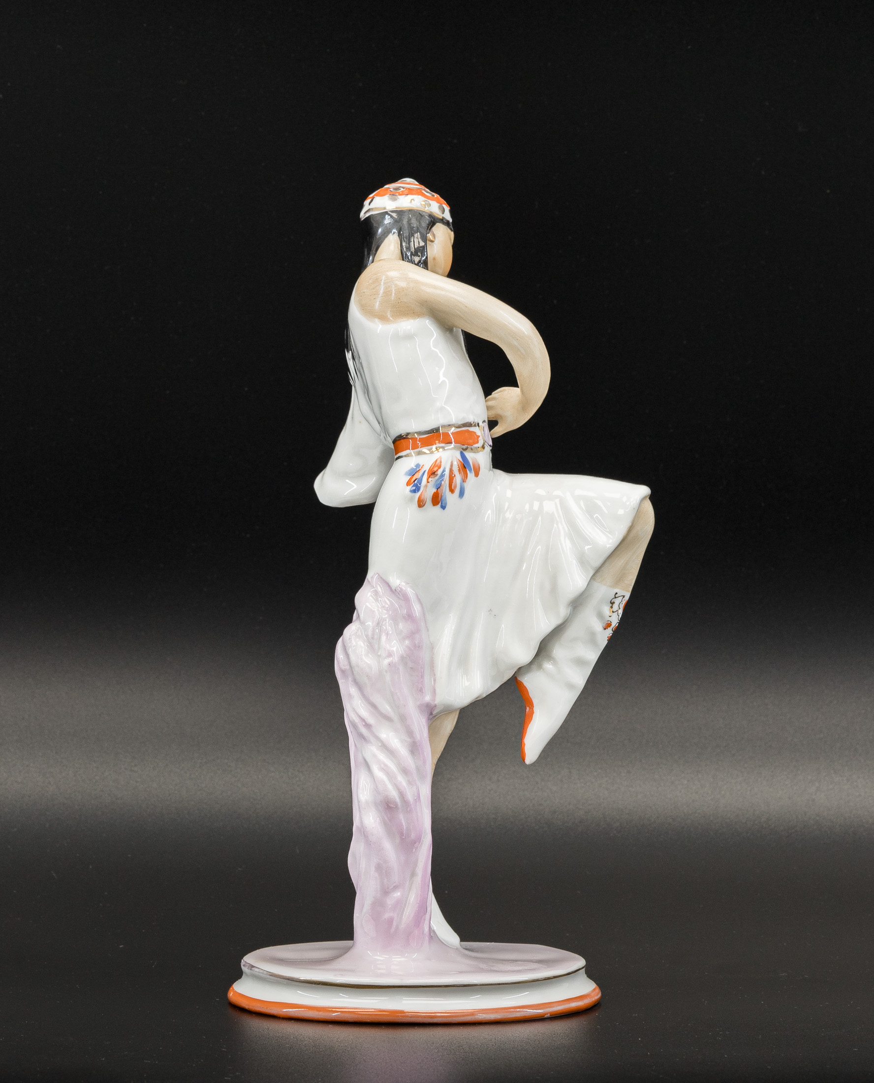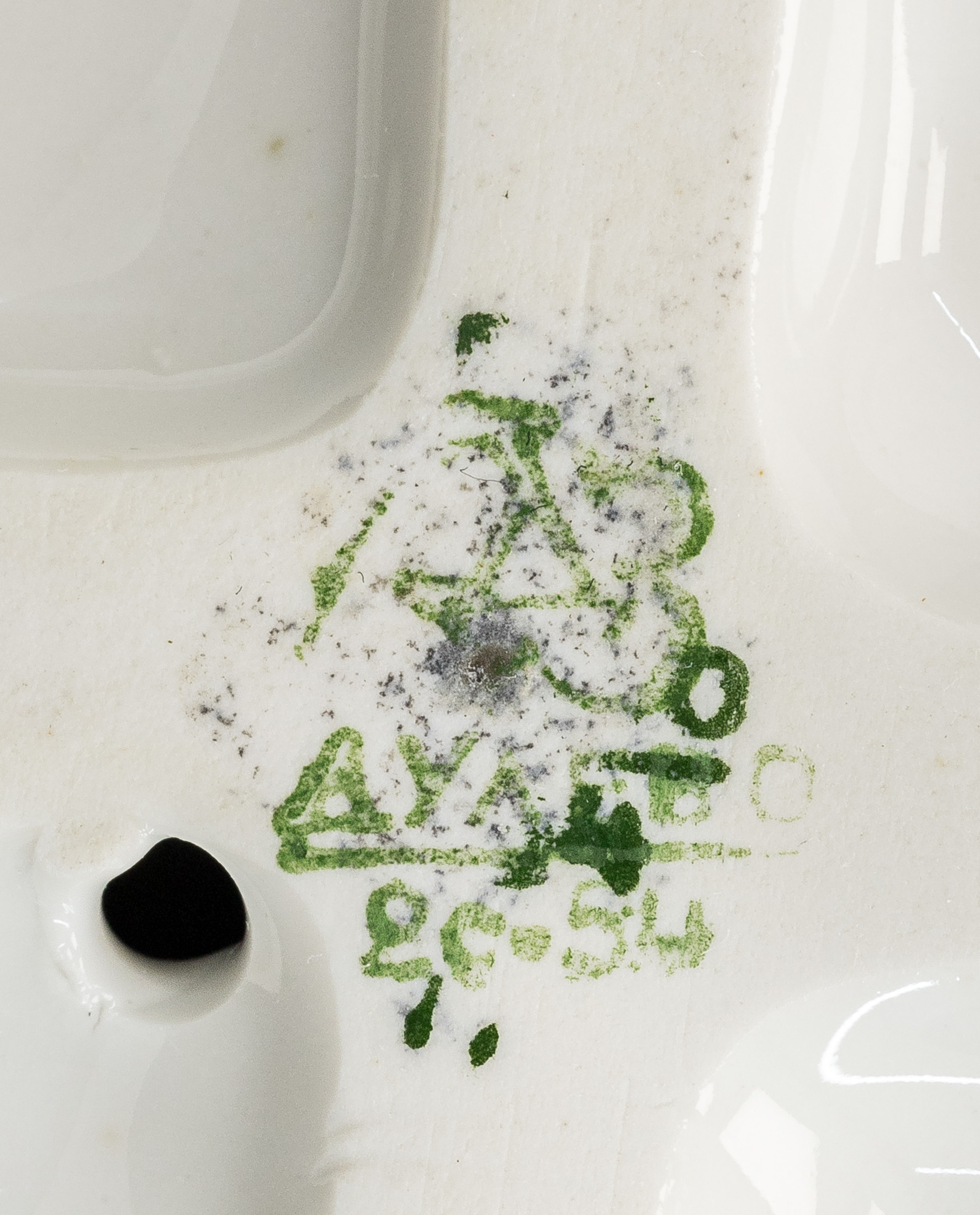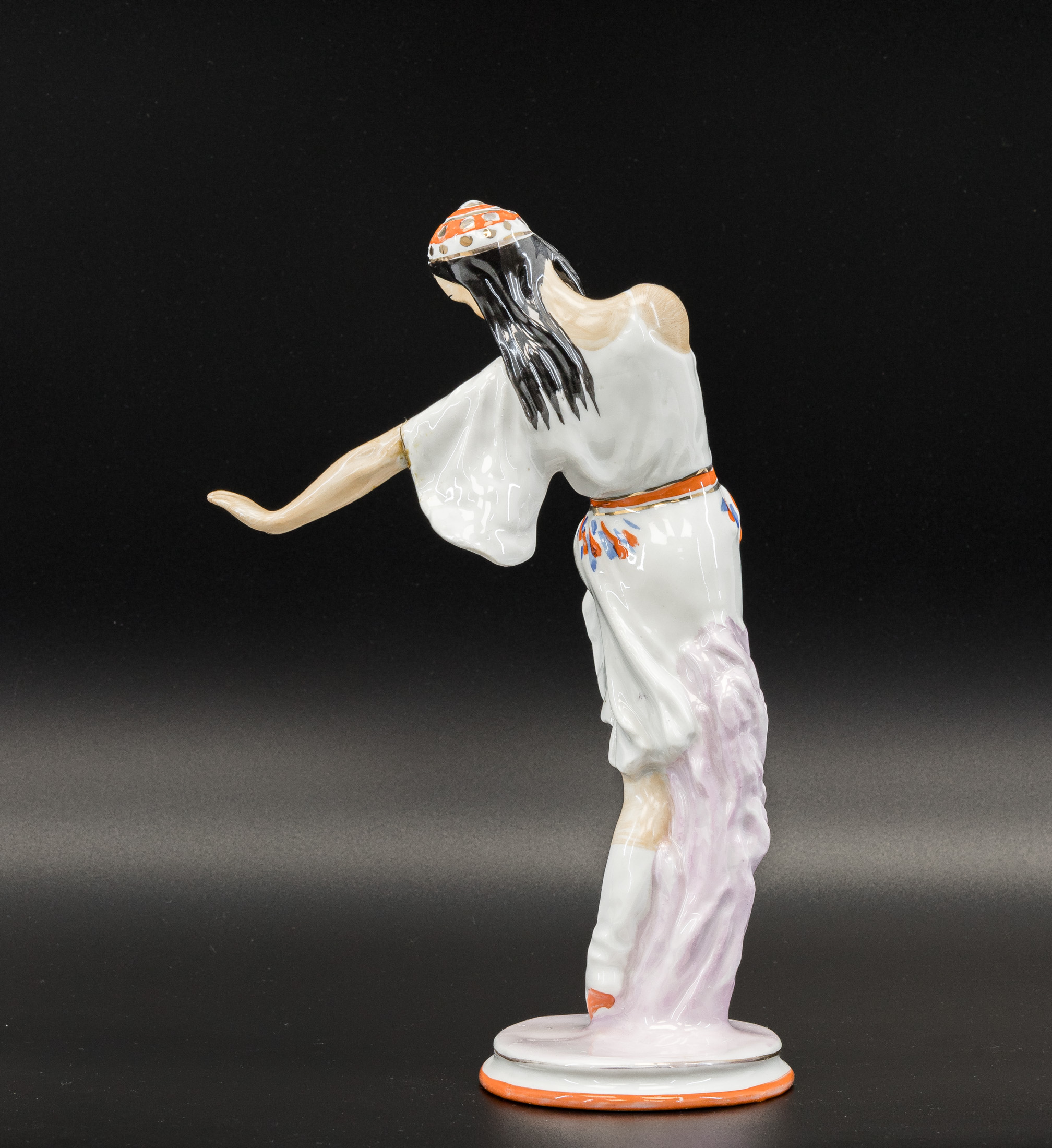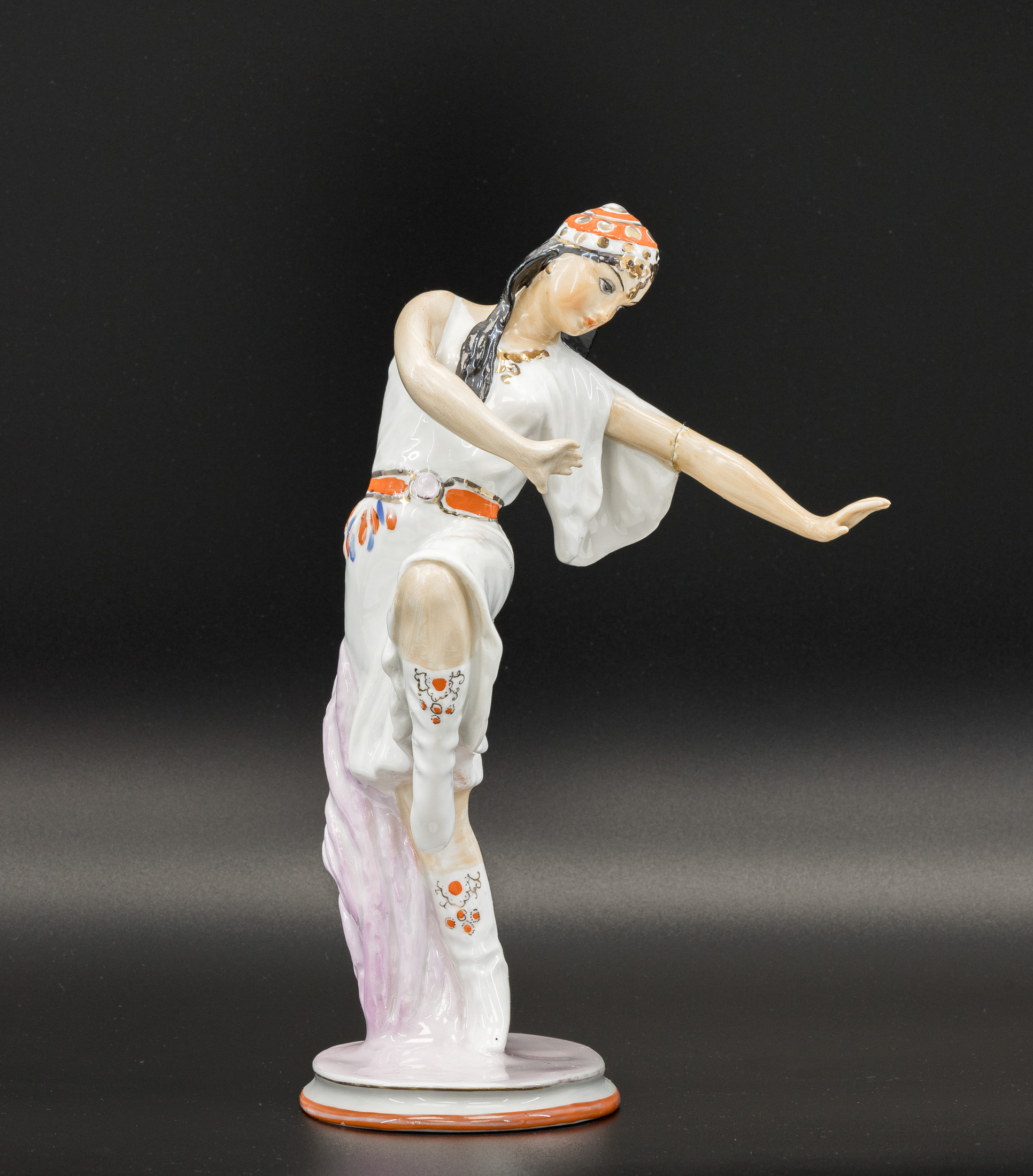 Сохранность: непрофессиональная реставрация руки (склейка), легкие потертости золочения, повреждения глазури на постаменте.