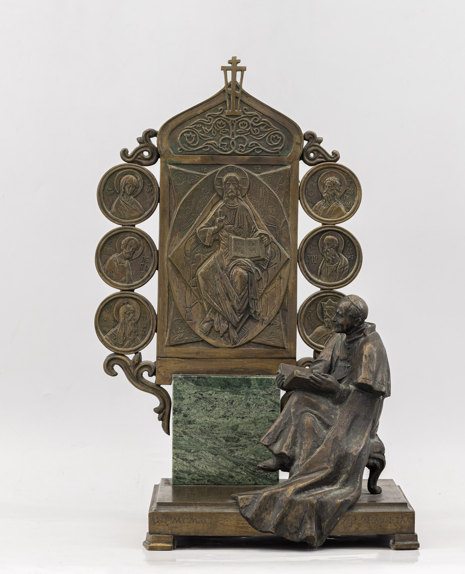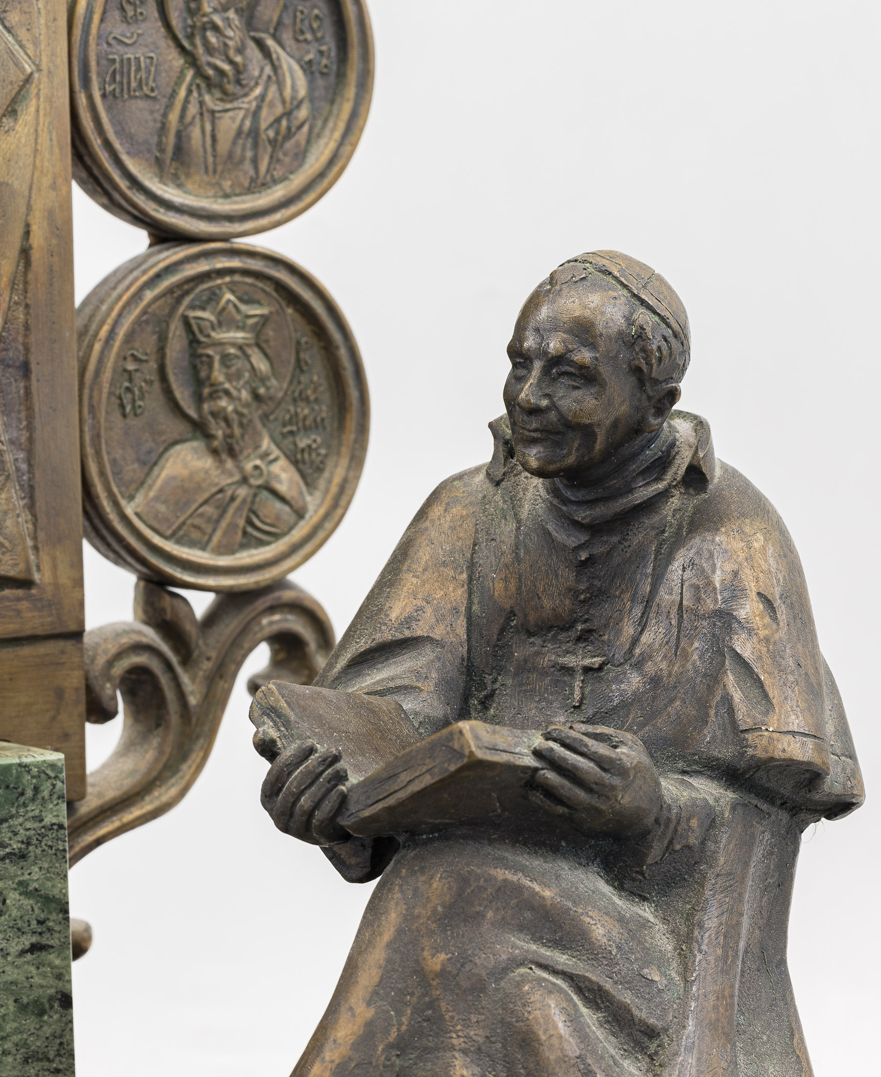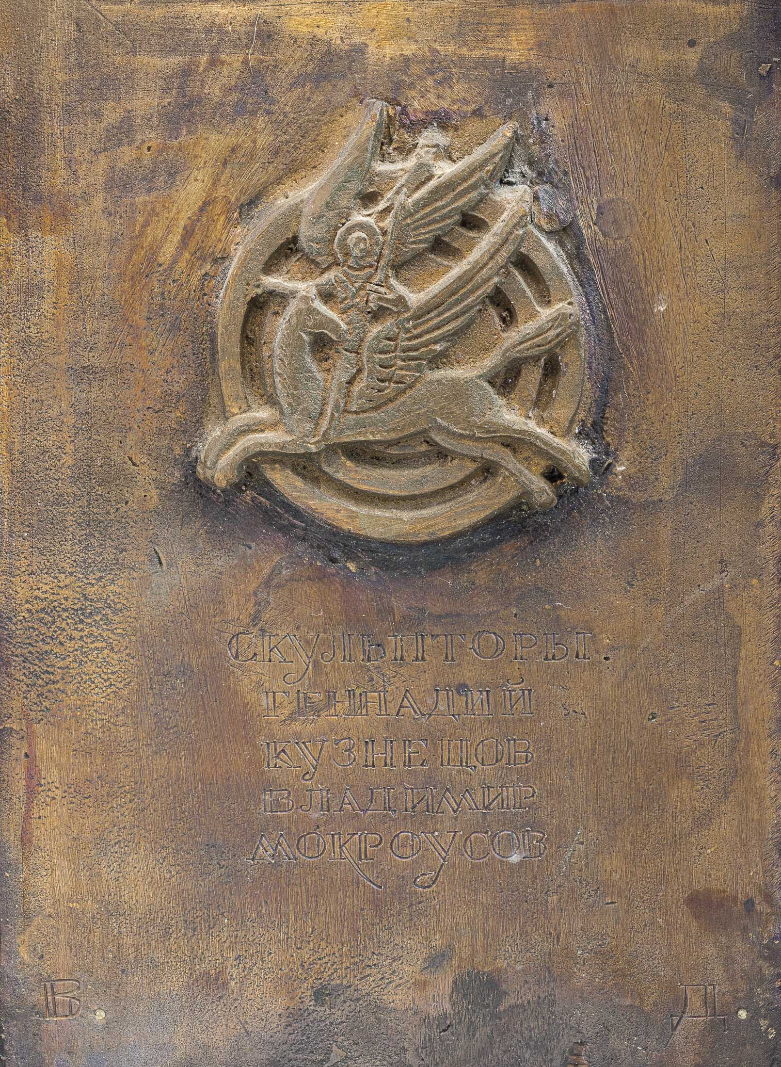 Надписи: на оборотной стороне: «СКУЛЬПТОРЫ. / ГЕННАДИЙ / КУЗНЕЦОВ / ВЛАДИМИР / МОКРОУСОВ / В. / Д.»; на постаменте «CVRIS DOMVS EDITORIALIS · КРУГЪ · NOMINATAE/ A.D. MCMXCI / AD MEMORIAM/ KAROLO WOJTYŁA AVCTORE MOSCOVIAE EDITI»