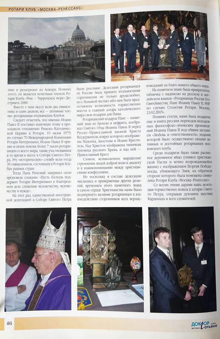 16 марта 2005 года в рамках поездки в Италию в честь празднования столетнего юбилея Ротари-клуба представители российского ротарианства после мессы в Соборе Святого Петра в Риме вручили скульптуру кардиналу Полю Пупару, главе папского Совета по делам культуры, который служил мессу ввиду болезни Папы. Воспоминания и фотографии мероприятия запечатлены в статье Джана Паоло Марелло, очевидца событий поездки и президента Ротари-клуба "Москва-Ренессанс" (Журнал "Доктор Татьяна" № 10, 2005. С. 44–49).