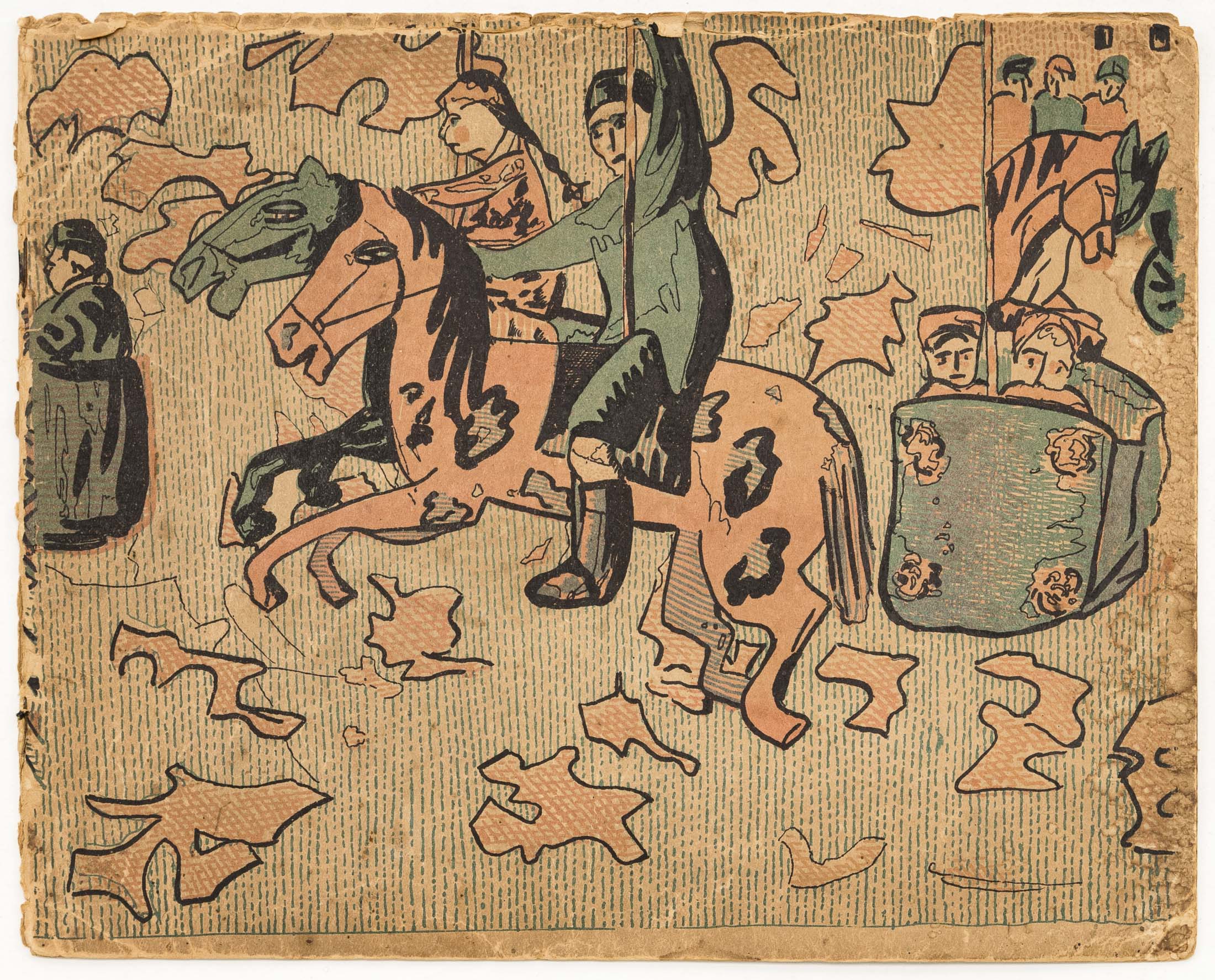 Сохранность: несколько скольчиков на листьях, реставрационные вмешательства (хвост быка, левая рука и правая нога сидящей девушки в синих одеждах).