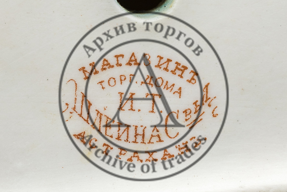 Марки: 1) печать красным «МАГАЗИНЪ // ТОРГ. ДОМА // И.Т. // ШЛЕИНА С-ВЬЯ // АСТРАХАНЬ»; 2) в тесте «1144.».