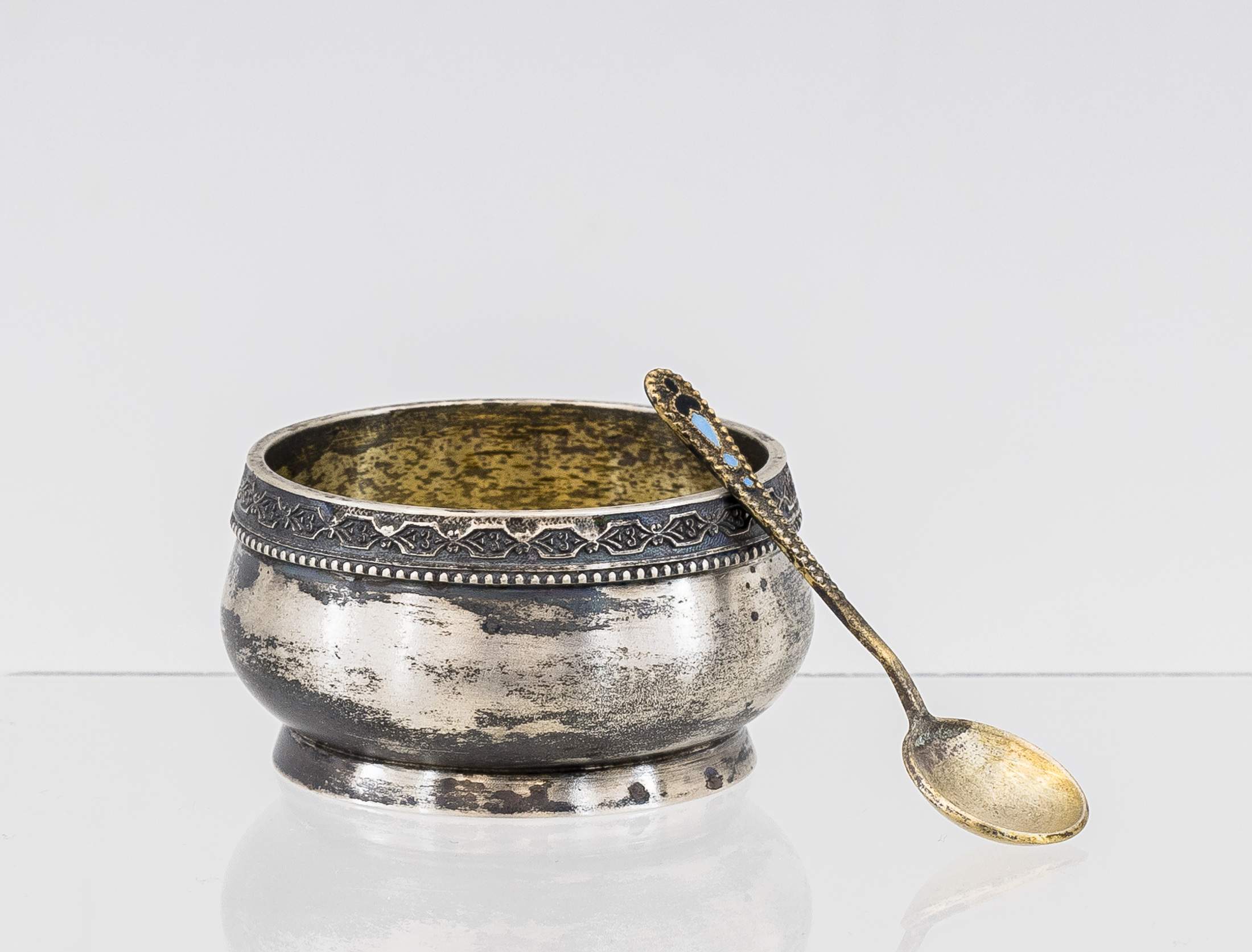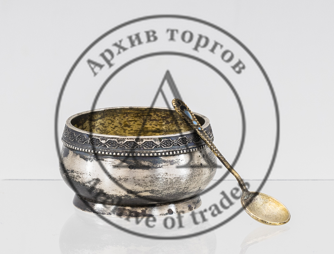 Размеры: длина ложки 5 см; у солонки диаметр ободка 4,5 см, диаметр основания 4 см, максимальная ширина 4,8 см.