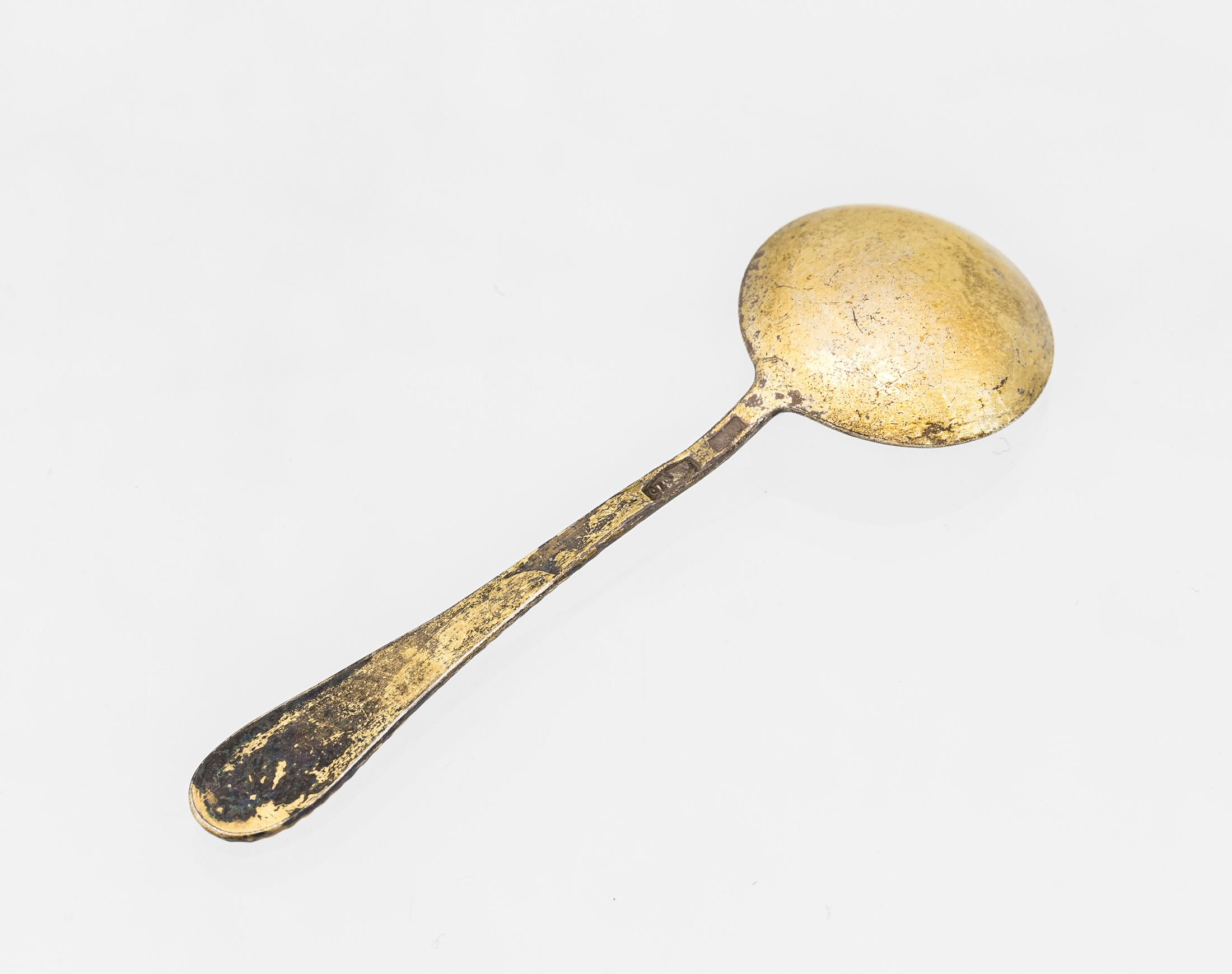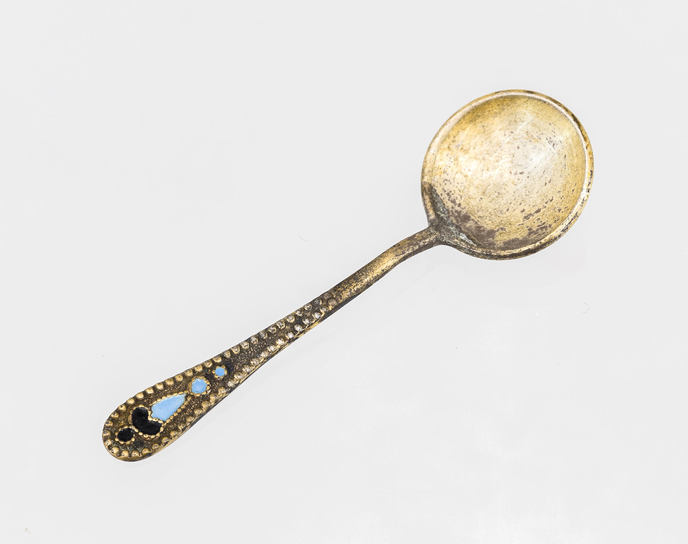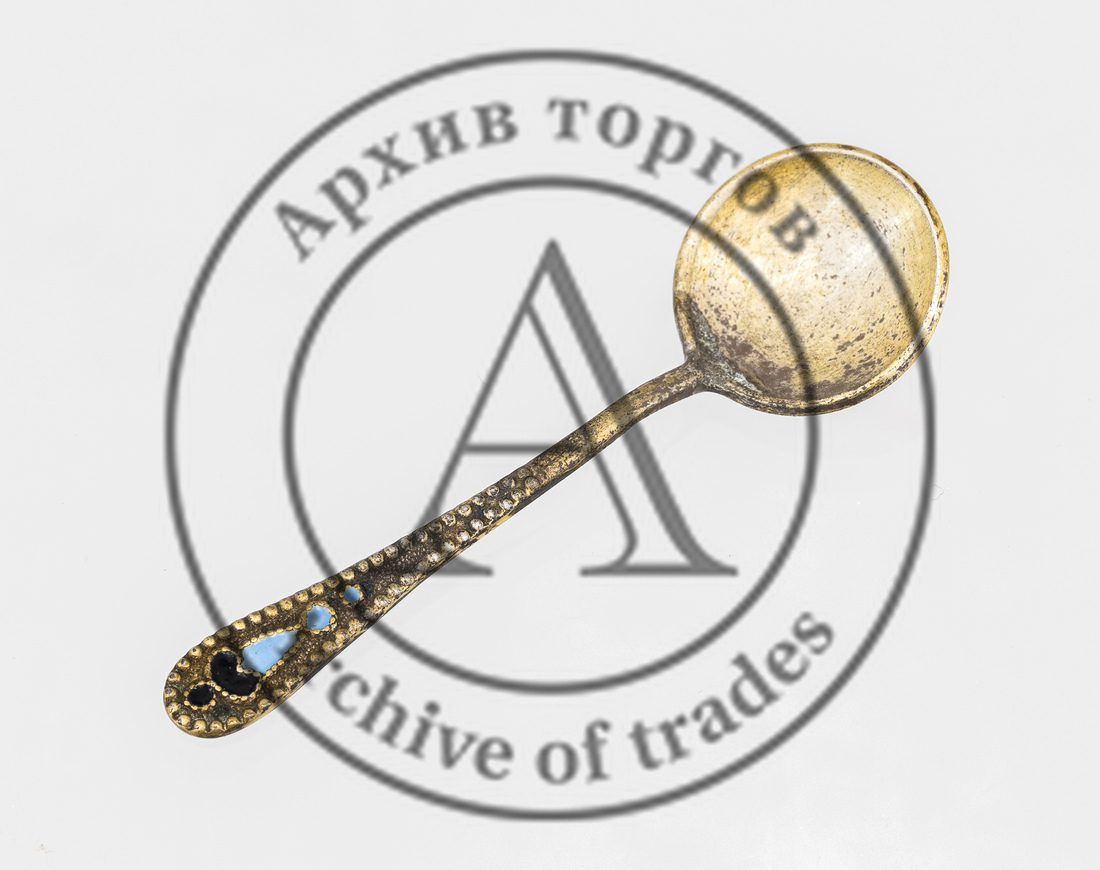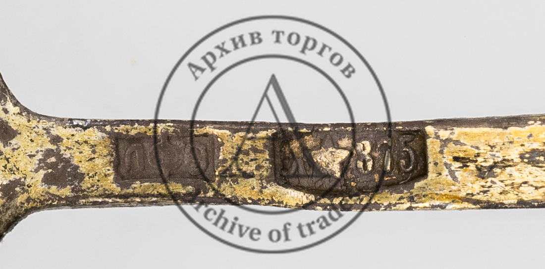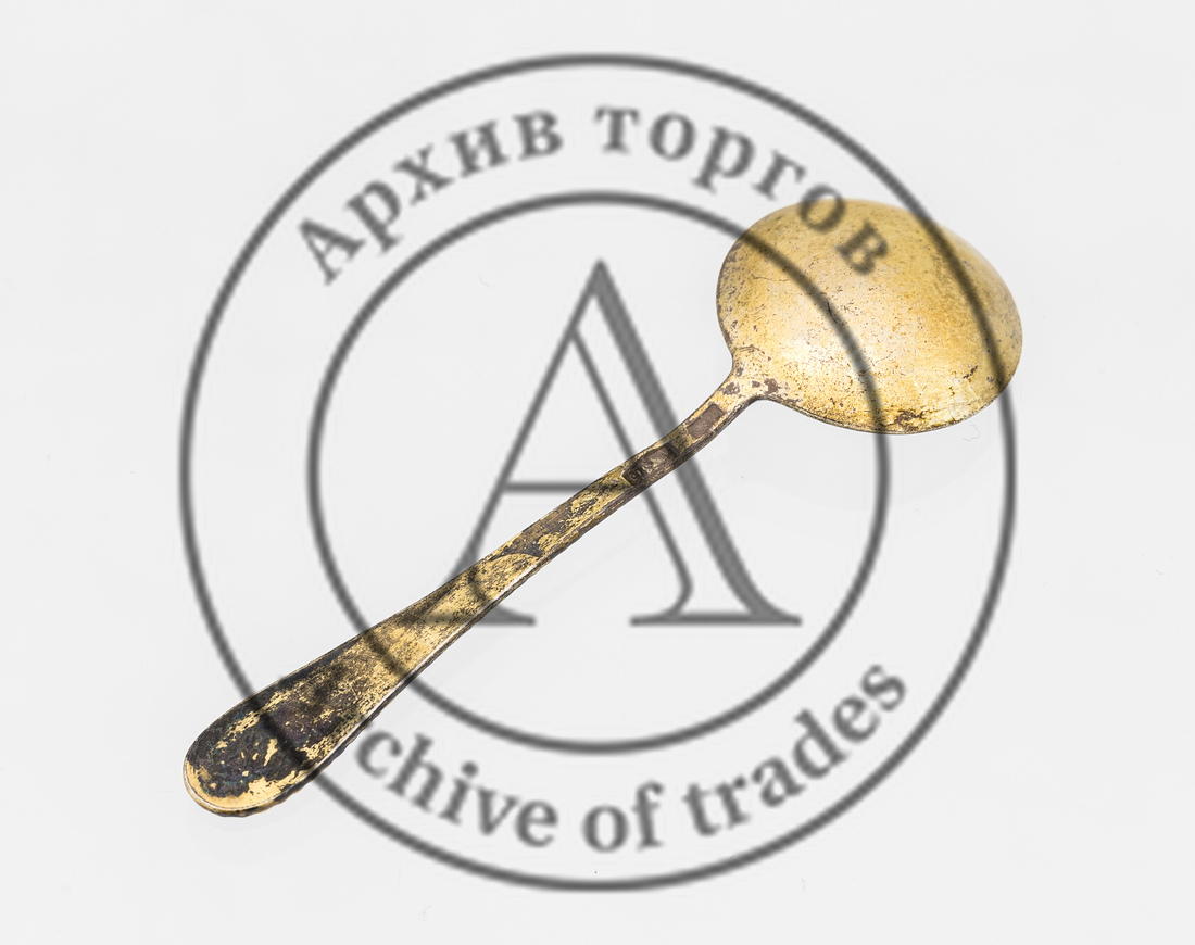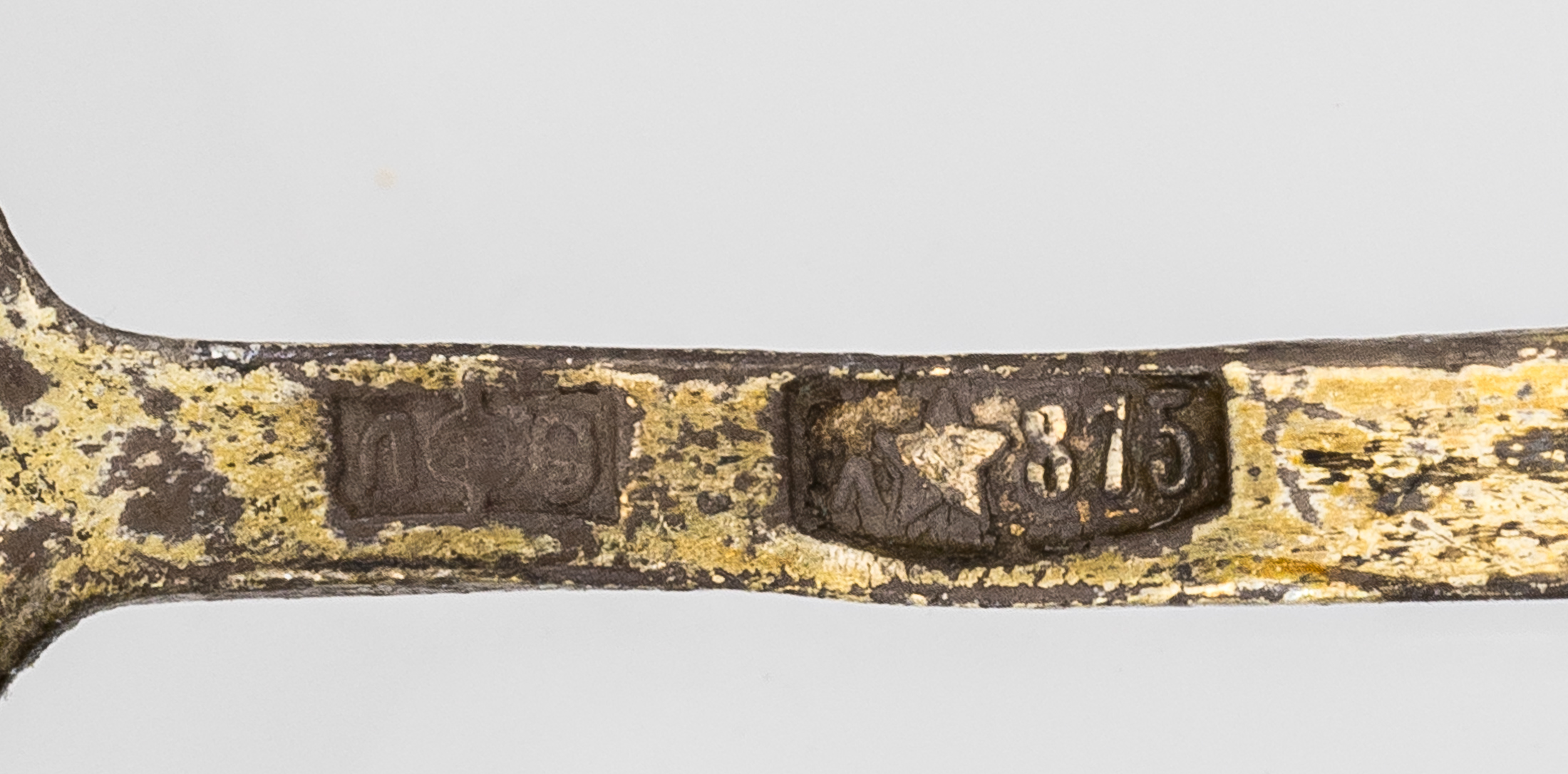 ложка 1) 875-й пробы с серпом и молотом на фоне пятиконечной звезды и литерой «л» (Северо-Западная государственная инспекция, г. Ленинград, 1958-1991 гг.); 2) «ЛФ9» в прямоугольном щитке (клеймо изготовителя);
