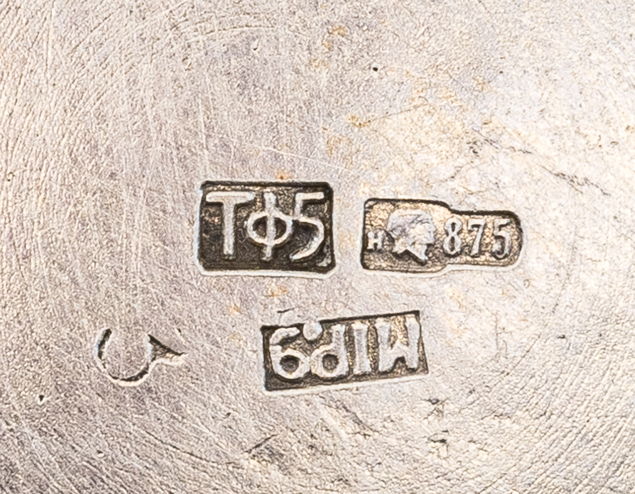 солонка 3) литера «н» (эта), голова рабочего, обращенная вправо, с молотом и «875» в щитке в форме лопатки (клеймо таллиннской пробирной инспекции 1927–1958 гг.); 4) «ТФ5» в прямоугольном щитке со скошенными углами (клеймо производителя); 5) «MIP.9» в прямоугольном щитке.