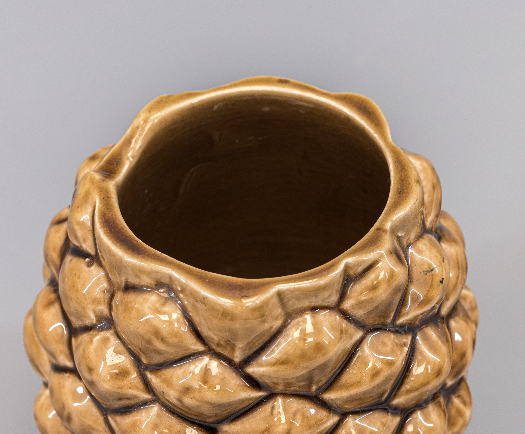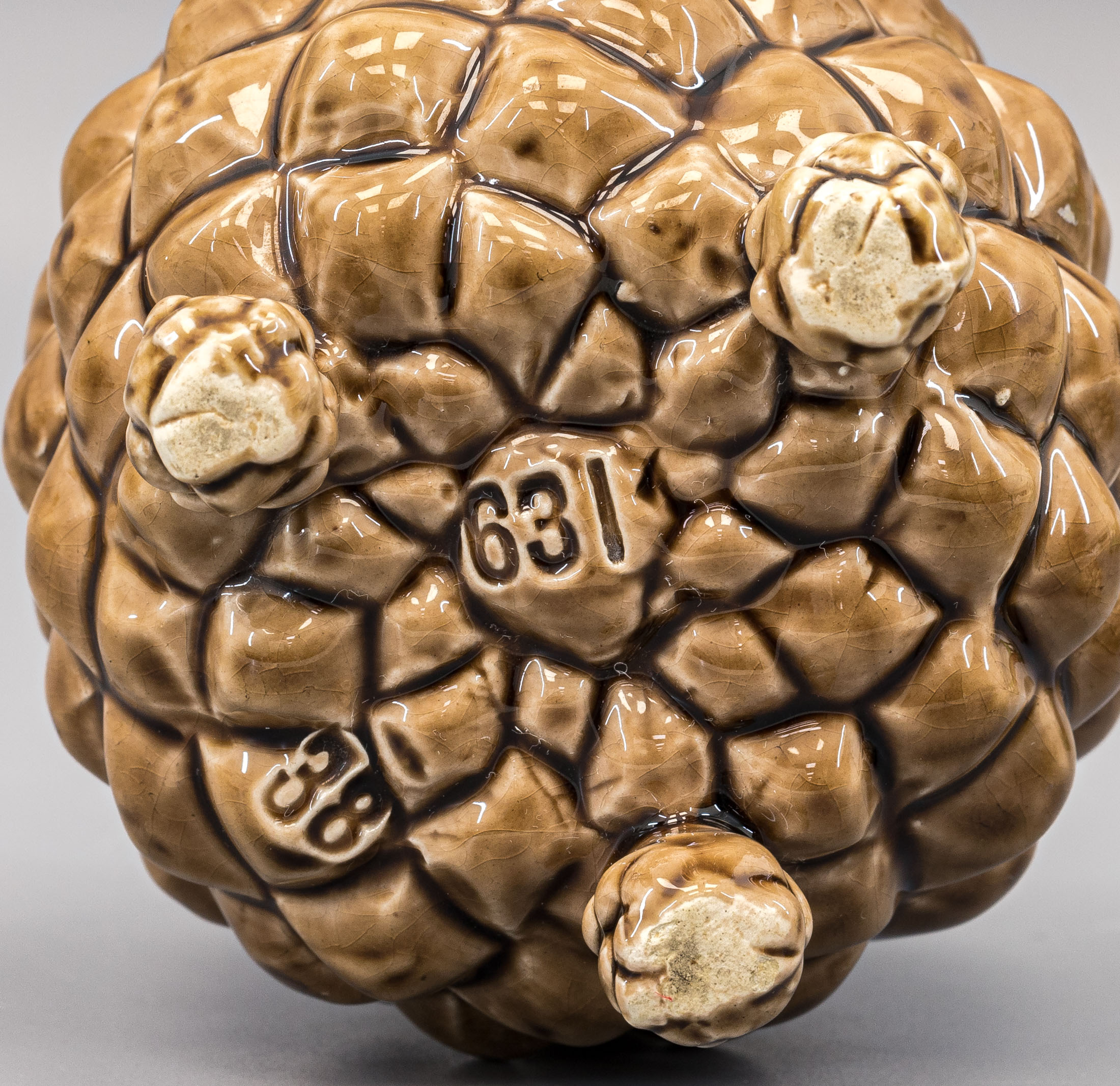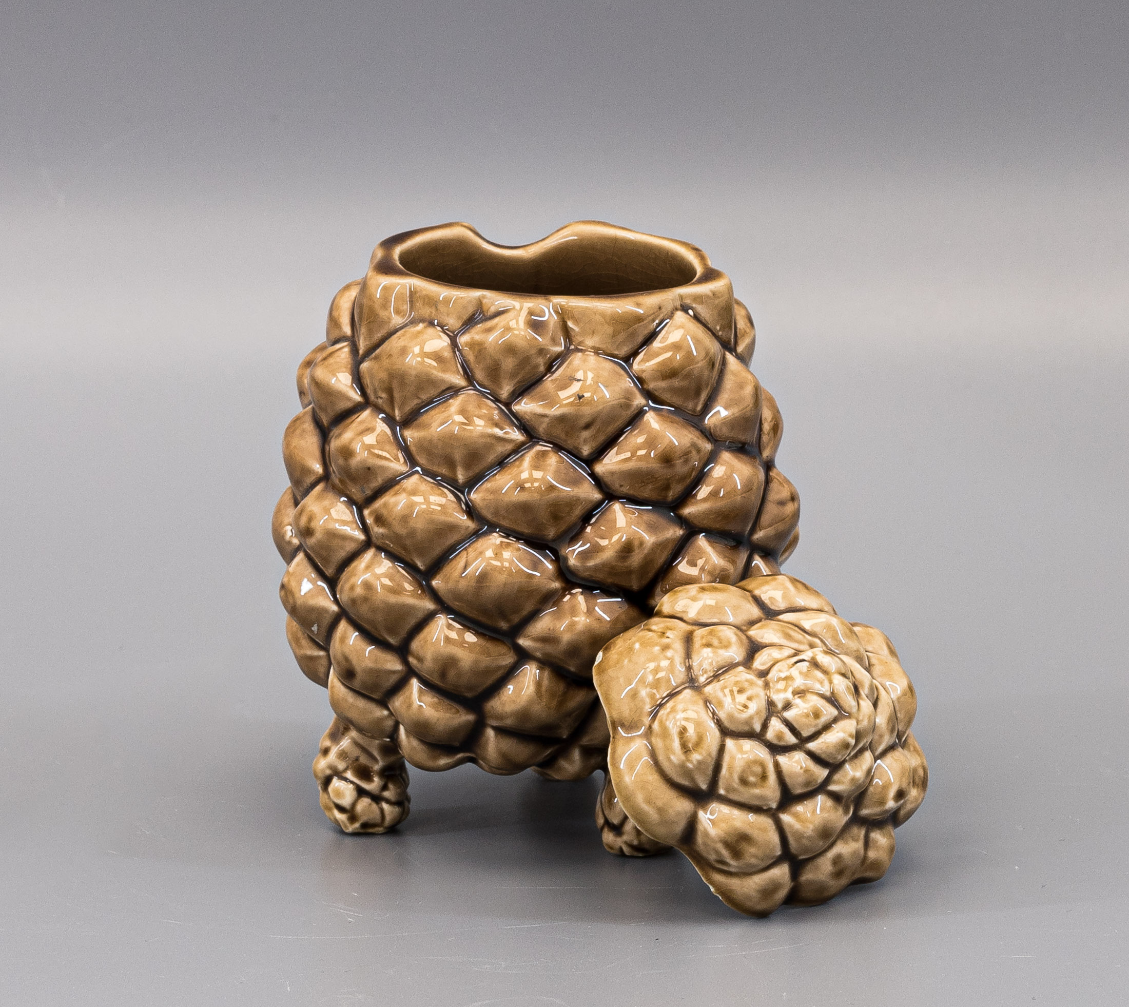 Сохранность: кракелюр, небольшой скол на внутренней стороне крышки, скольчик глазури на одной из ножек, скольчики глазури на крышке по краям и на внутренней стороне.