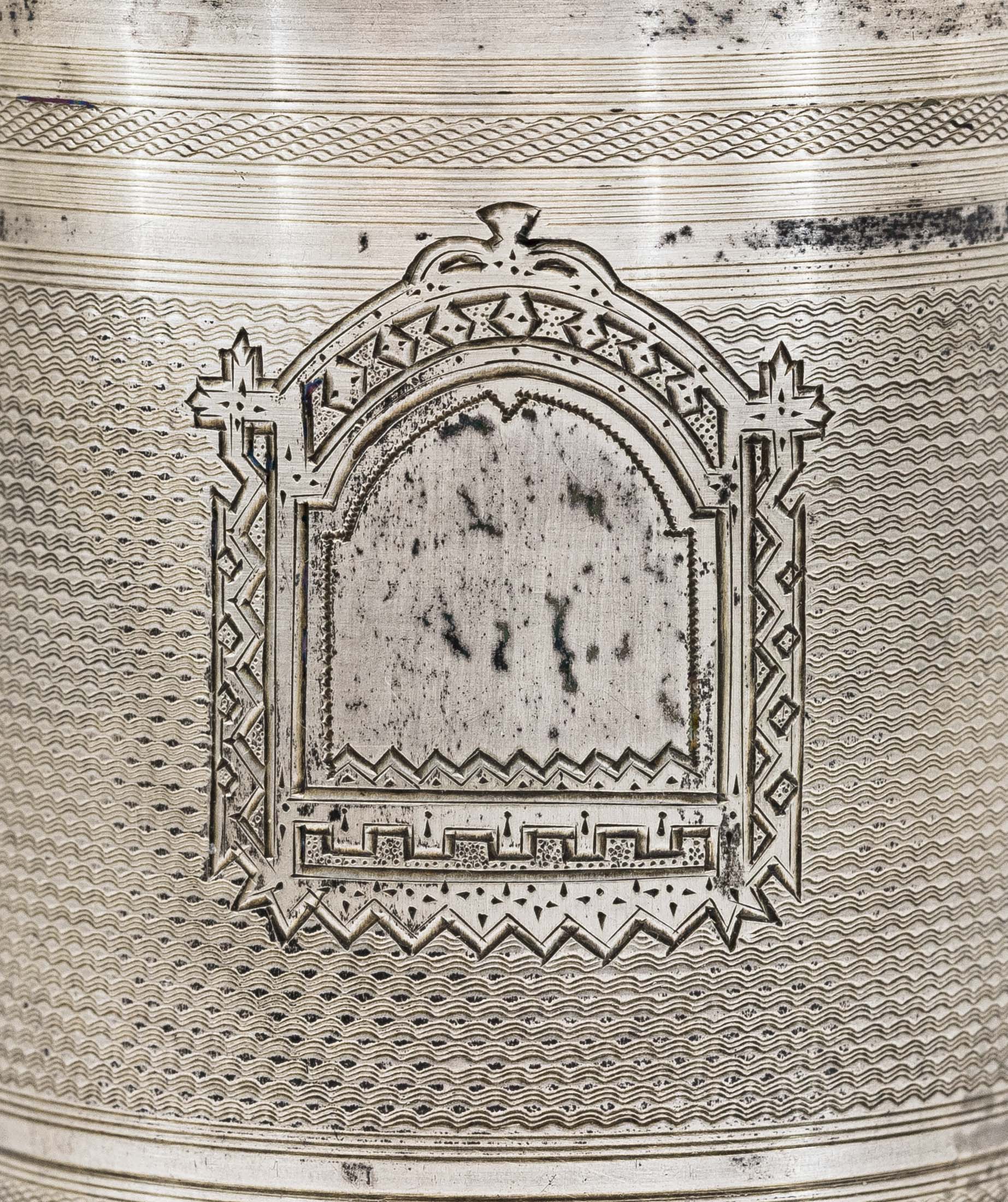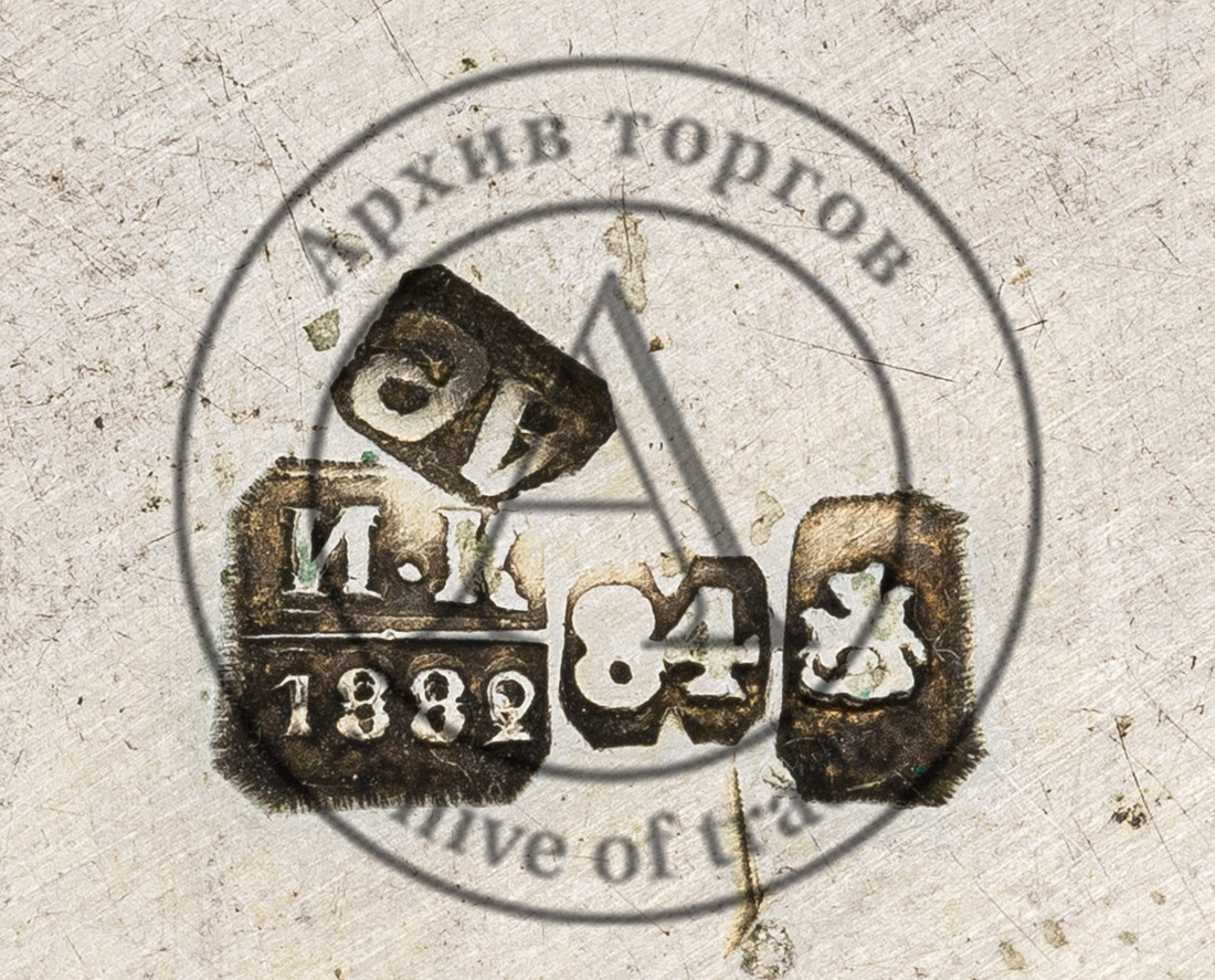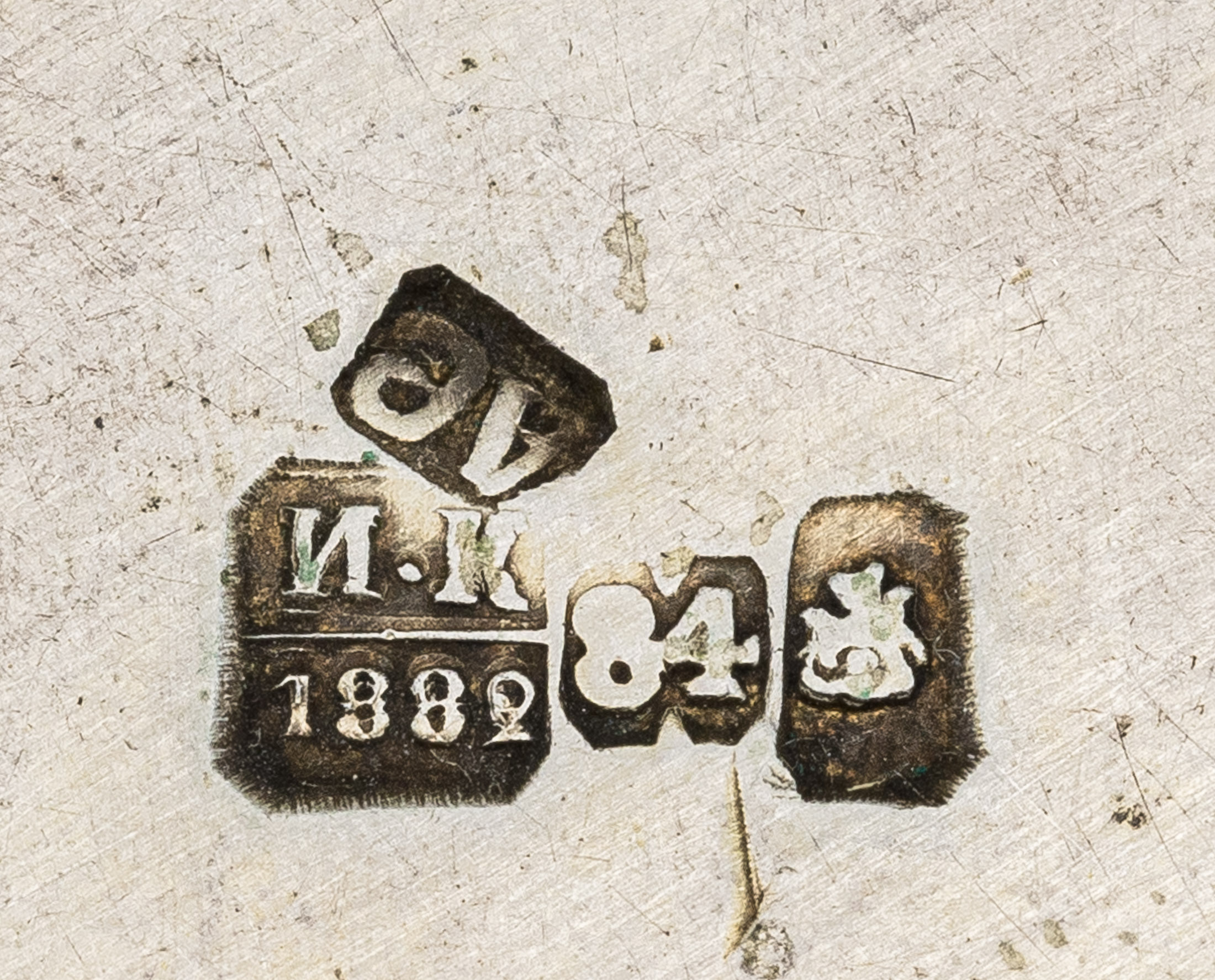 Клейма: 1-2) 84-й пробы, герб Москвы «Георгий Победоносец на коне, поражающий копьём дракона (обращен вправо)» в прямоугольных щитках со скошенными углами; 3) в прямоугольных щитках со скошенными углами клеймо пробирного мастера «И·К» (неизвестный пробирный мастер, 1872–1881 гг.) над датой «1882»; 4) именник «АС» в прямоугольном щитке со скошенными углами.