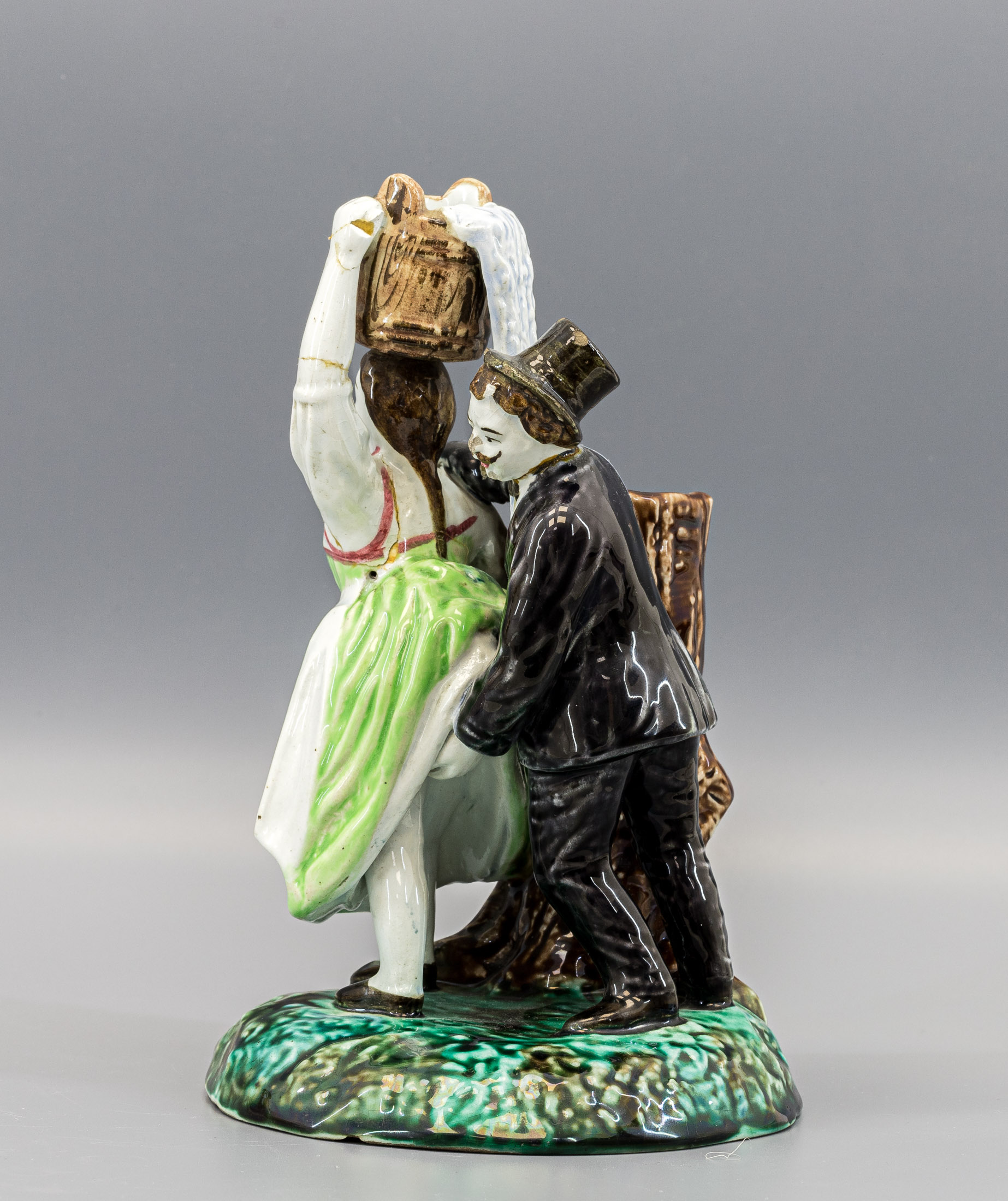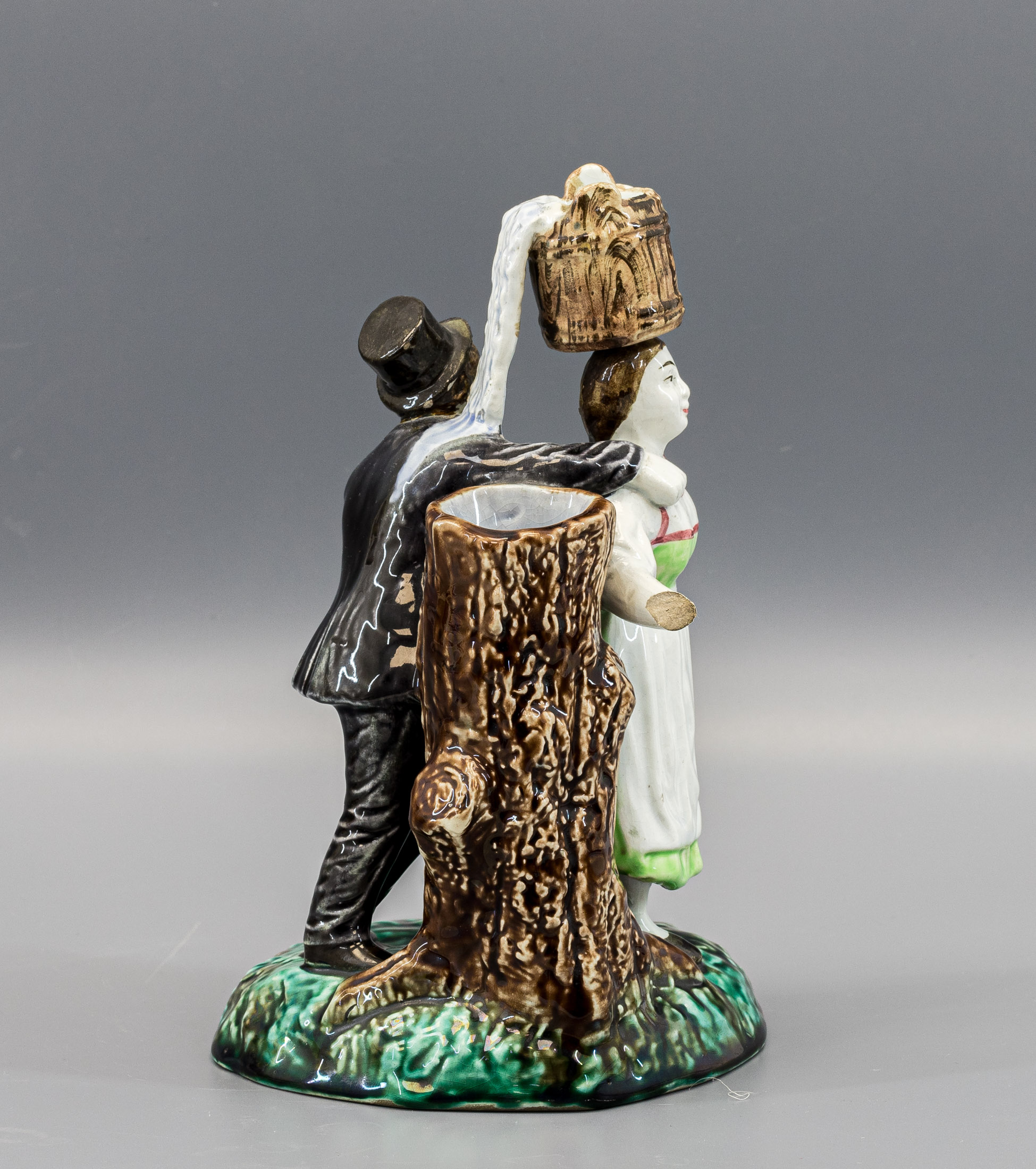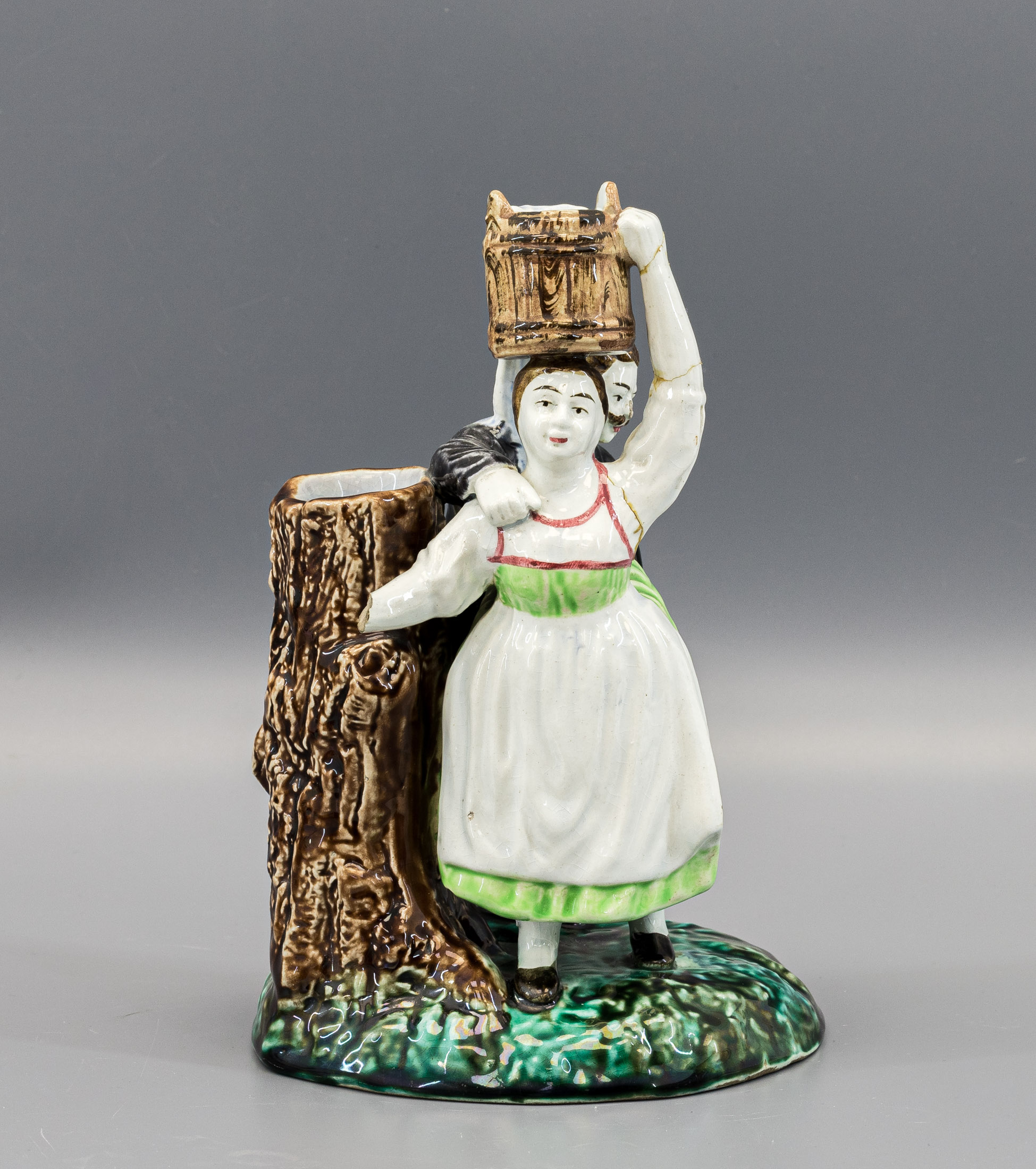 Сохранность: кракелюр; сколы глазури на верхних частях фигур и ведре; скол на исподе дна, следы клея; у мужчины склейка на шее, скол на носу; у девушки от плеча склейка левой руки с утратой пальца, утрата фрагмента правой руки.