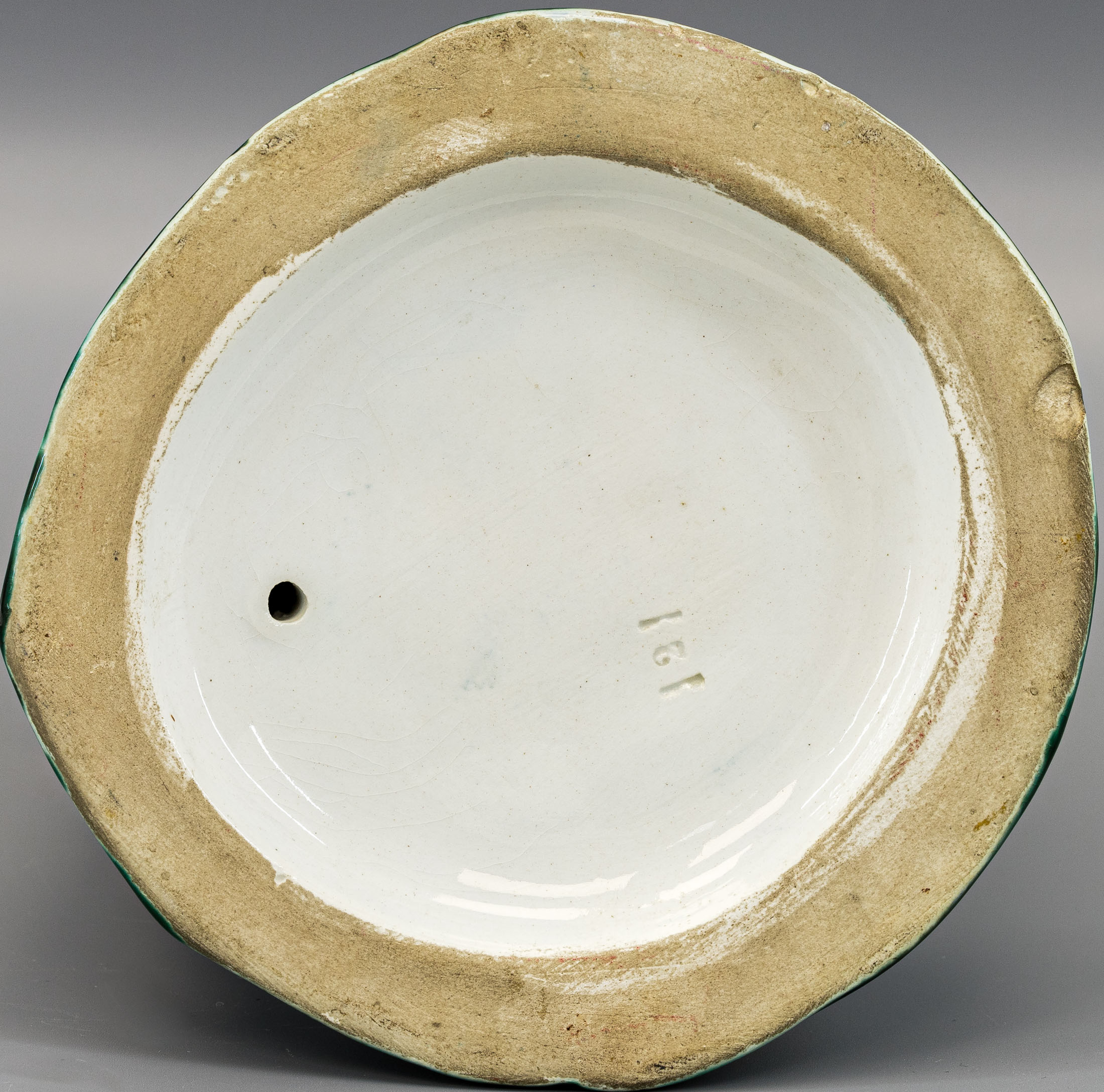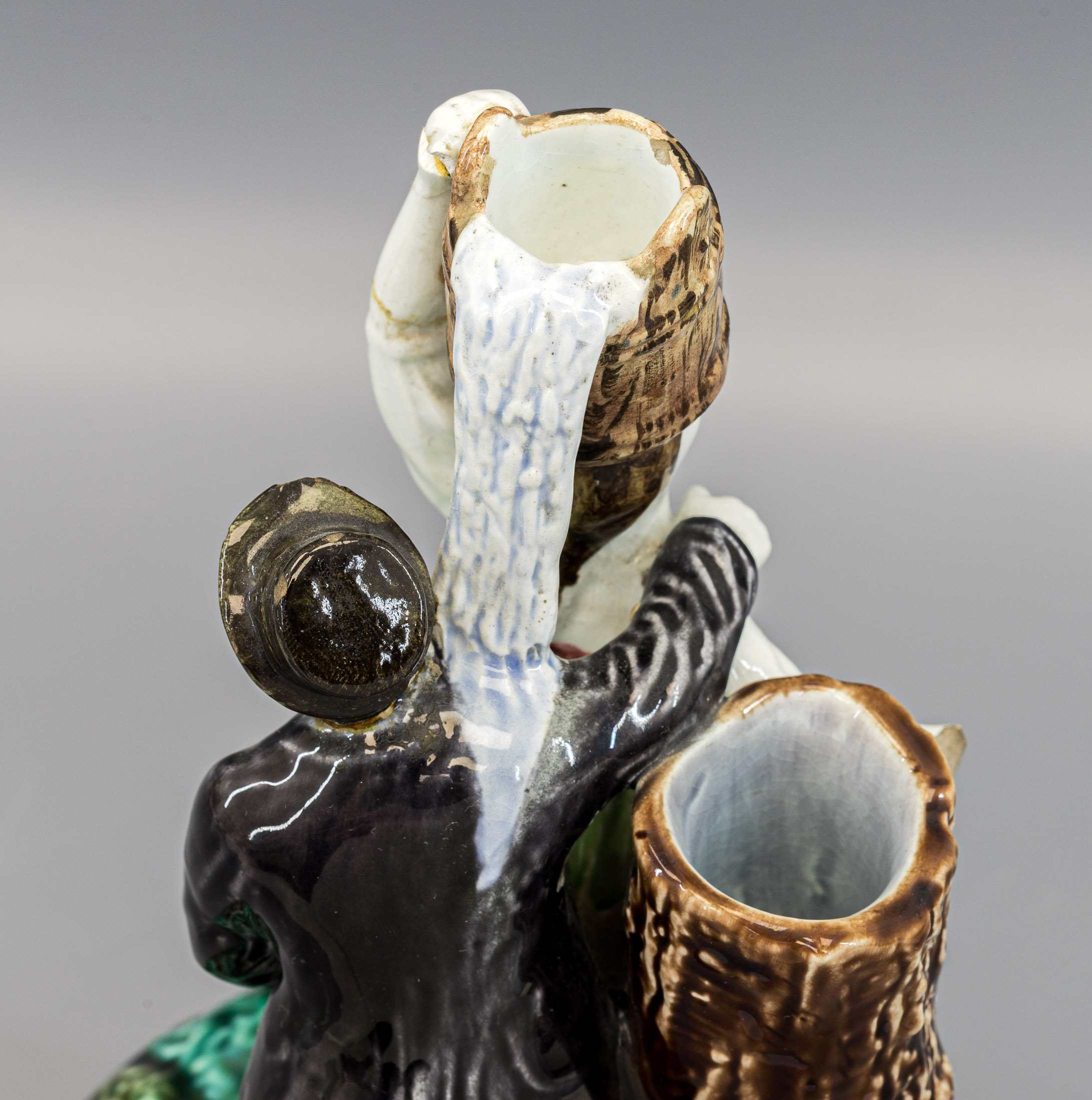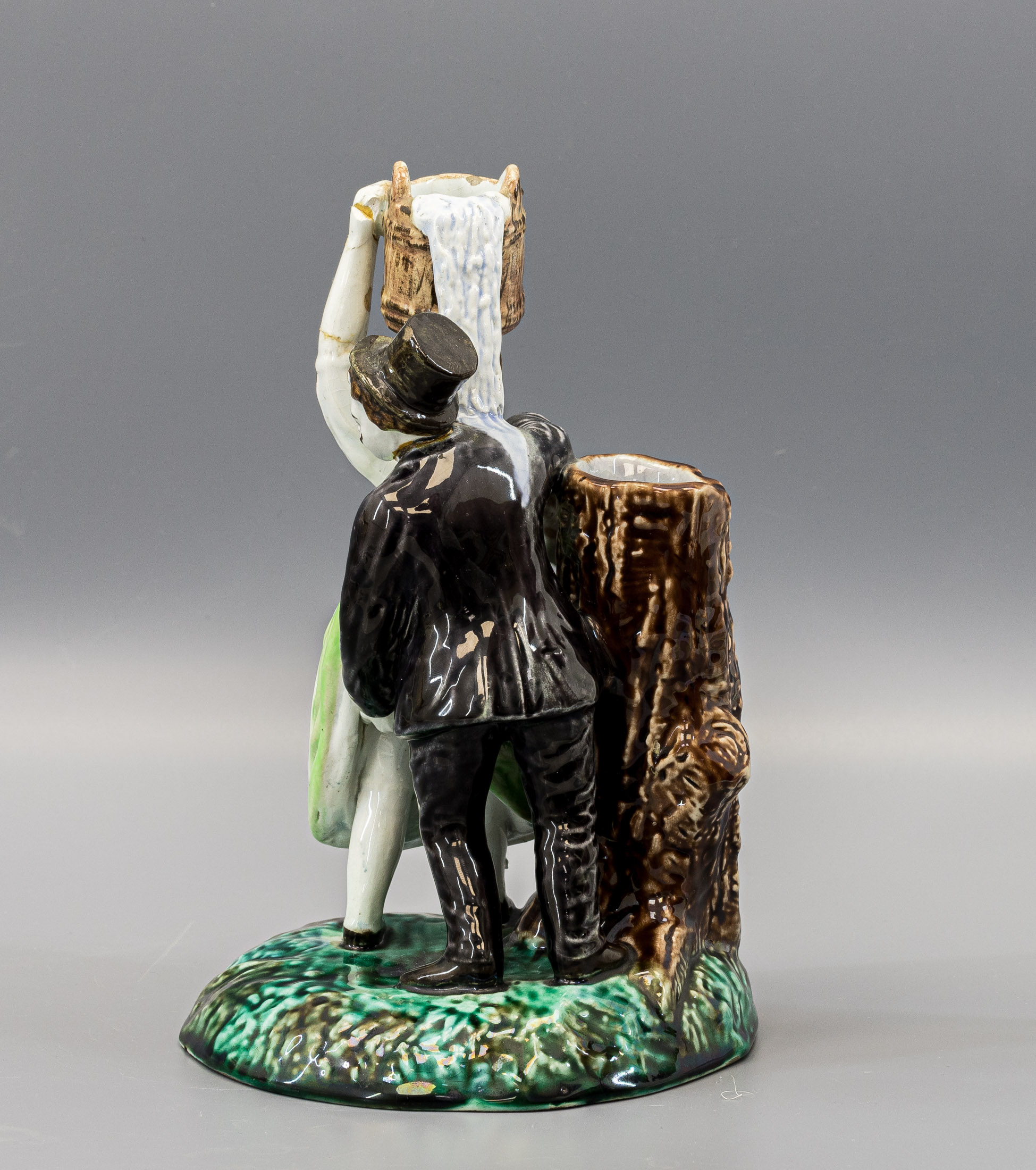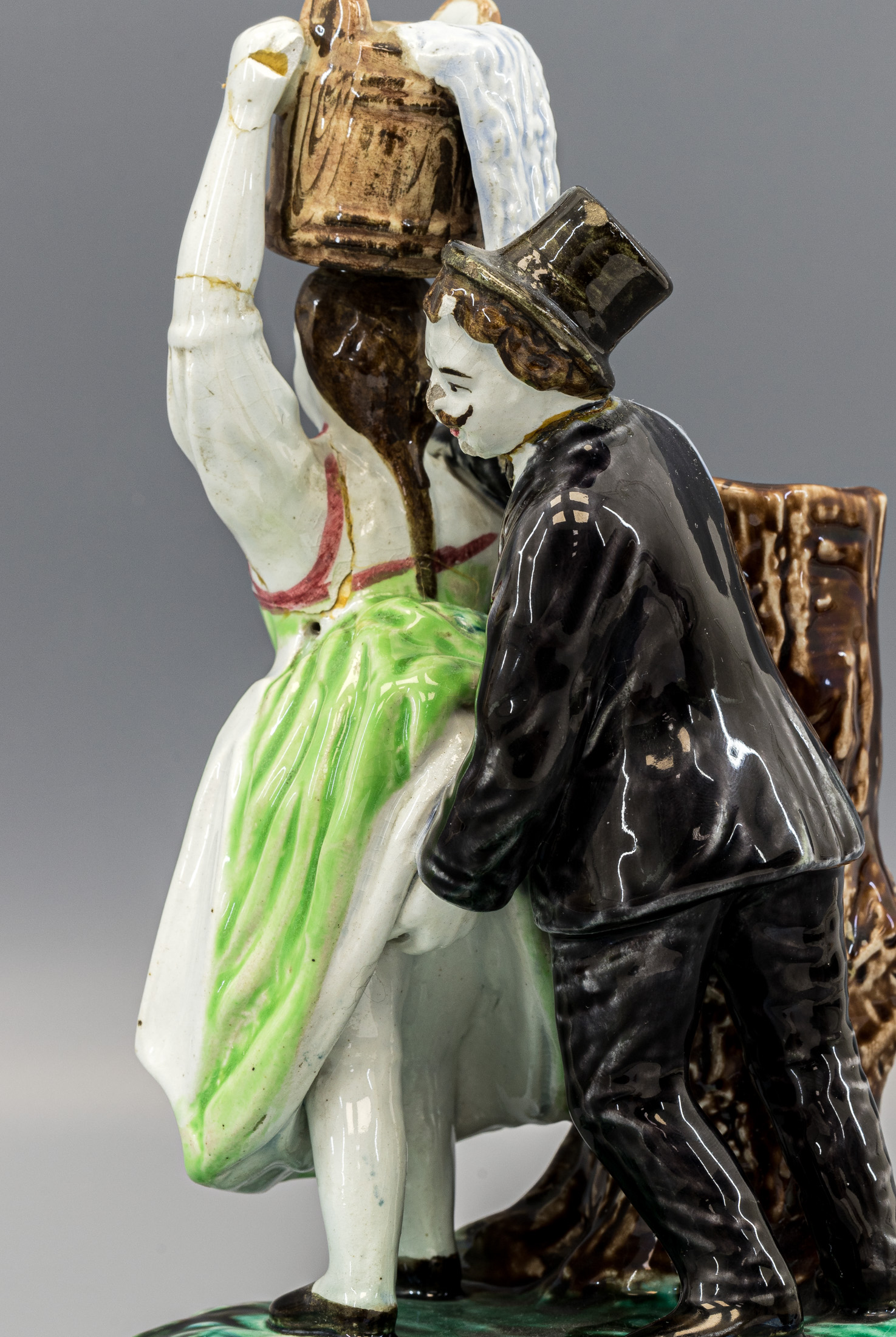 Сохранность: кракелюр; сколы глазури на верхних частях фигур и ведре; скол на исподе дна, следы клея; у мужчины склейка на шее, скол на носу; у девушки от плеча склейка левой руки с утратой пальца, утрата фрагмента правой руки.