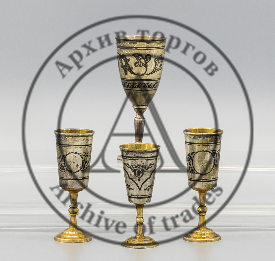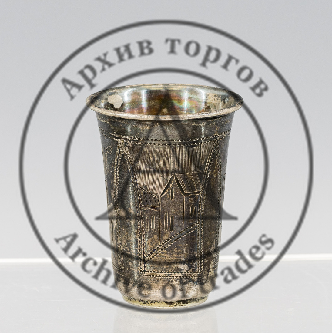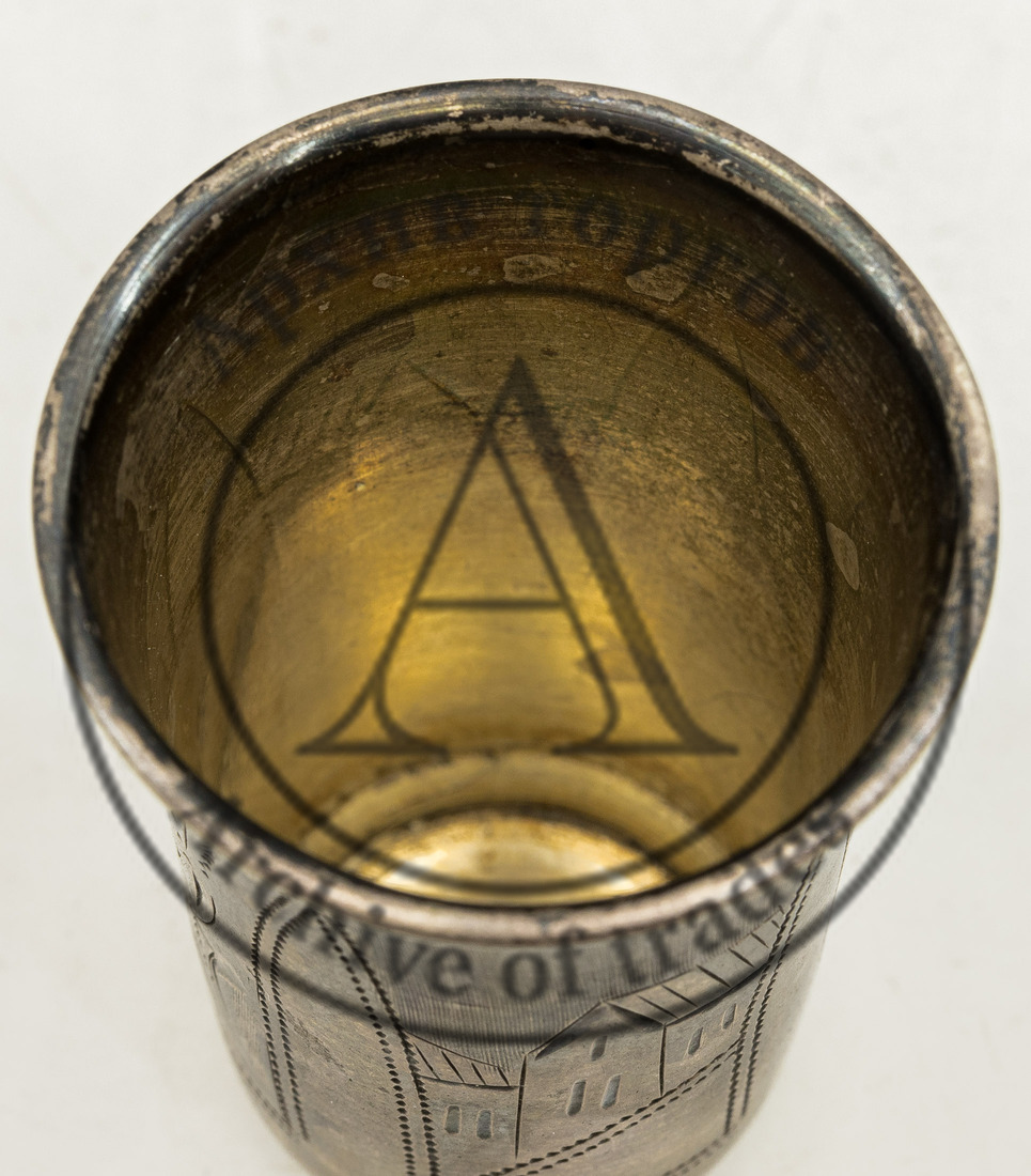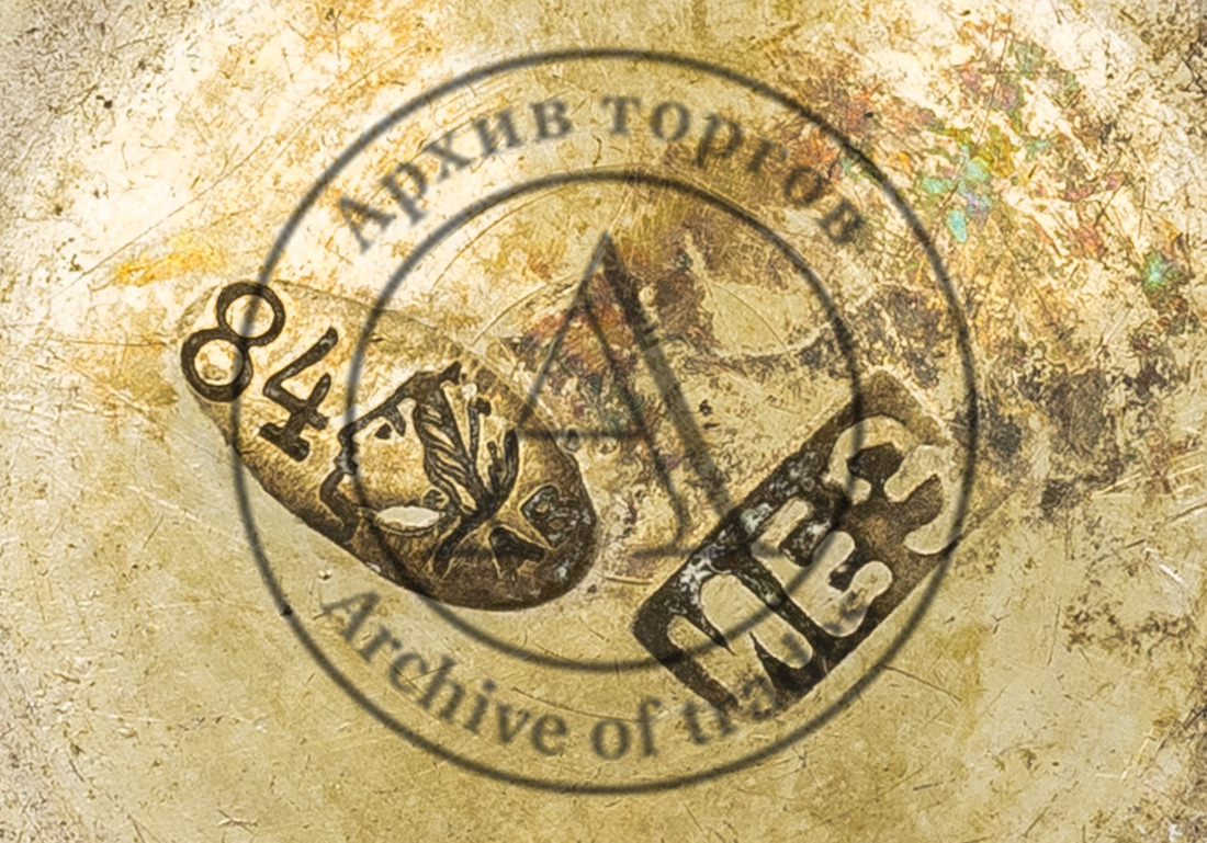 Клейма: 1) «84» (обозначение пробы) и «женская голова в кокошнике, обращенная влево» и инициалами «АВ» в овальном щитке (клеймо Киевского пробирного управления, с инициалами пробирного инспектора Александра Казимировича Выржиковского, 1899–1908 гг.); 2) именник «ИЕЗ» в прямоугольном щитке.