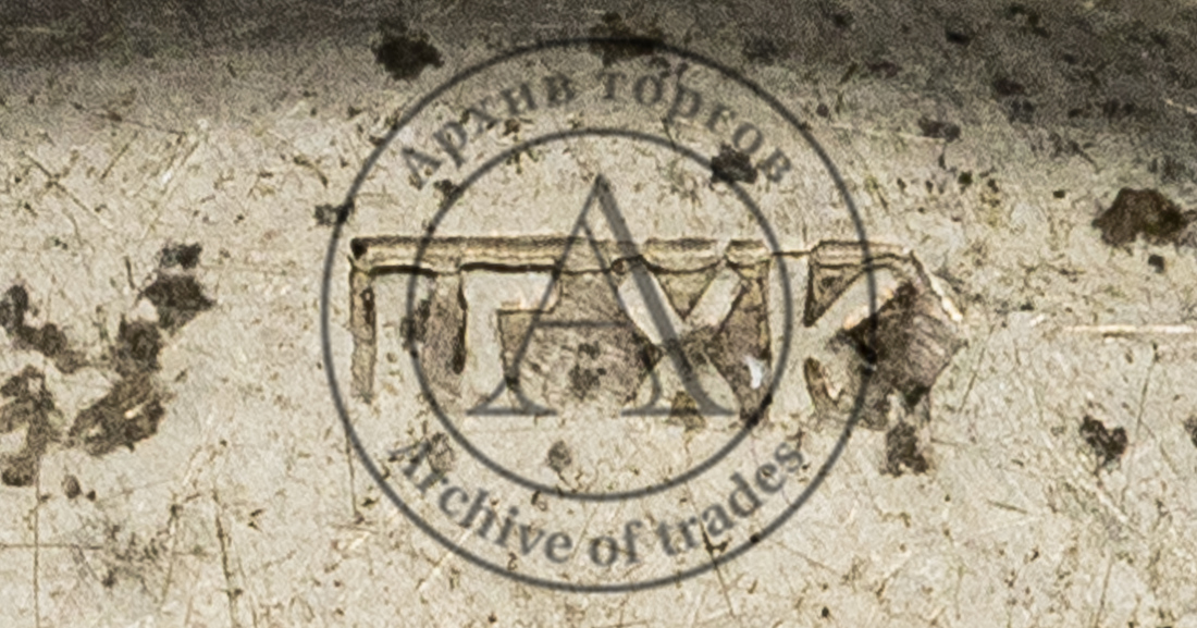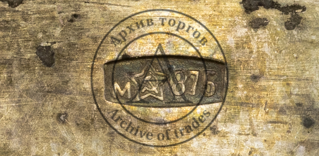Клейма: 1) 875-й пробы с «серпом и молотом внутри пятиконечной звезды» и шифром московского пробирного управления (литерой «м») в щитке в виде прямоугольника с выпуклыми противоположными сторонами; 2) клеймо производителя «1ГХК» (?) в фигурном щитке.