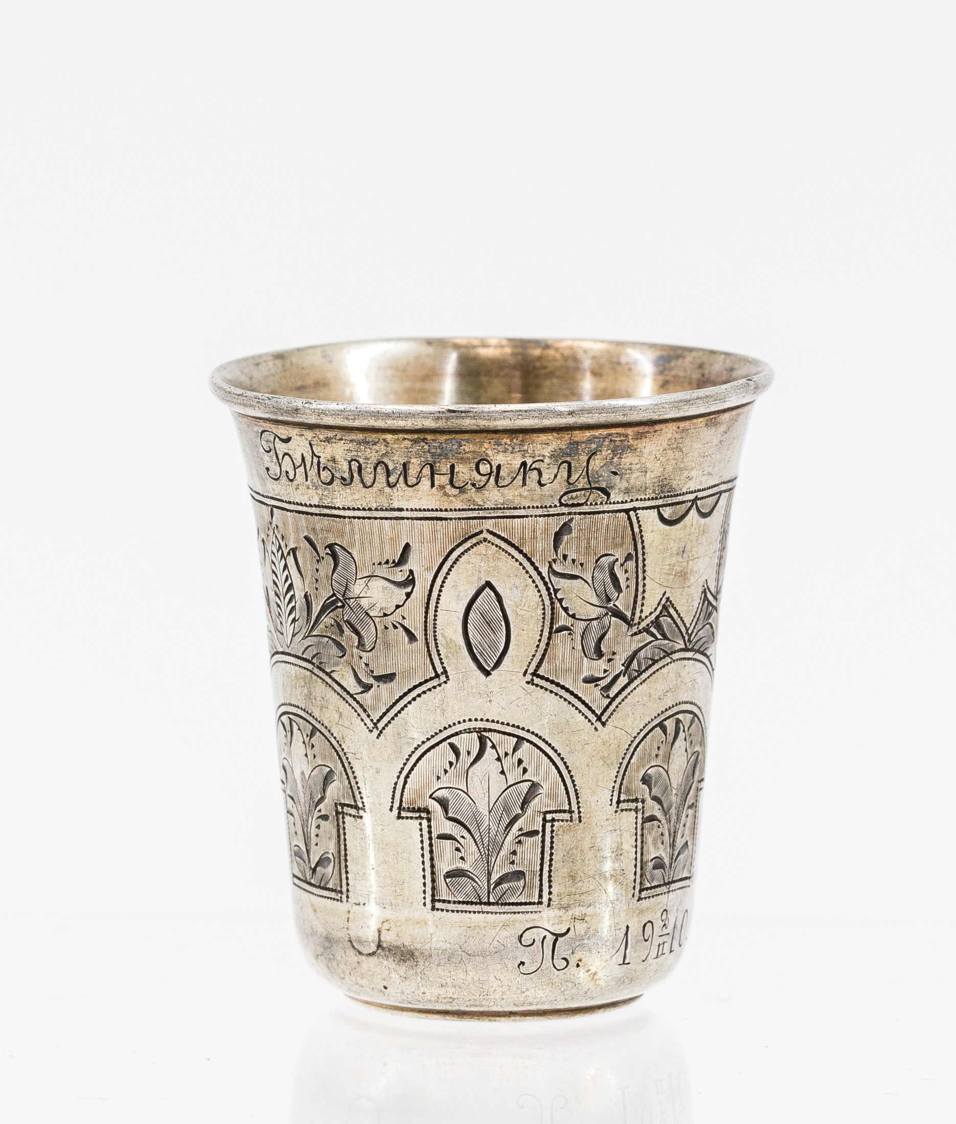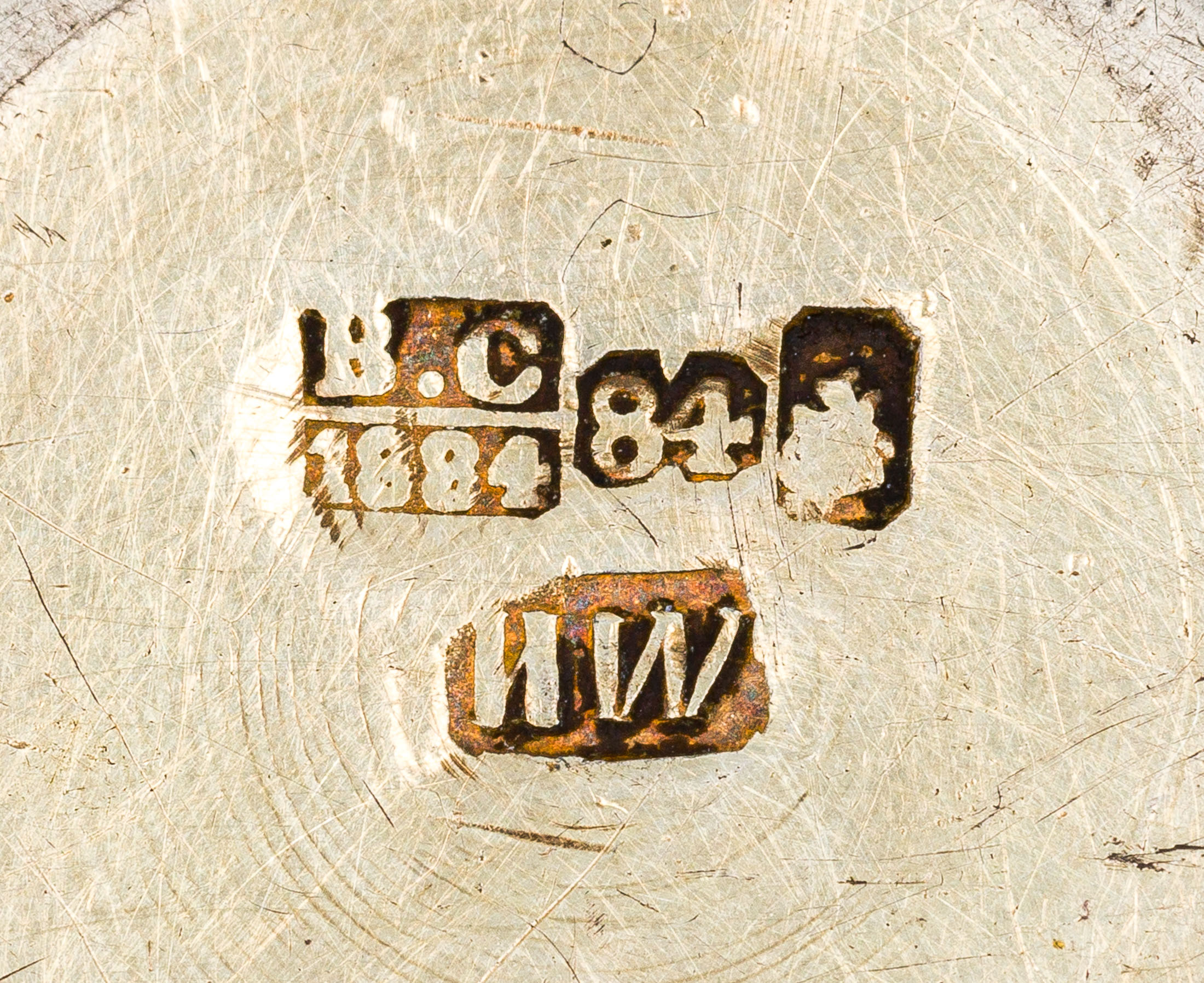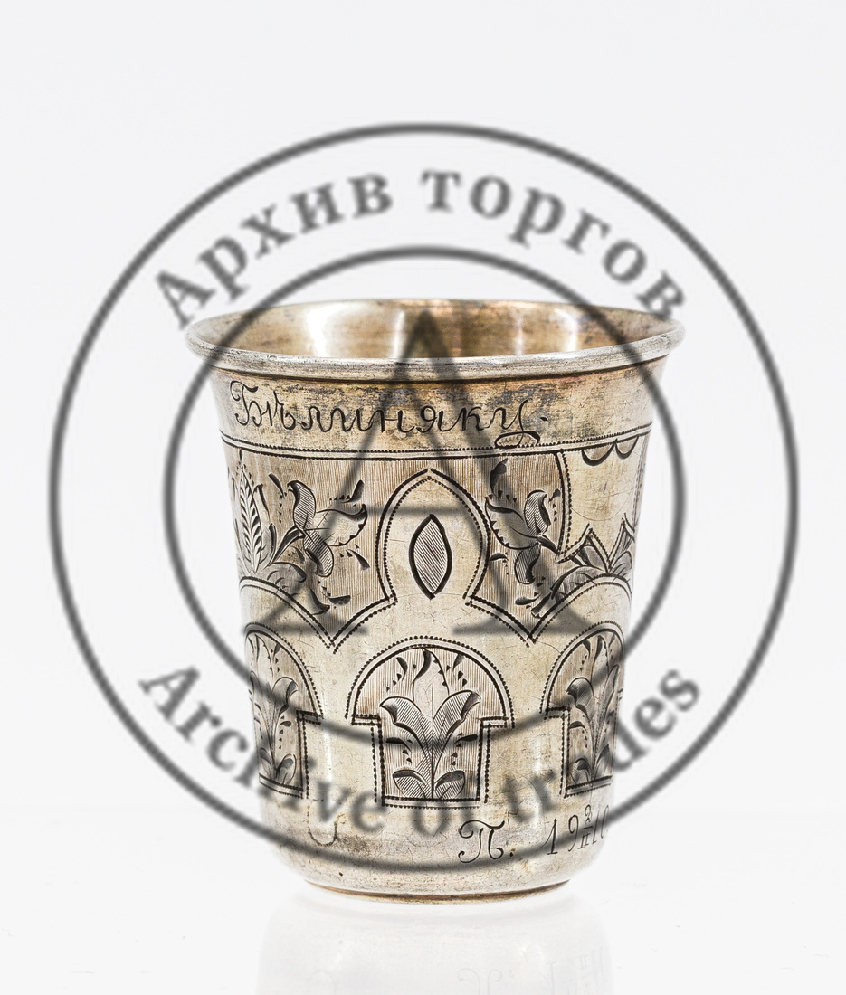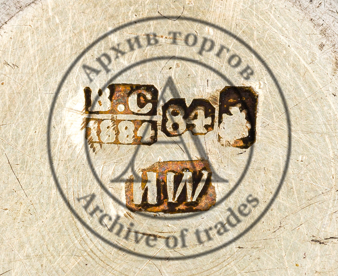 Клейма: 1) 84-й пробы в фигурных щитках со скошенными углами; 2) клеймо Московского пробирного управления — герб Москвы «Георгий Победоносец на коне, поражающий копьём дракона (обращен вправо)» в прямоугольном щитке со скошенными углами; 3) инициалы пробирного мастера «В.С» (Виктор Савинков, 1855-1888 гг.), снизу дата 1884; 4) именник «МИ» в прямоугольном щитке (Иванов Максим или Иванов Михаил, серебряного дела мастер, 1874–1890 гг.).
