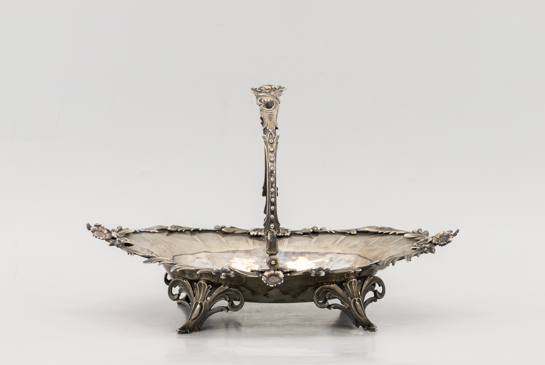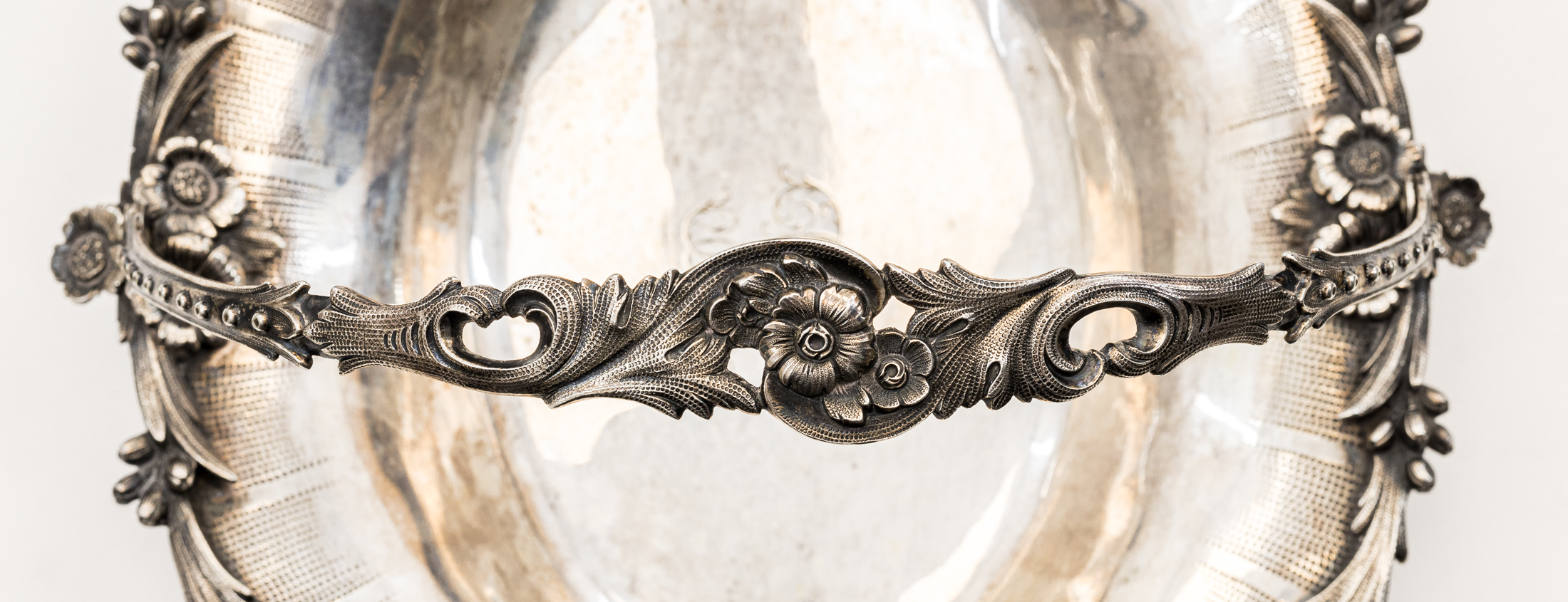 Серебро 900° (основная часть), 950° (ручка, детали), штамп, гравировка, литье, канфарение; накладное серебро.