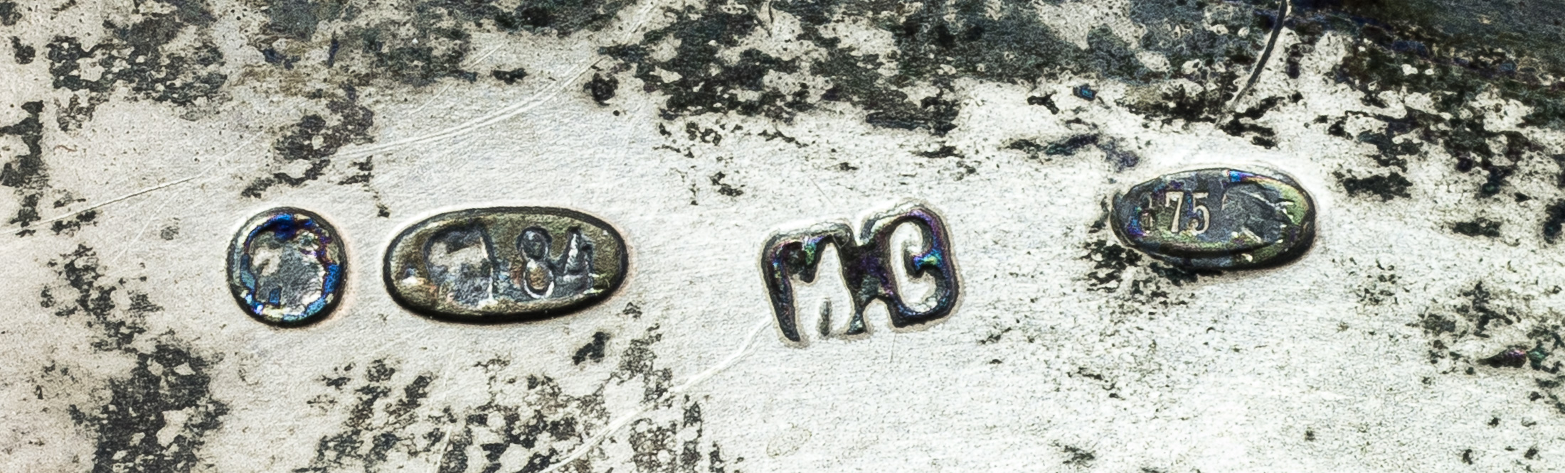 5) клеймо московского окружного пробирного управления: обозначение пробы «875» с «головой рабочего, обращенного вправо, с молотком» в овальном щитке и Δ (дельта) (московского окружного пробирного управления, 1927–1946 гг.).