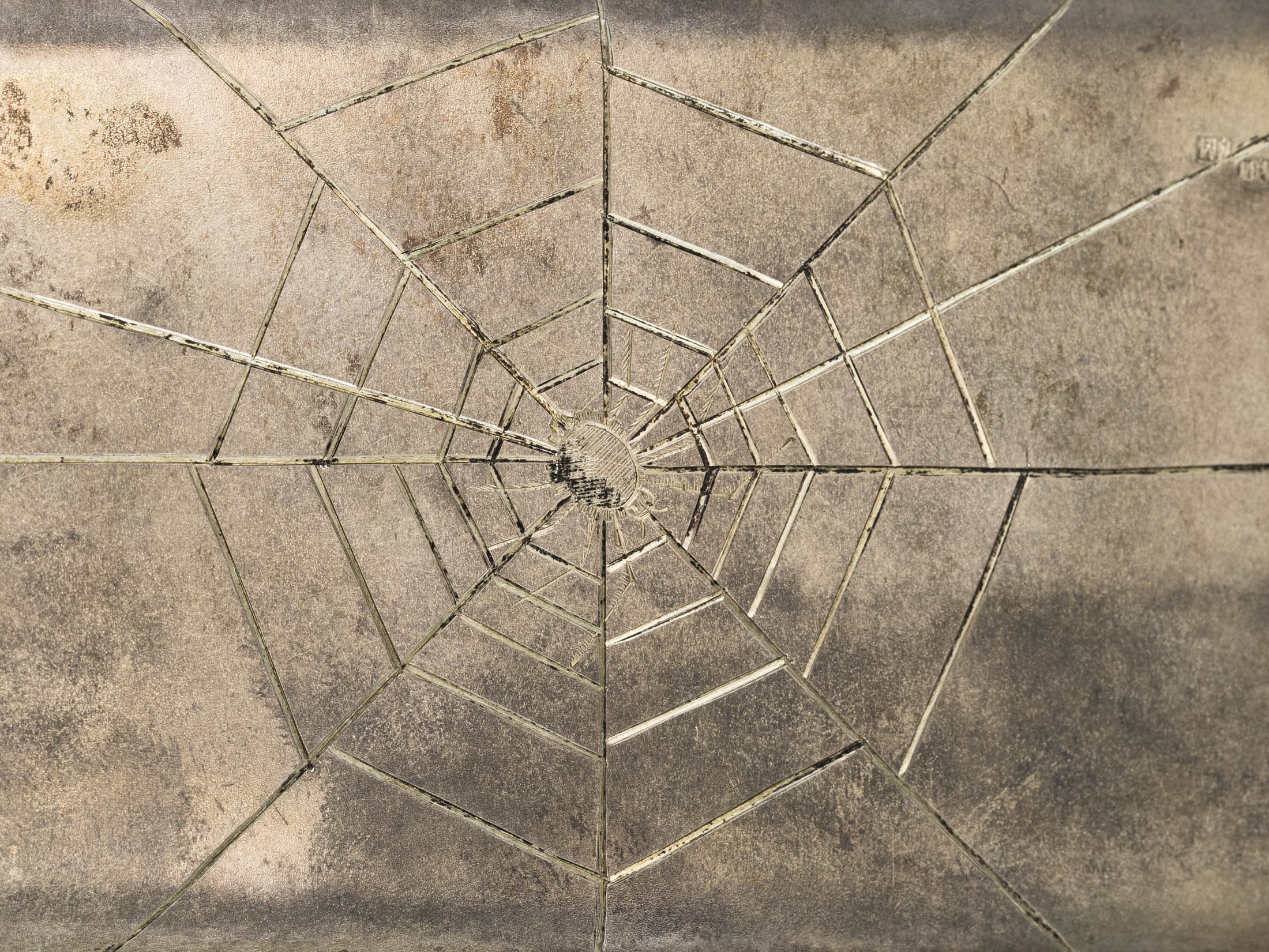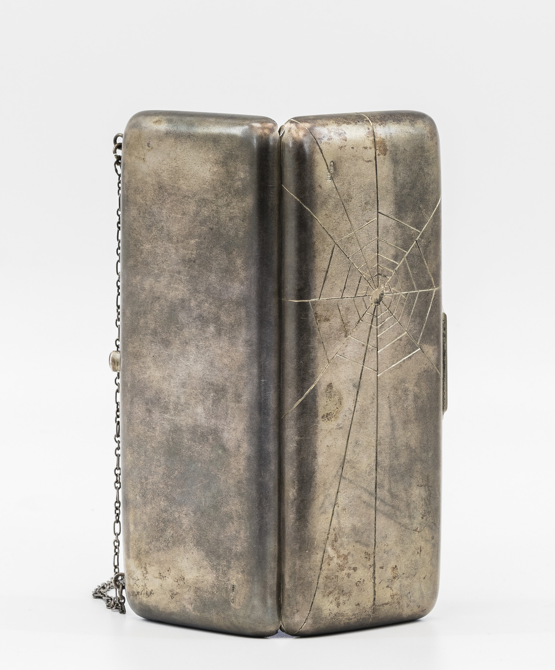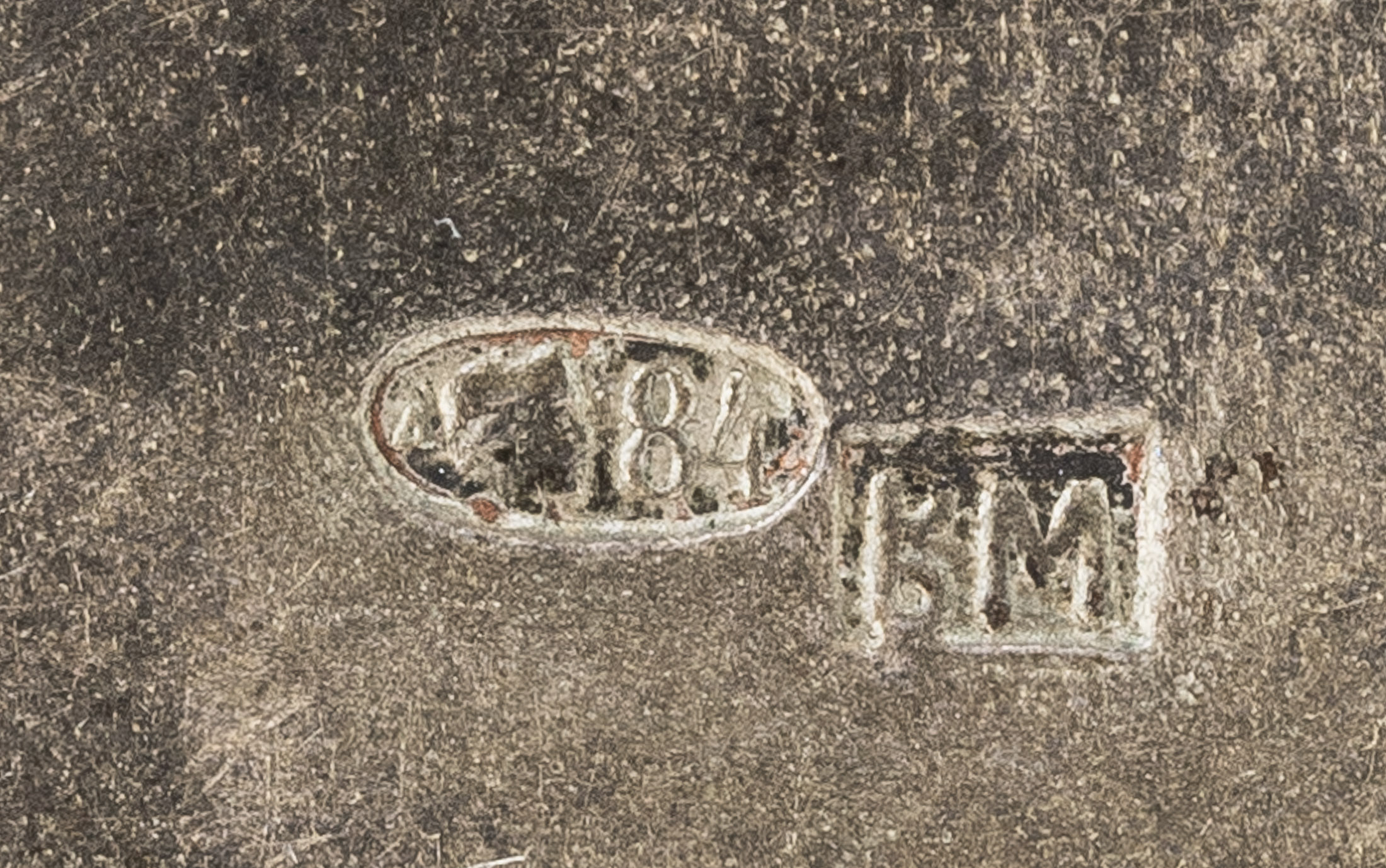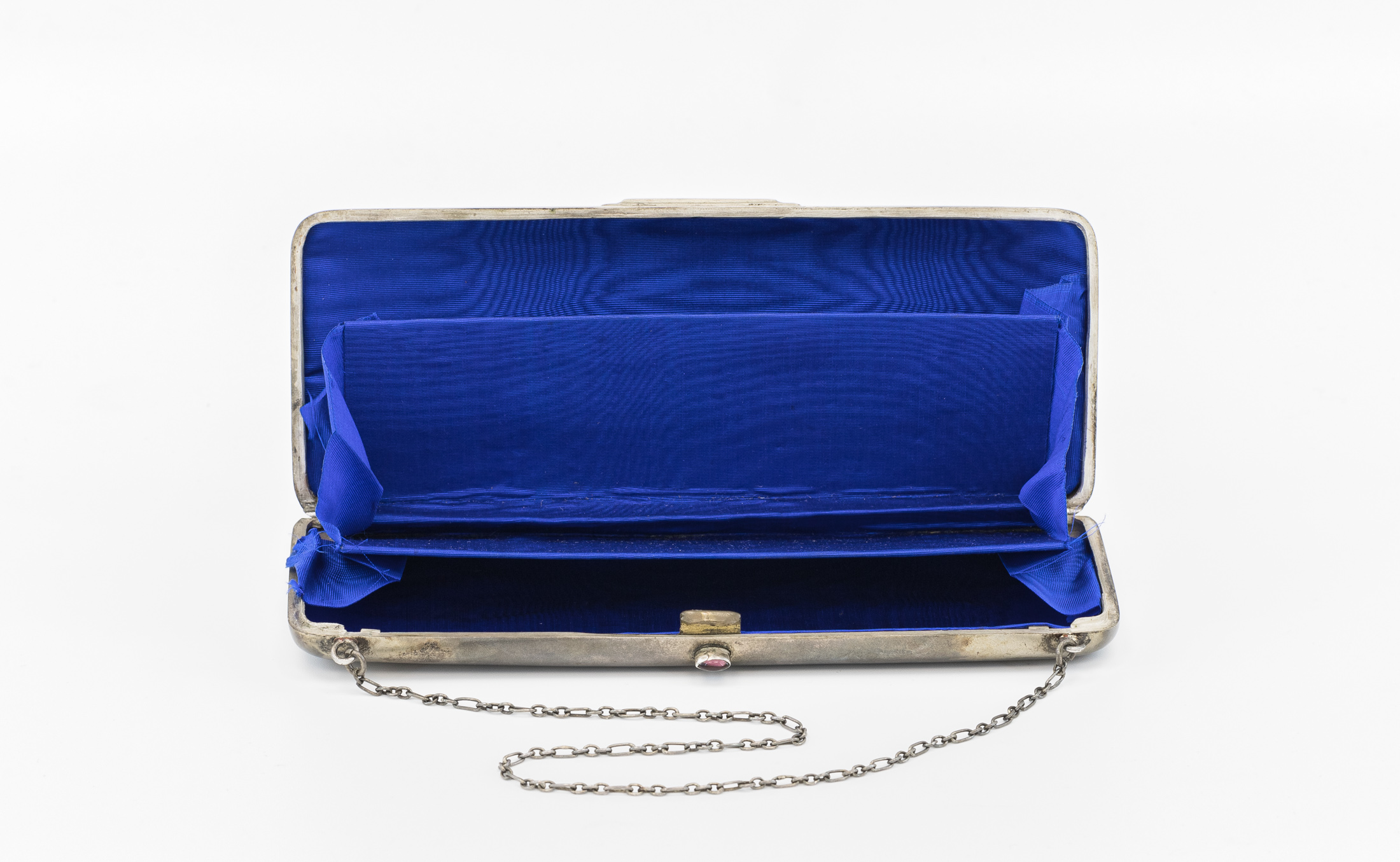 Клейма: на сумочке на обеих сторонах 1) в овальном щитке «женская голова в кокошнике, обращенная вправо» с шифром московского пробирного округа («Δ», дельта) и обозначением пробы «84»; 2) «ВМ» в прямоугольном щитке (Михайлов Василий Михайлович (?), владелец ювелирного заведения, упоминается в 1898 году, Крымский вал, дом Гусева); на цепочке в нескольких местах 3) «женская голова в кокошнике, обращенная вправо, в круглом щитке.