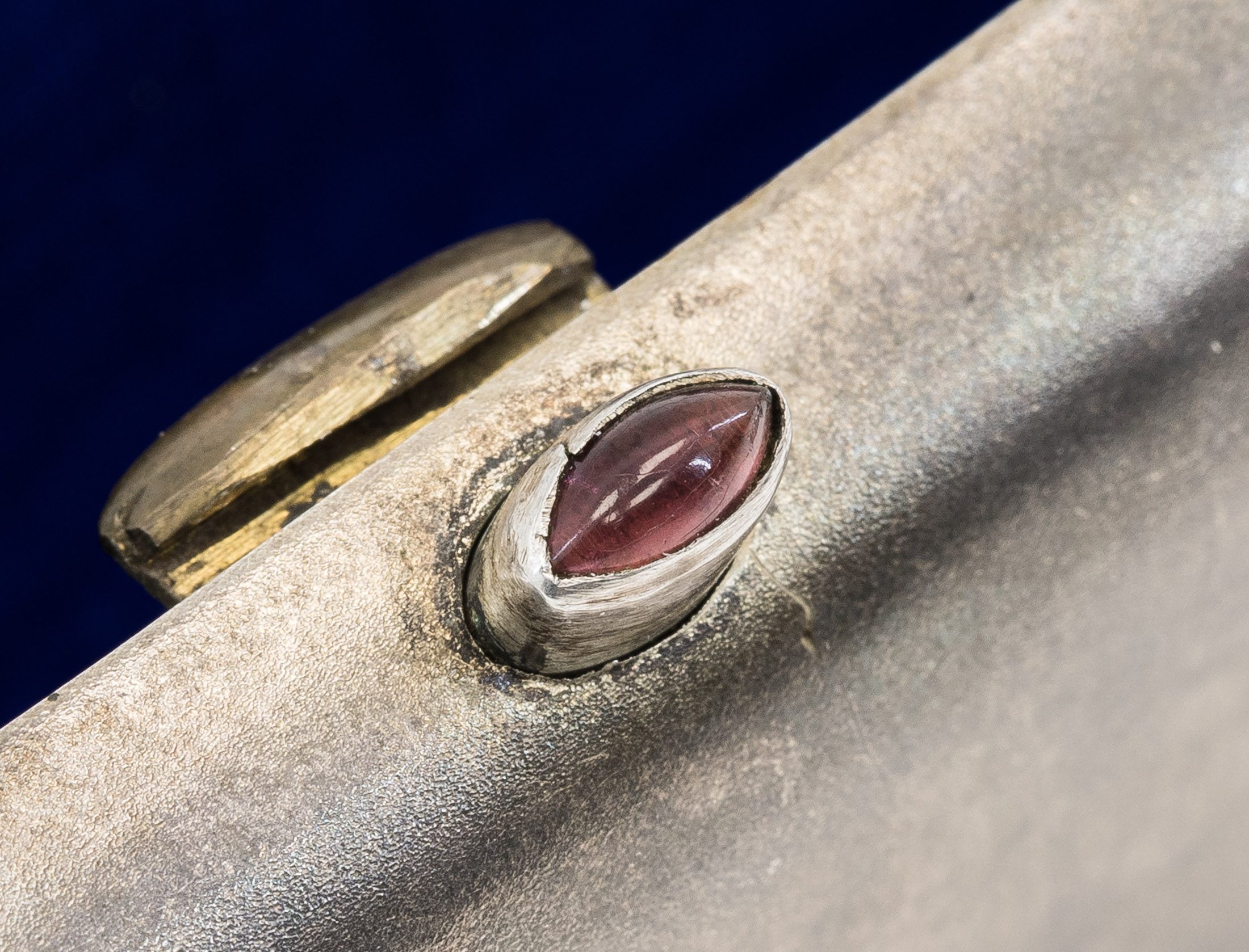 Серебро 84°, штамп, гравировка; серебряная цепочка; камень, огранка кабошон, глухая кастовая оправа; ткань.