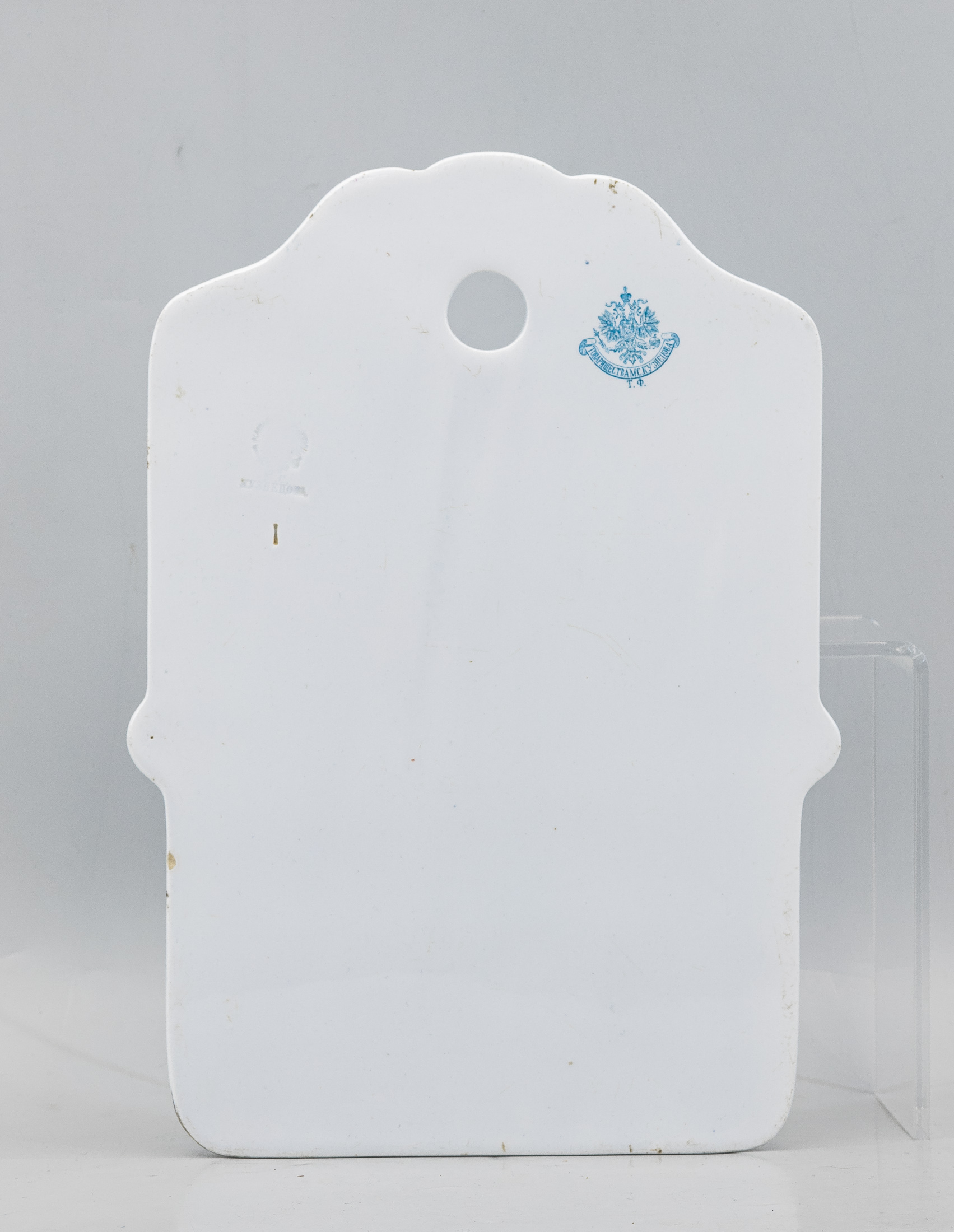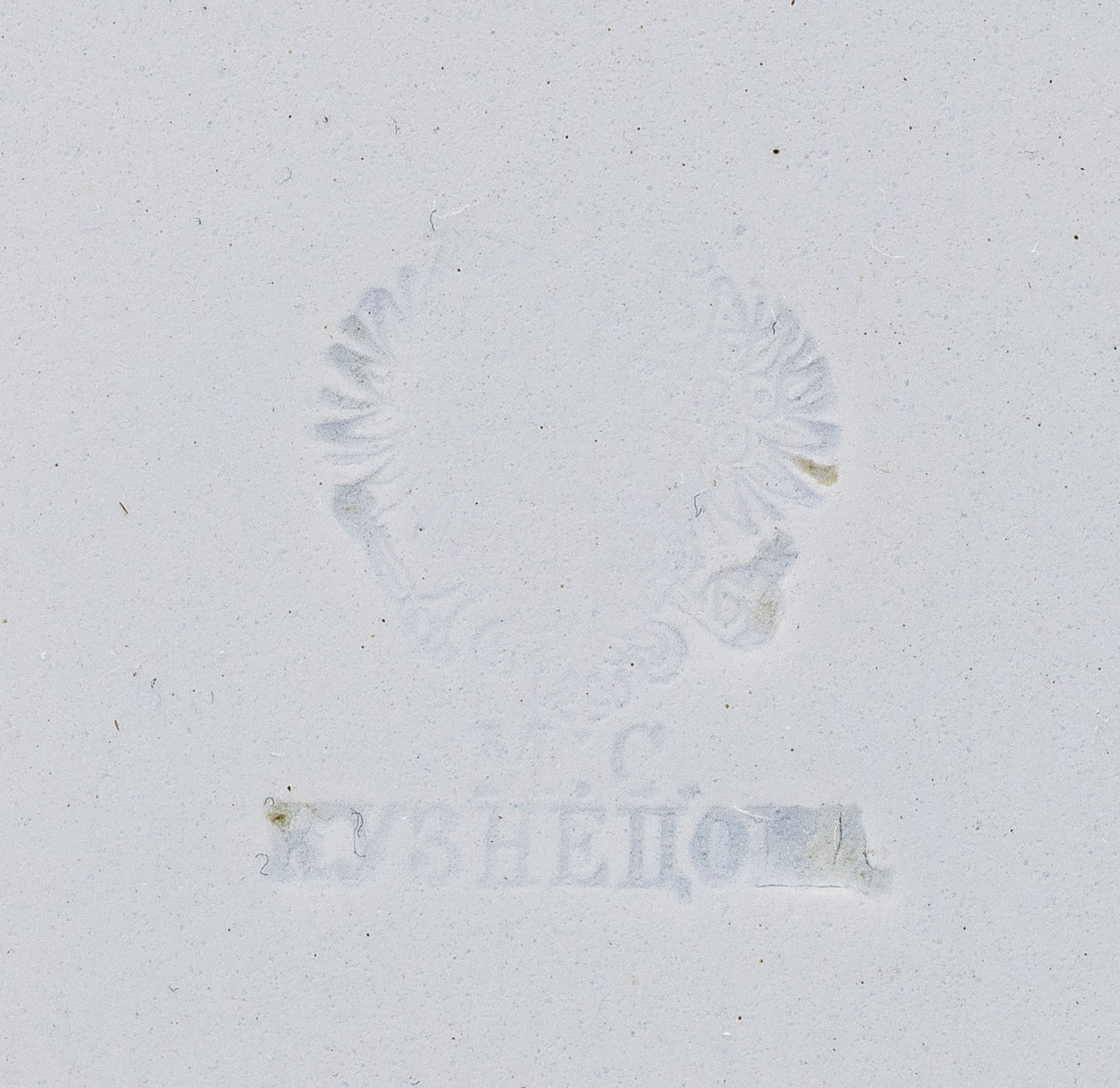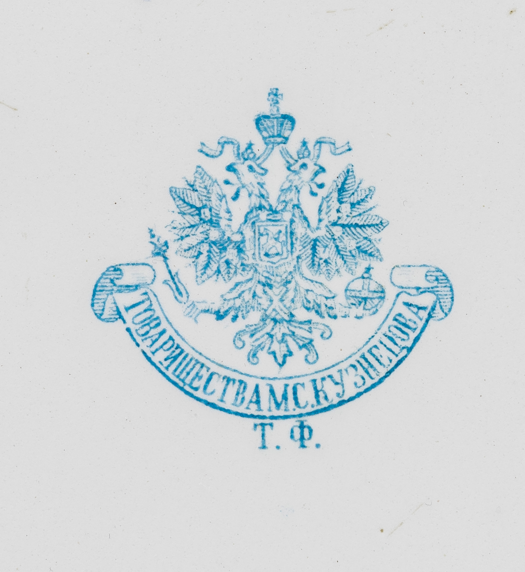 Марки на ножке: 1) «Товарищества М.С. Кузнецова» на ленте и «Т.Ф.» под изображением двуглавого орла со скипетром и державой (назглазурная печать синим); 2) изображение двуглавого орла со скипетром и державой и надпись «М.С. Кузнецова» (в тесте); 3) номер «1» (в тесте).