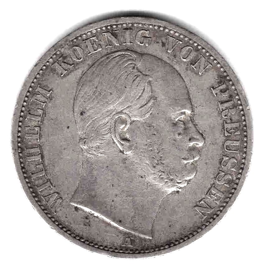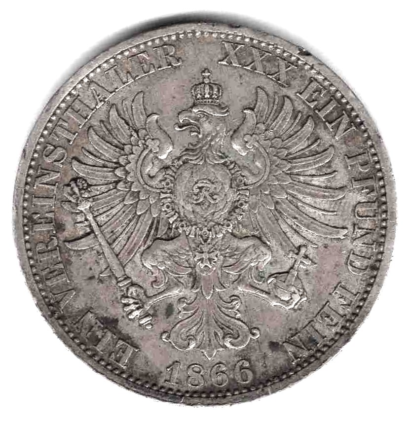 1 союзный талер 1866 года. Германия. Пруссия. Вильгельм I. Победа в Австро-прусско-итальянской войне. Серебро 18,54 г. Без венка на голове. Редкий!