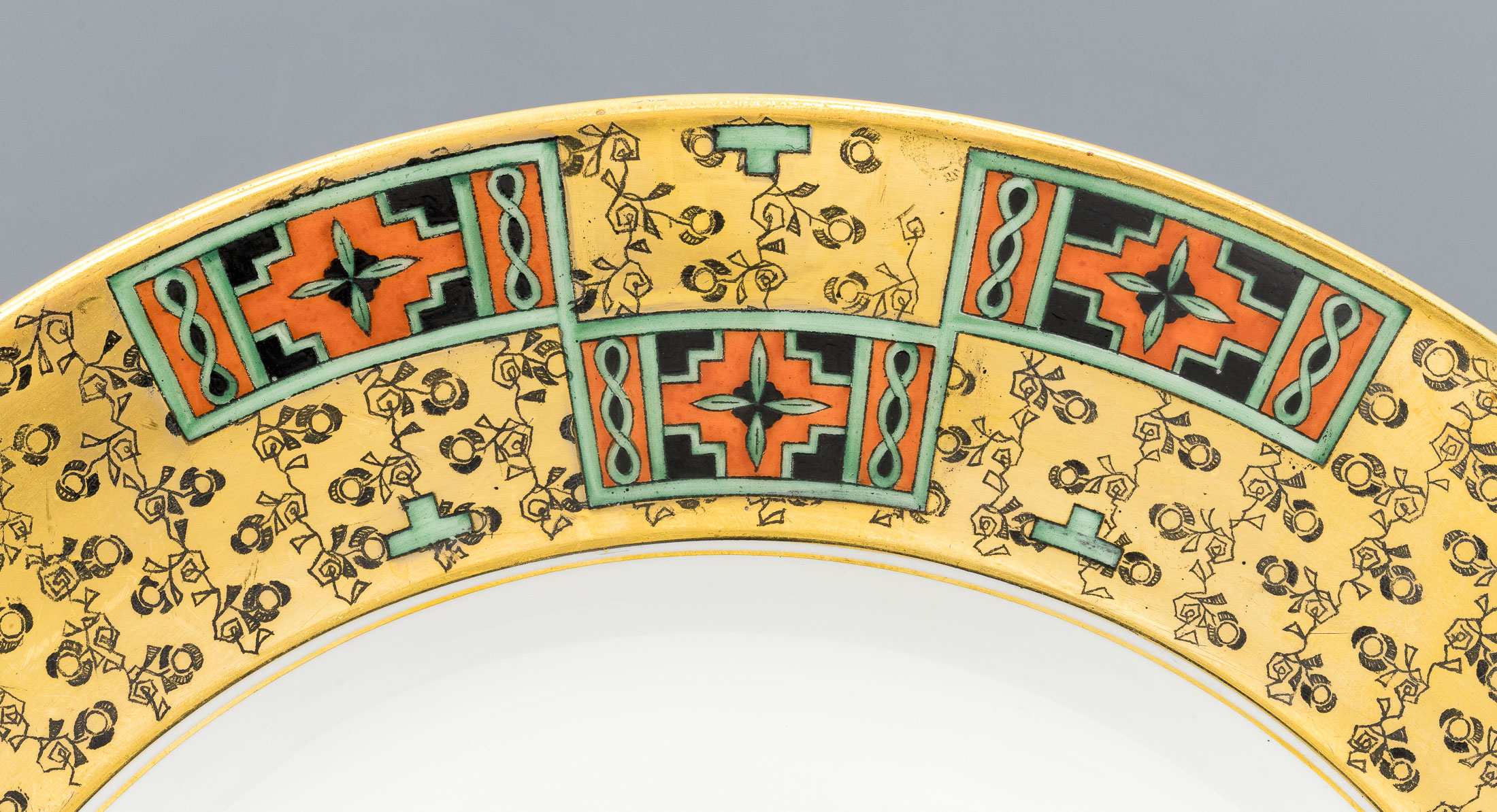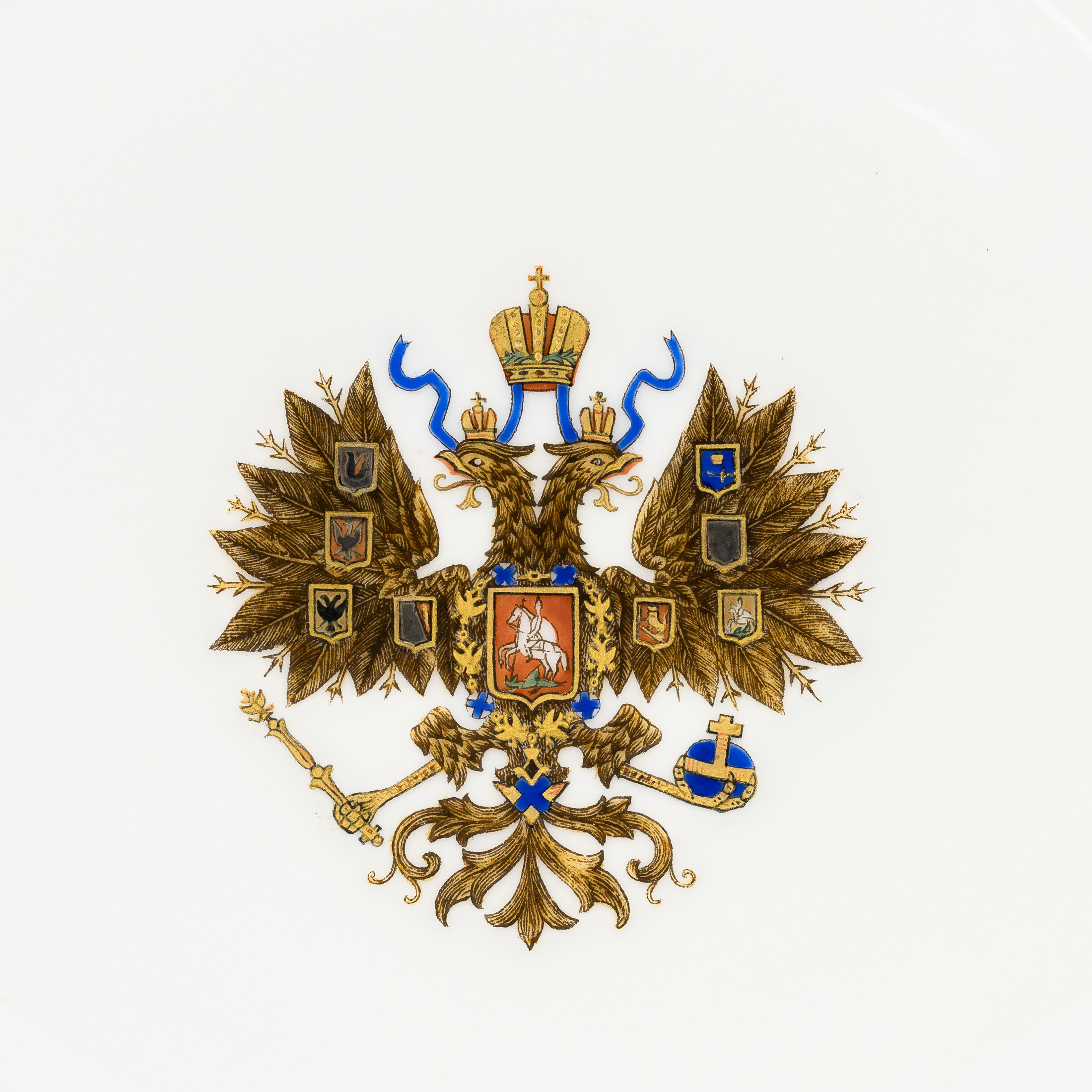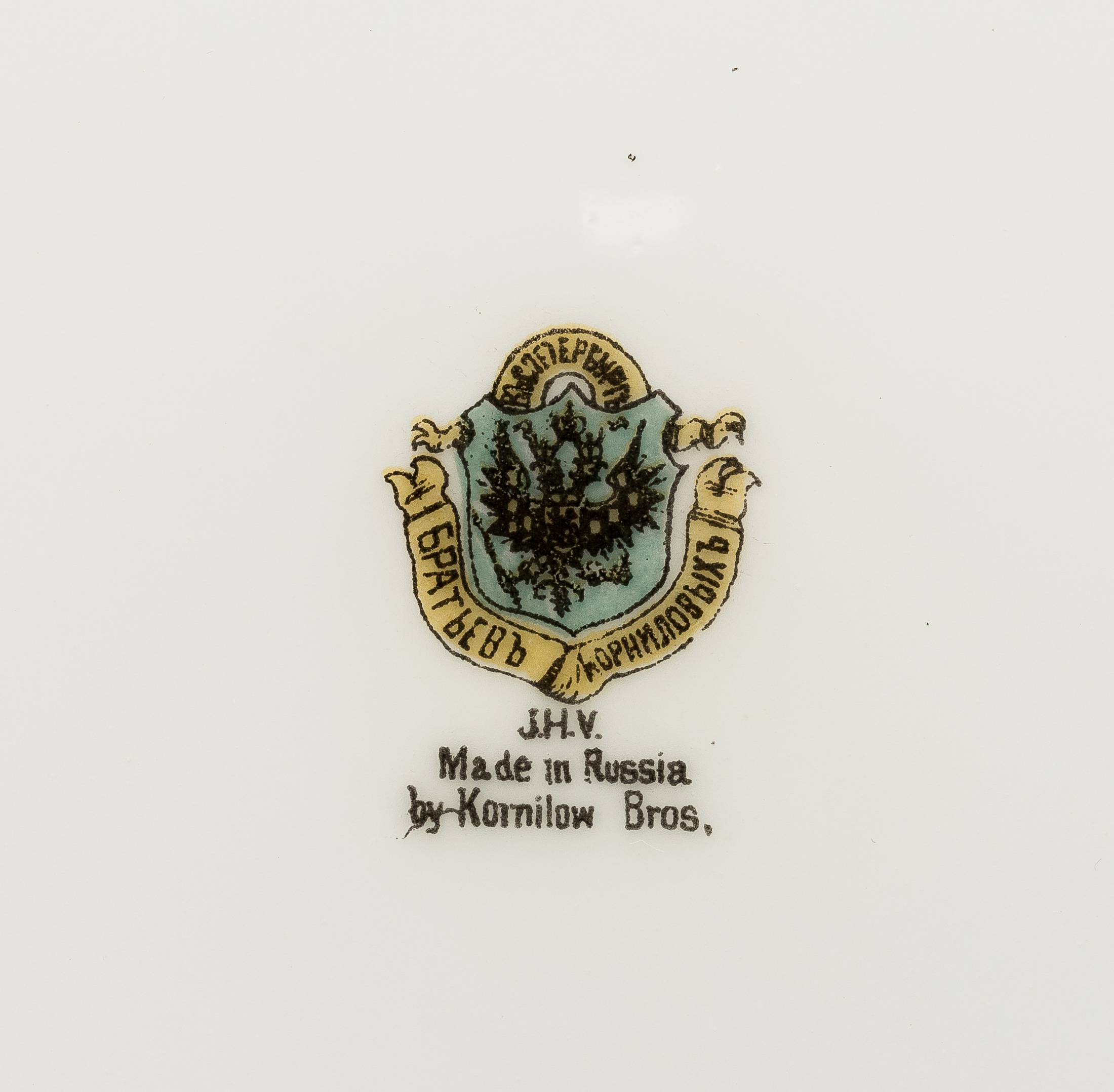 Марки: 1) надглазурная с голубым щитком и двуглавым орлом (1884-1918 гг.), ниже J.H.V. Made in Russia by Kornilov Bros; 2) «348.» от руки красным