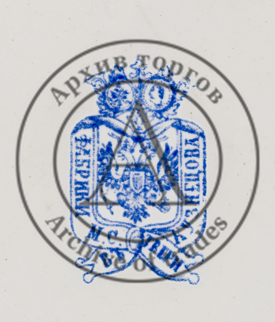 Марки: 1) герб с имперским двуглавым орлом, окруженный лентами с надписью «ФАБРИКИ М.С. КУЗНЕЦОВА ВЪ ТВЕРИ» (печать надглазурно синим); 2-3) в тесте «двуглавый орёл», под ним «М.С. // КУЗНЕЦОВА», «16».