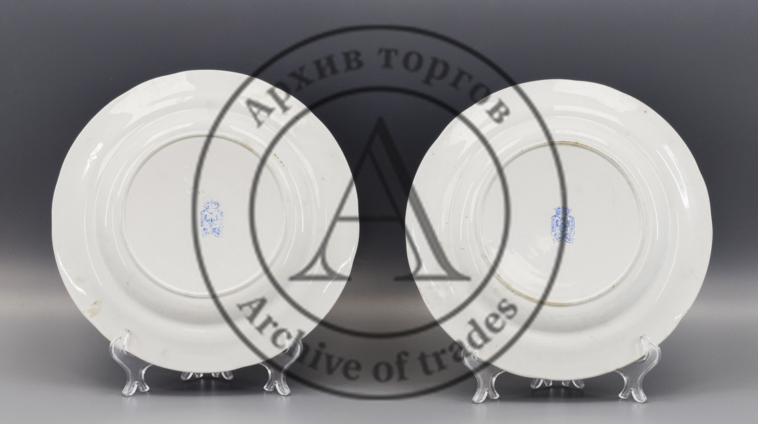 Сохранность: 1-я тарелка: скол и два скольчика на борте, потертости крытья, загрязнения, царапинки. 2-я тарелка: царапинки, загрязнения, потертости.