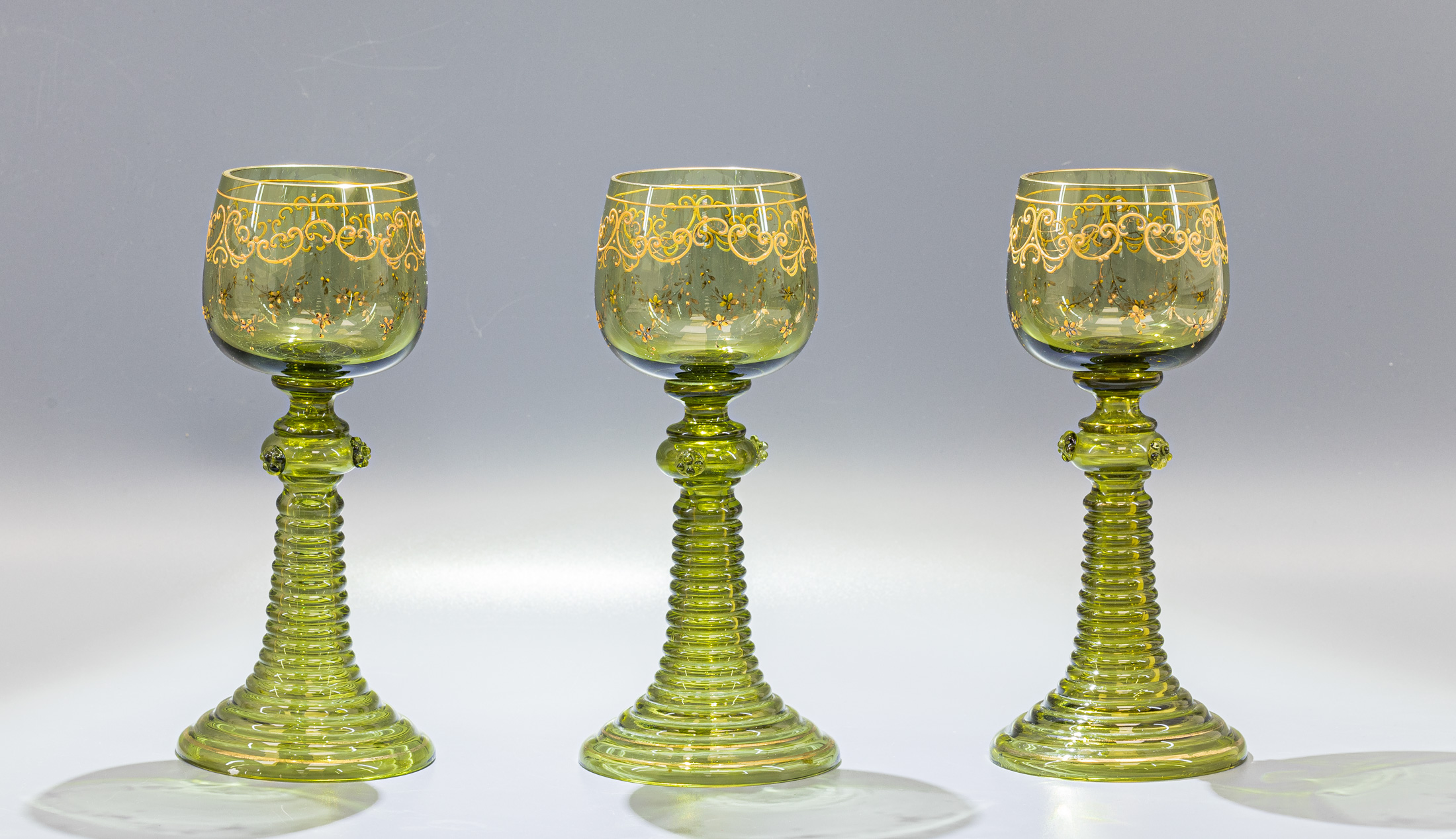 Три бокала-рёмера зелёного цвета с цветочным декором