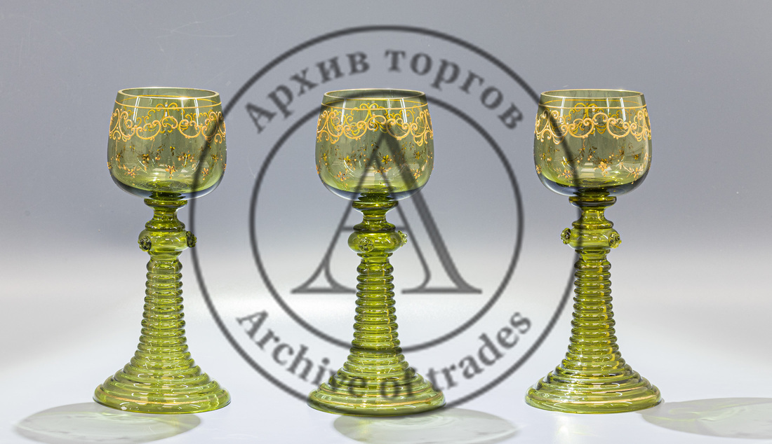 Зелёное стекло, выдувание, гутная техника, эмали, золочение.