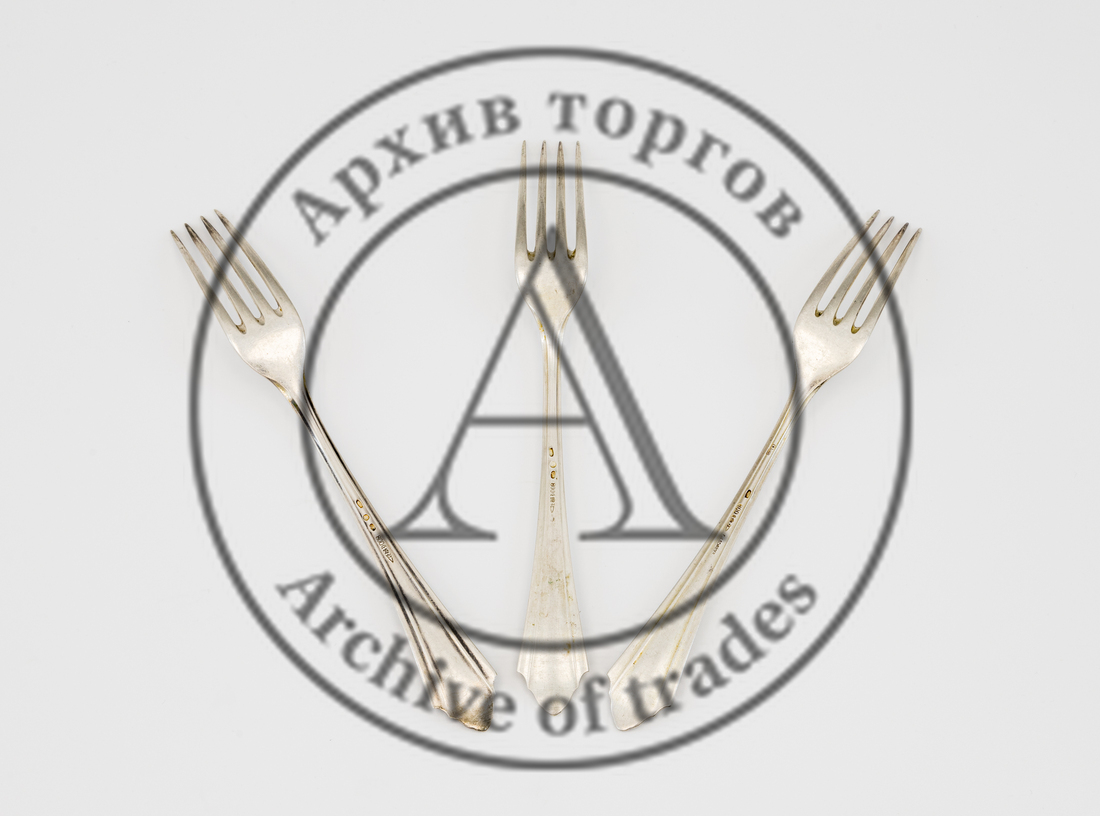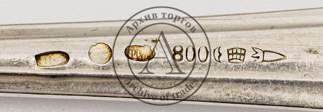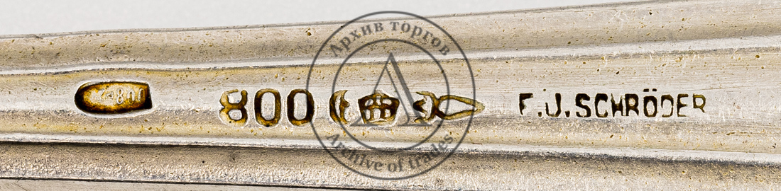 Клейма: 1-2) «800» (обозначение пробы) и «полумесяц и корона» (немецкое клеймо пробы серебра); 3) «факел» (клеймо фирмы «Bremer Silberwaren-Fabrik»); на одной вилке 4) клеймо мастера «F.J. SCHRÖDER»;