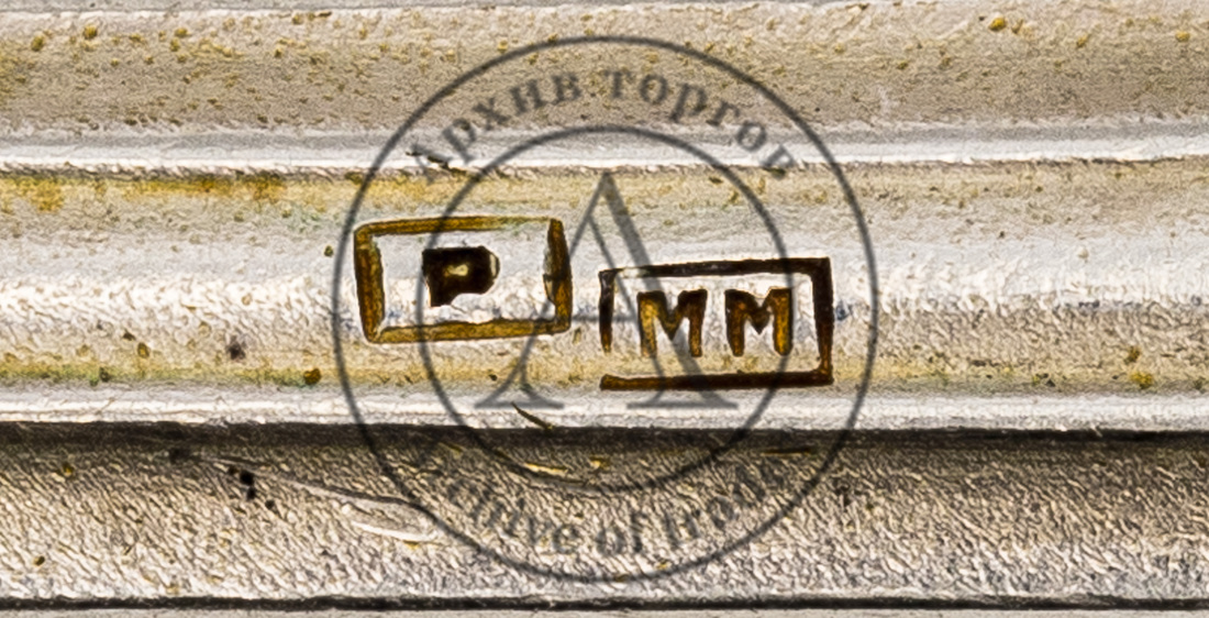 клейма перепробации советского периода: 5) «голова рабочего, повернутая вправо, с молотком, под ним литера «Δ» («дельта») и обозначение пробы «800» в щитке в виде усеченного овала (обозначение заграничного изделия при клеймлении на таможне с указанием пробы, 1927–1954 гг.); 6) МЮФ» в овальном щитке (Московская ювелирная фабрика; 7) «Р» в прямоугольном щитке; 8) «ММ» в прямоугольном щитке; 9) нечитаемое клеймо в круглом щитке.