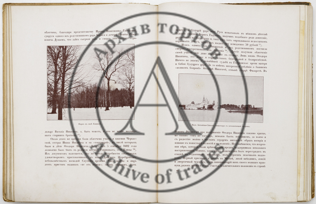 Издание Комитета для устройства празднования трехсотлетия царствования Дома Романовых. Заставки, концовки, заглавные буквы — академика Л.Е. Дмитриева-Кавказского; гелиогравюра — Р. Голике и А. Вильборга; клише — цинкографии «Унион»; цв. рис. — фотоцинкографии С.М. Прокудина-Горского.