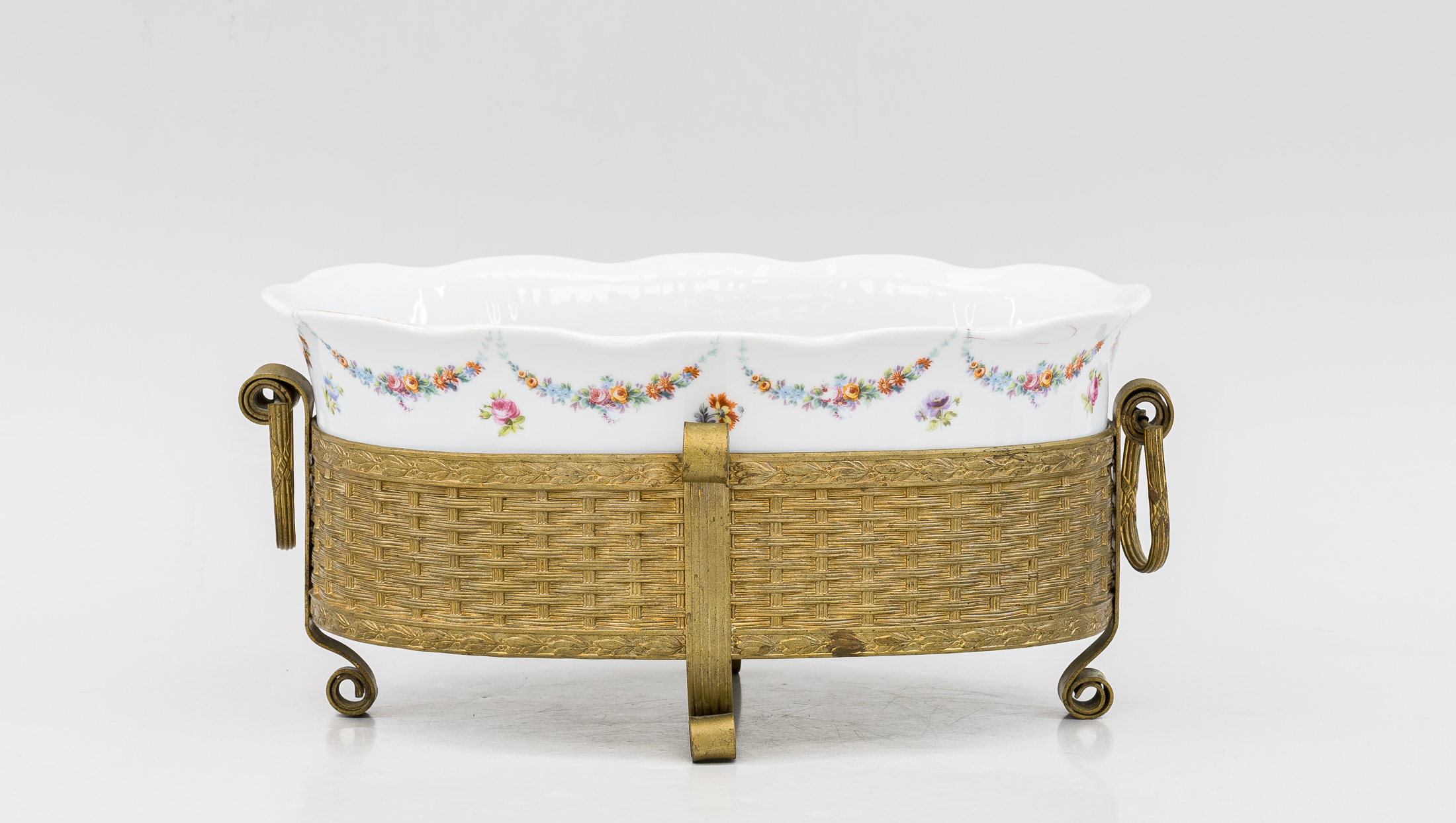 Фарфор, крытье, полихромная роспись, золочение; бронза, литье, чеканка.