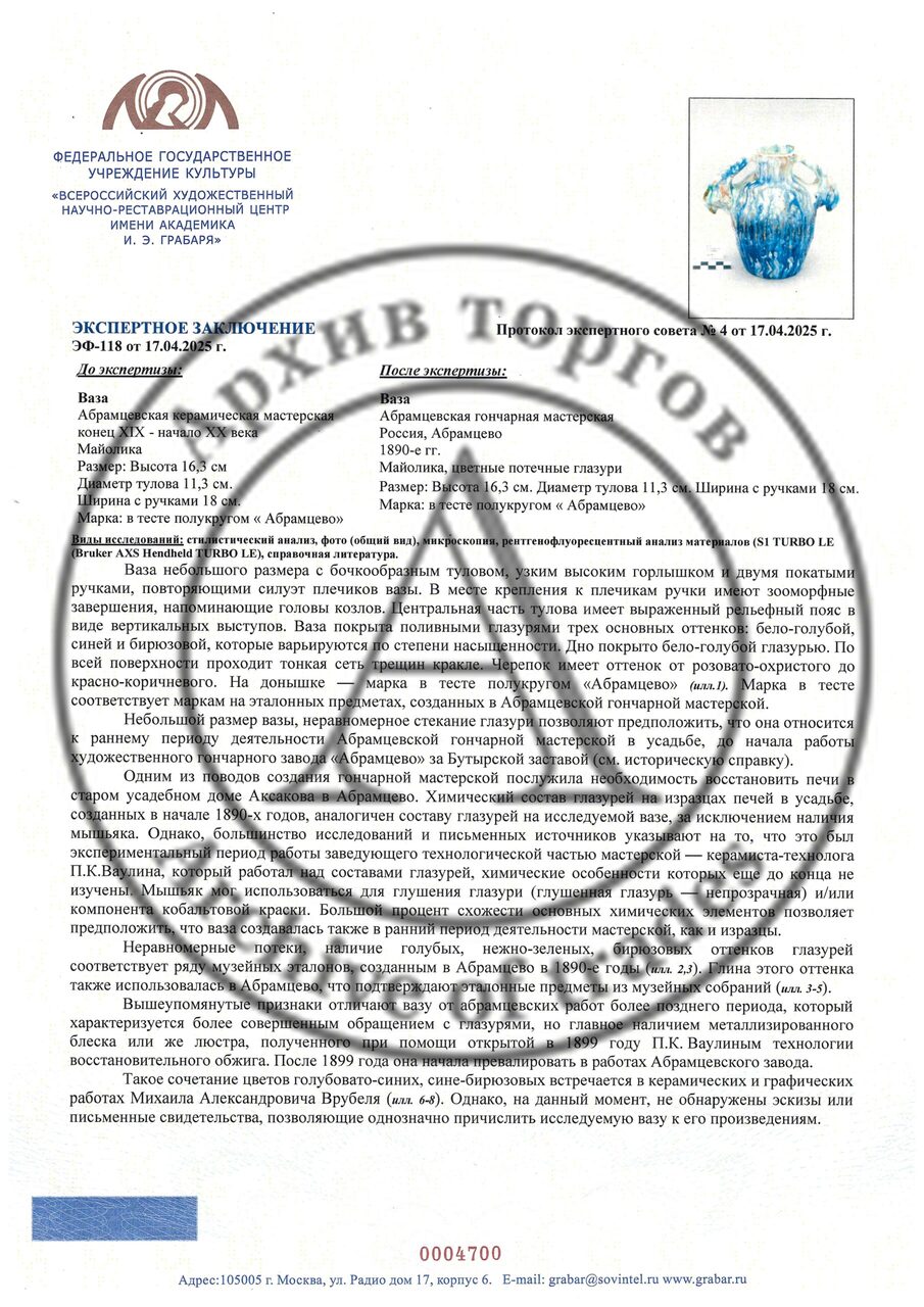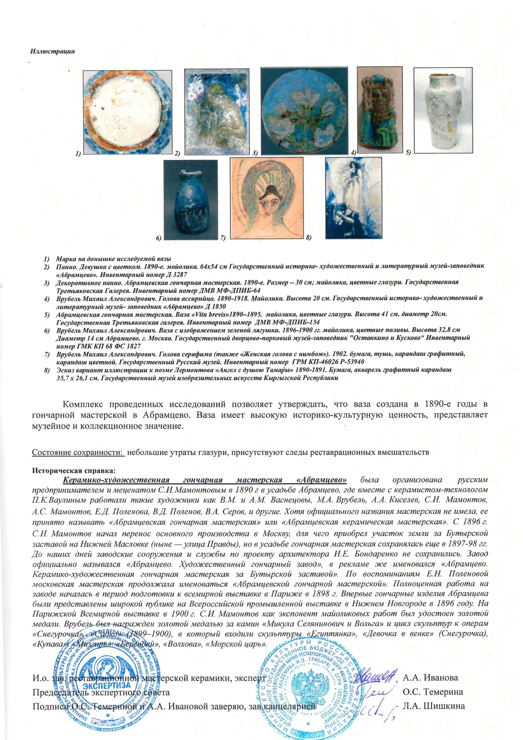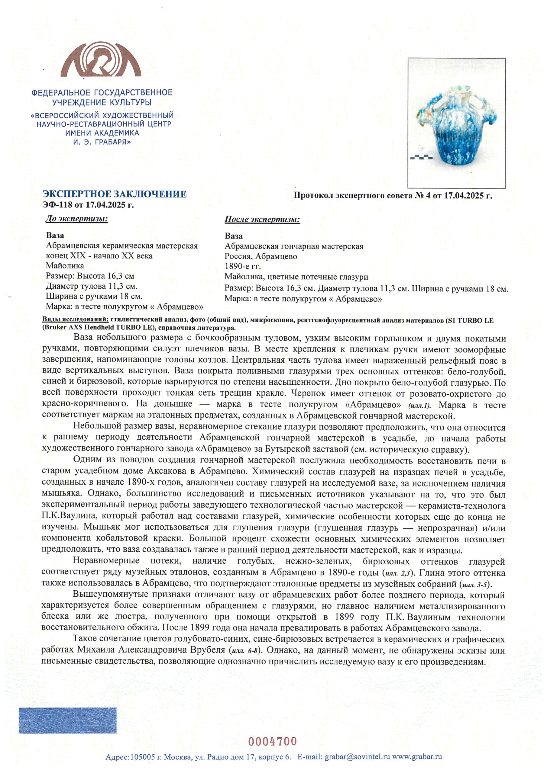 Экспертное заключение ВХНРЦ им. Грабаря № ЭФ-118 от 17.04.2025 г. Эксперт и.о. зав. реставрационной мастерской керамики А.А. Иванова.