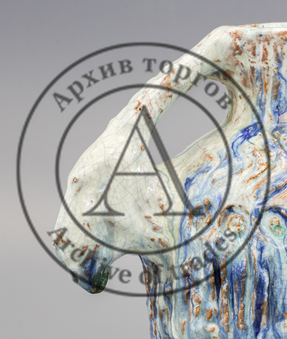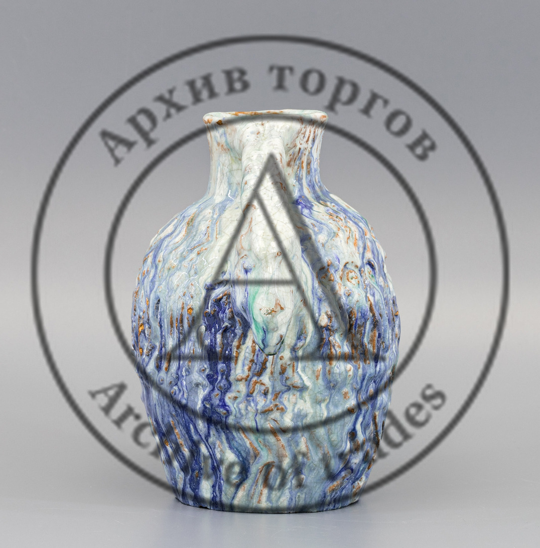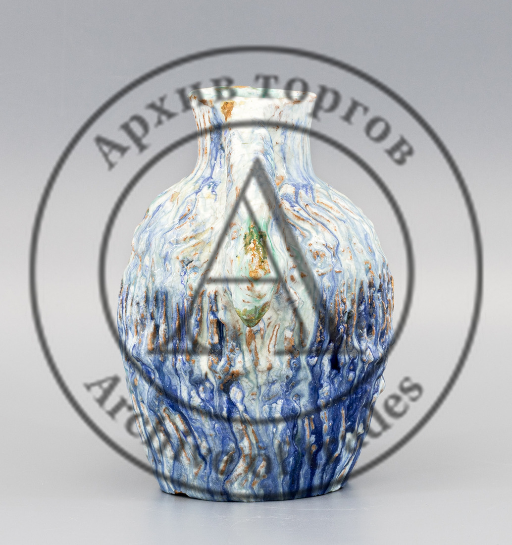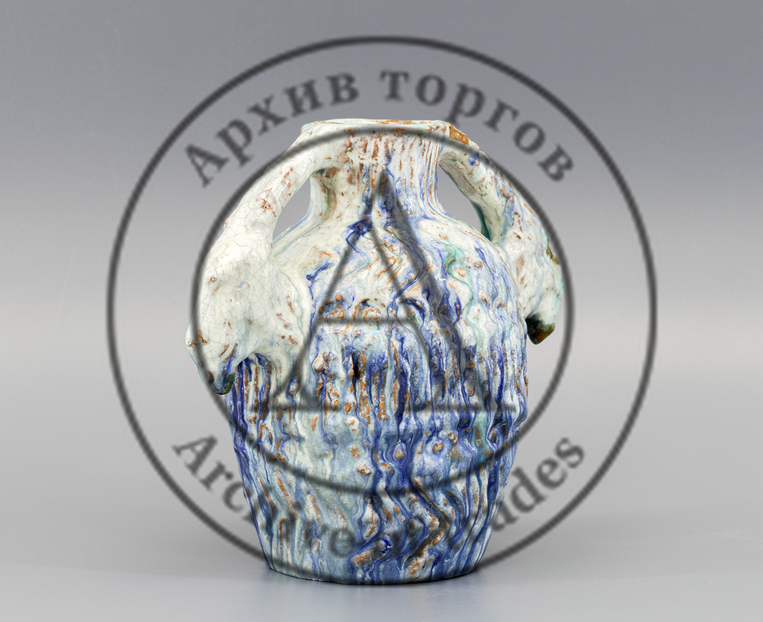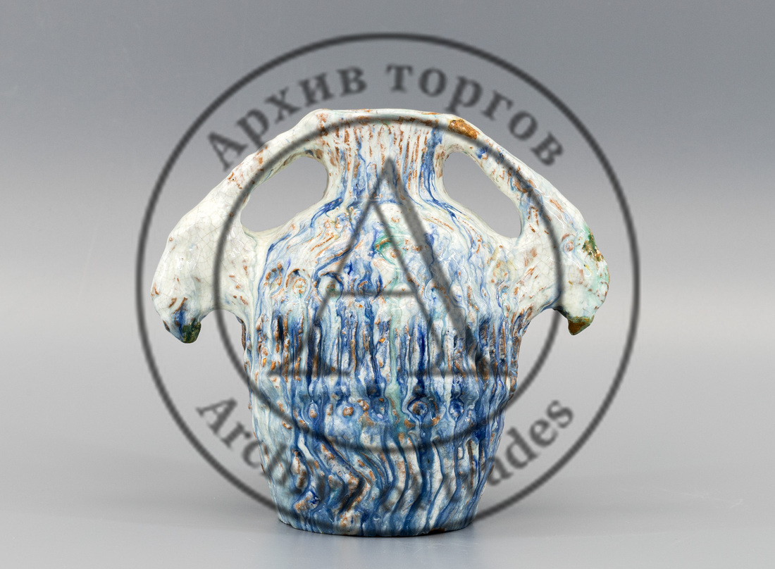 Ваза небольшого размера с бочкообразным туловом, декорированным рельефным поясом, узким высоким горлышком и двумя покатыми ручками. Ручки имеют зооморфные завершения, напоминающие головы козлов.