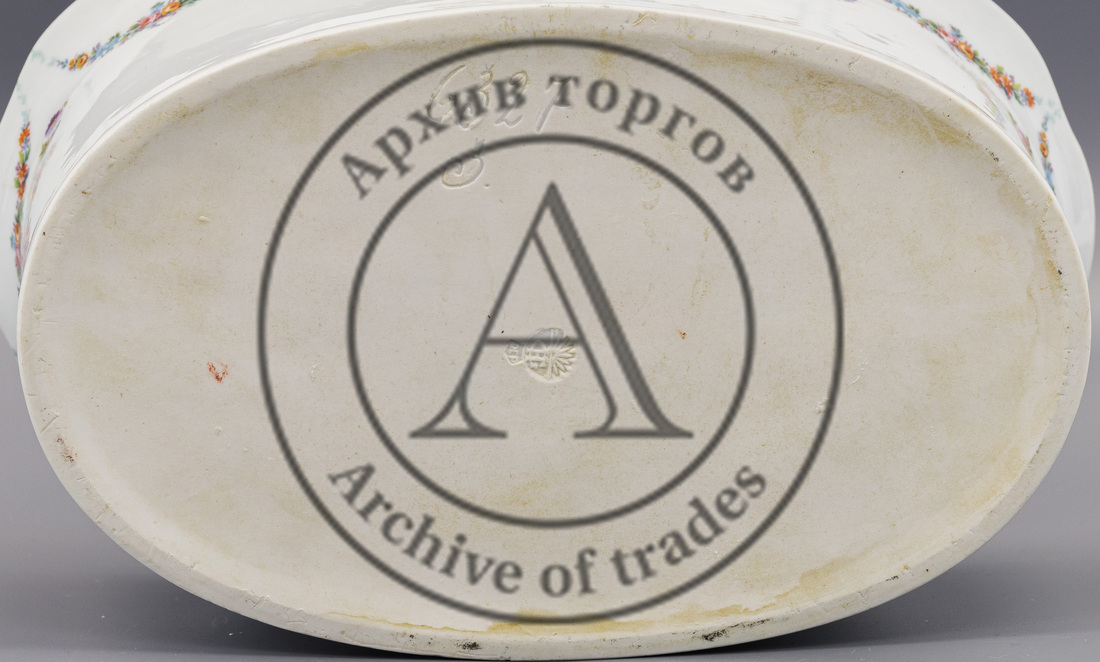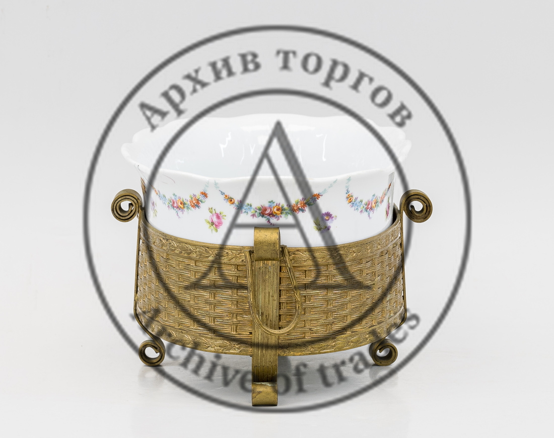Фарфор, глазурование, деколь, отводка золотом; латунная съемная подставка.